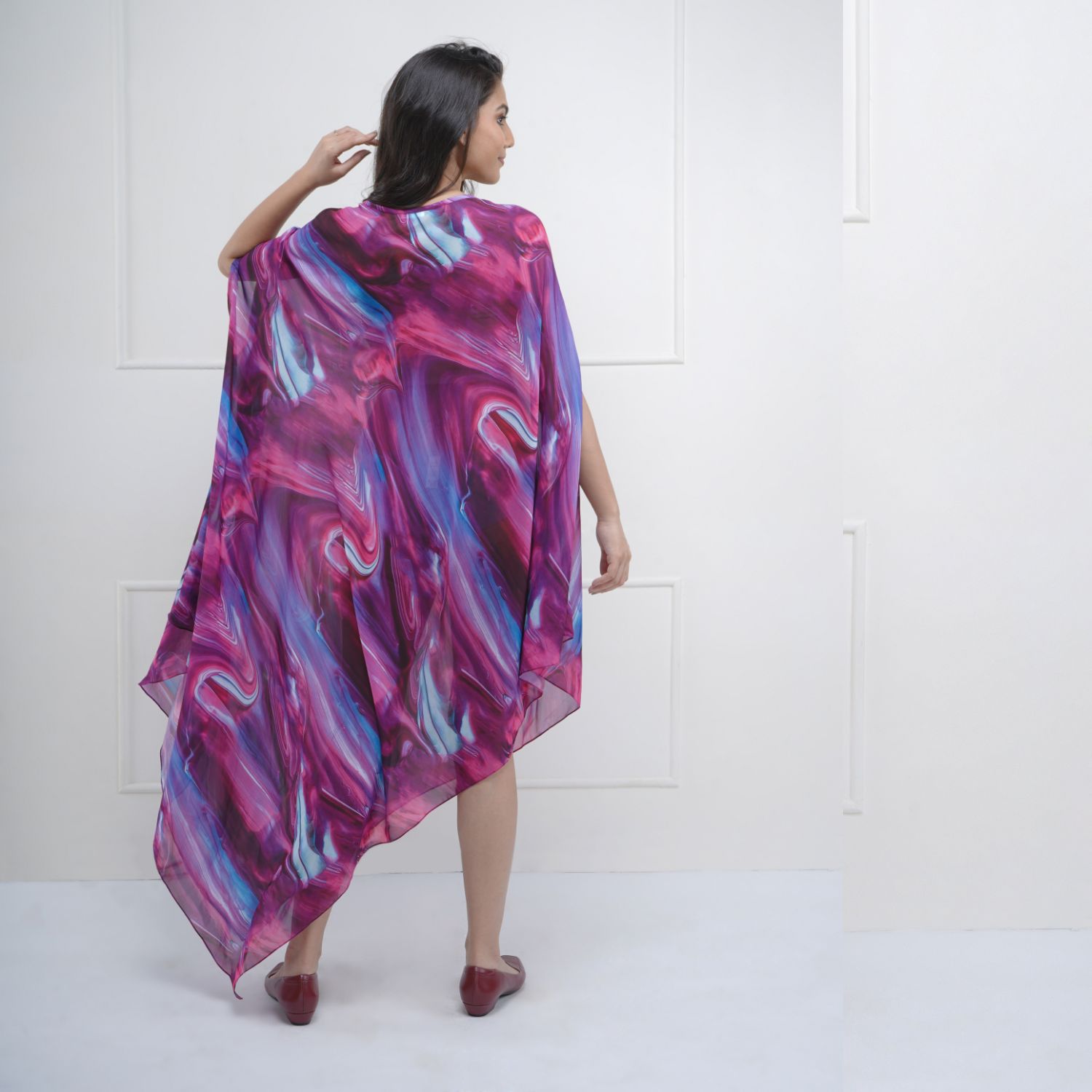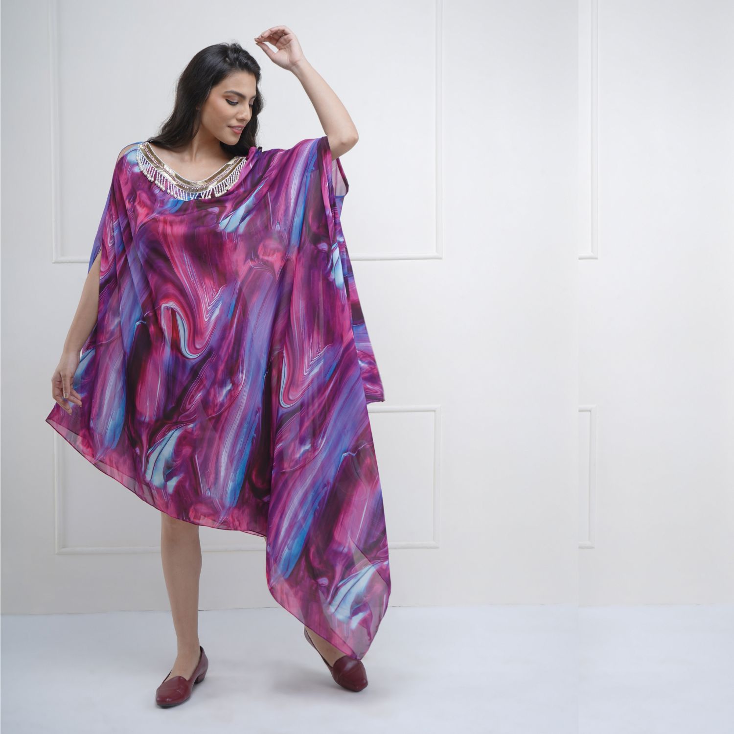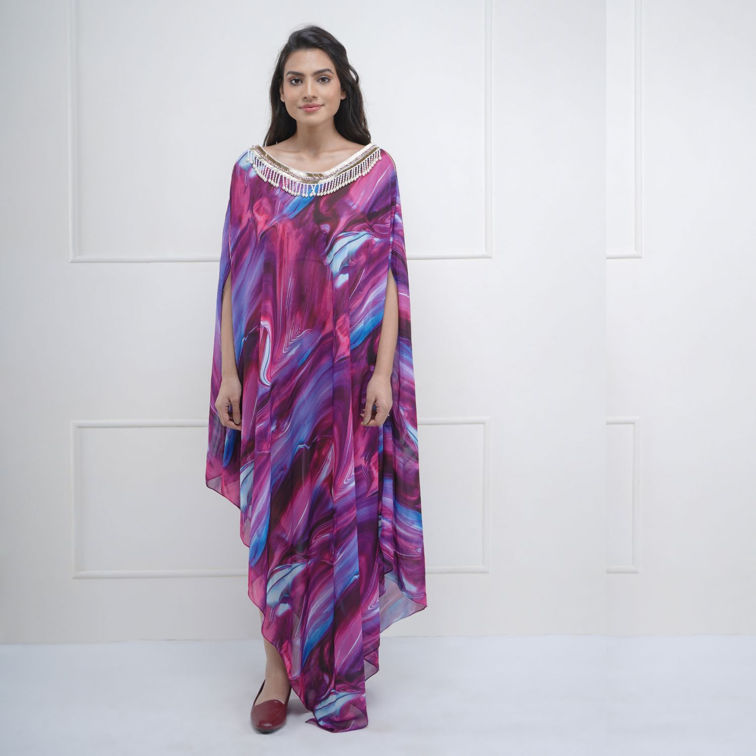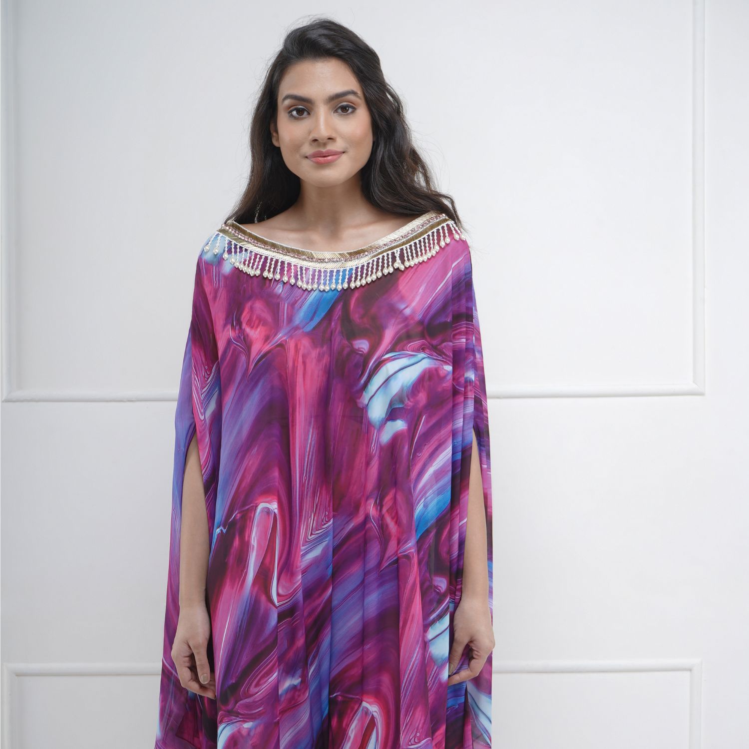 Indulge in the epitome of luxury with this multicolored abstract georgette kaftan. The captivating abstract print is adorned with exquisite stone and pearl embellishments, creating a glamorous look. The kaftan's asymmetric hem adds a touch of modernity and style.