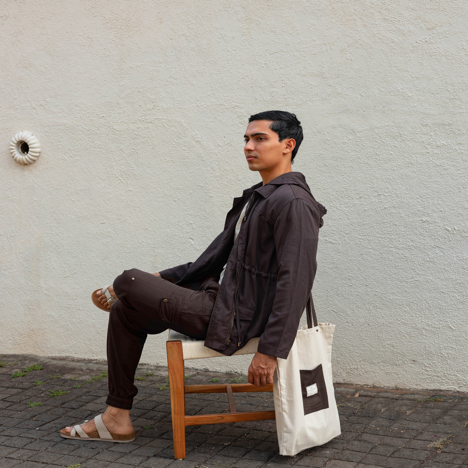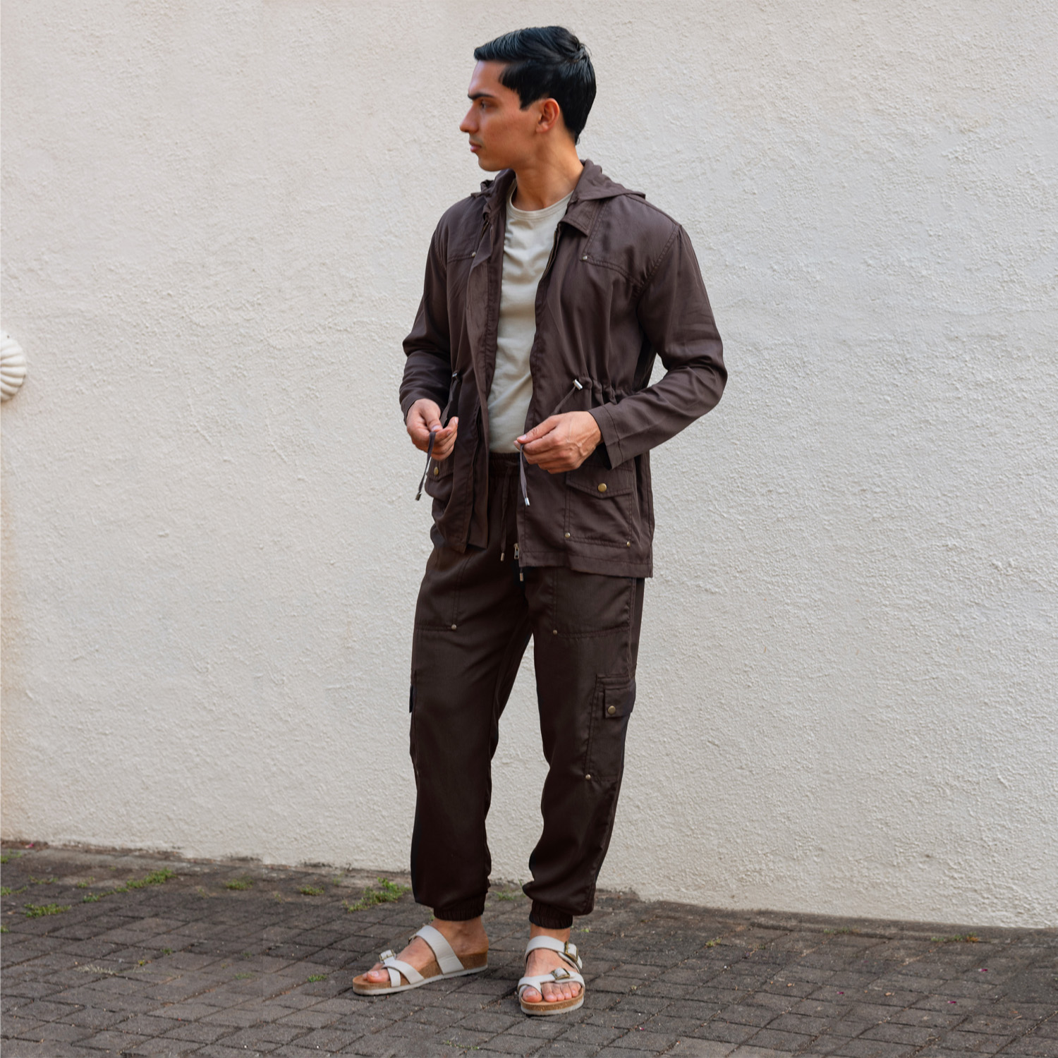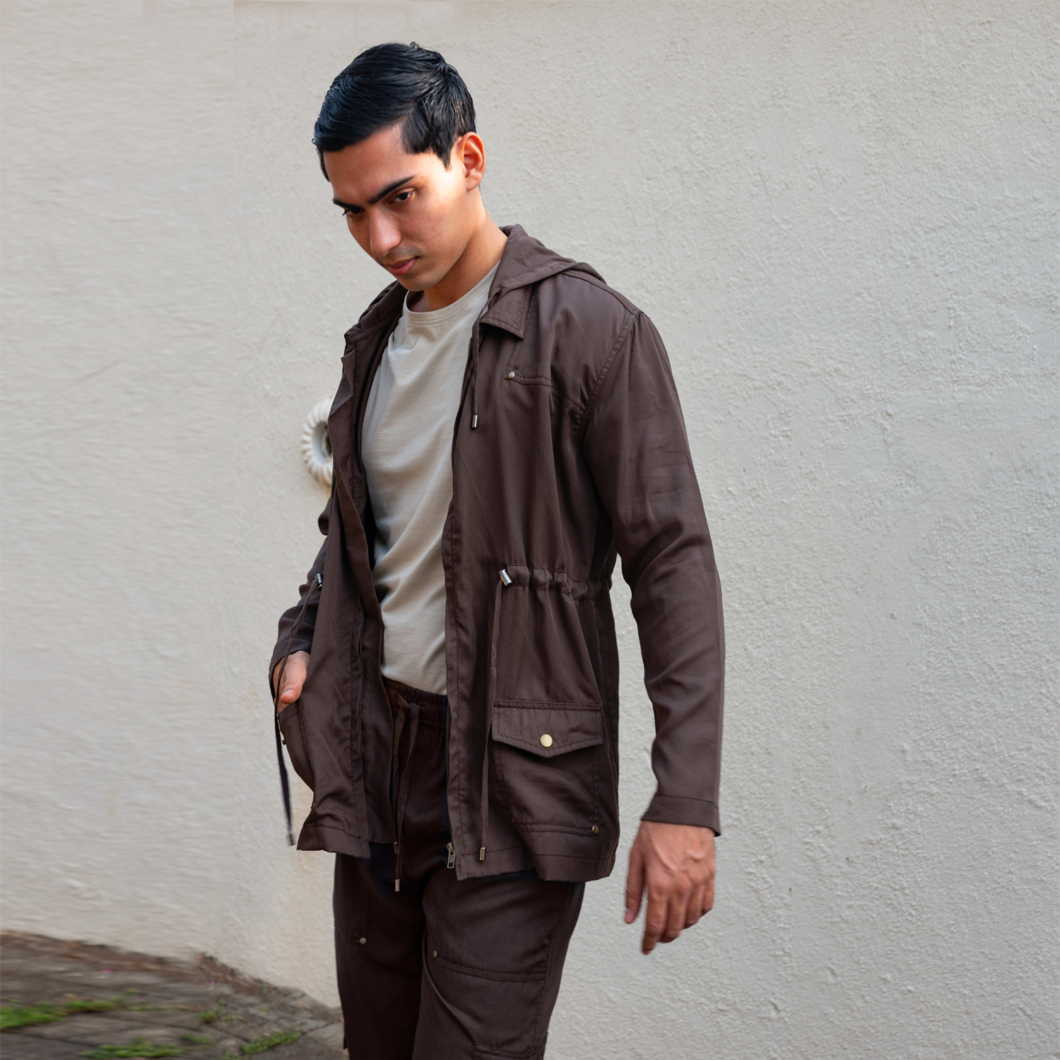 ₹ 6,000 (10% off)Crafted with tencel and recycled metal trims, this deep brown jacket features multiple pockets, a convenient hoodie and drawstring detailing at the waist. Style it with a classic white t-shirt, slim-fit jeans, and sturdy boots for a polished look.