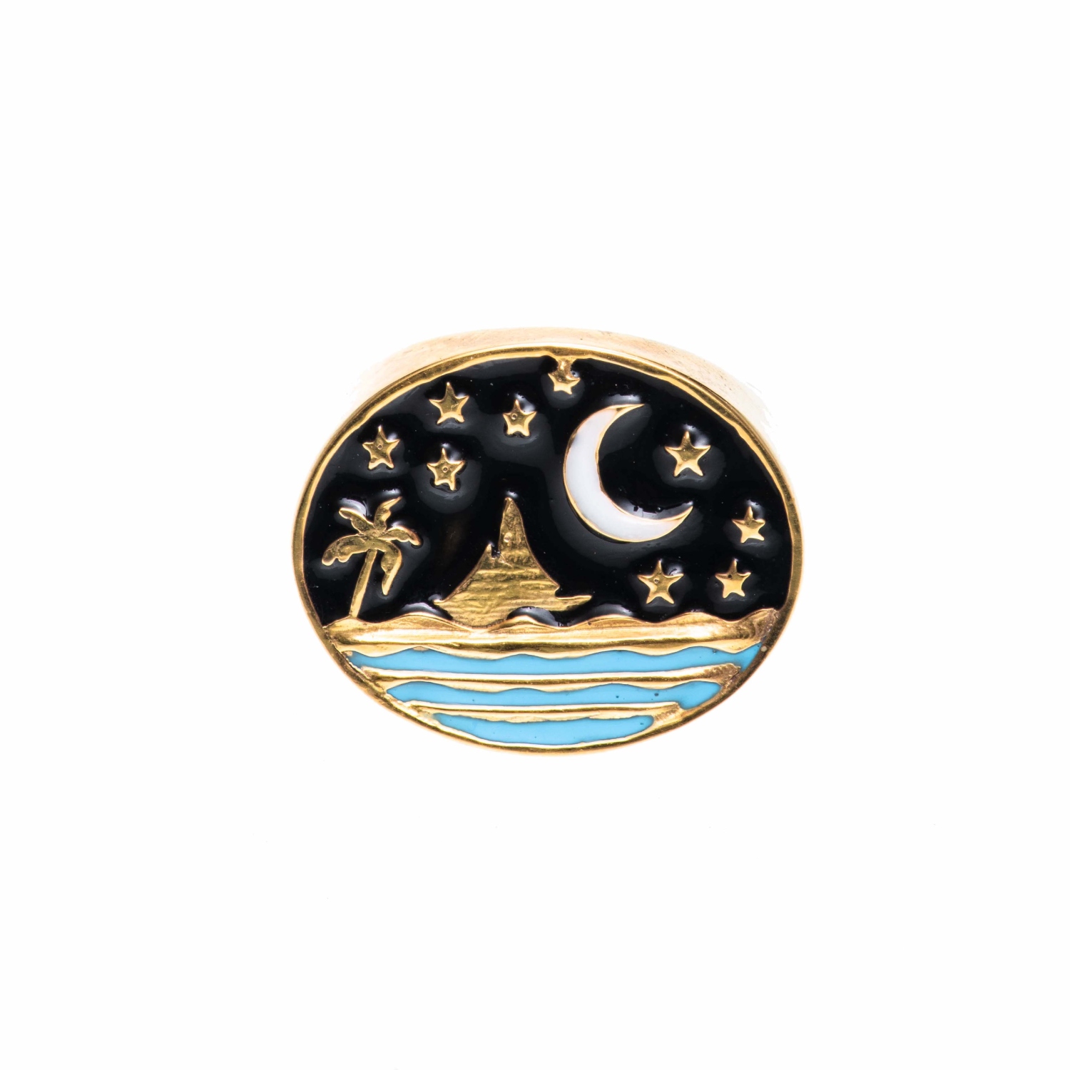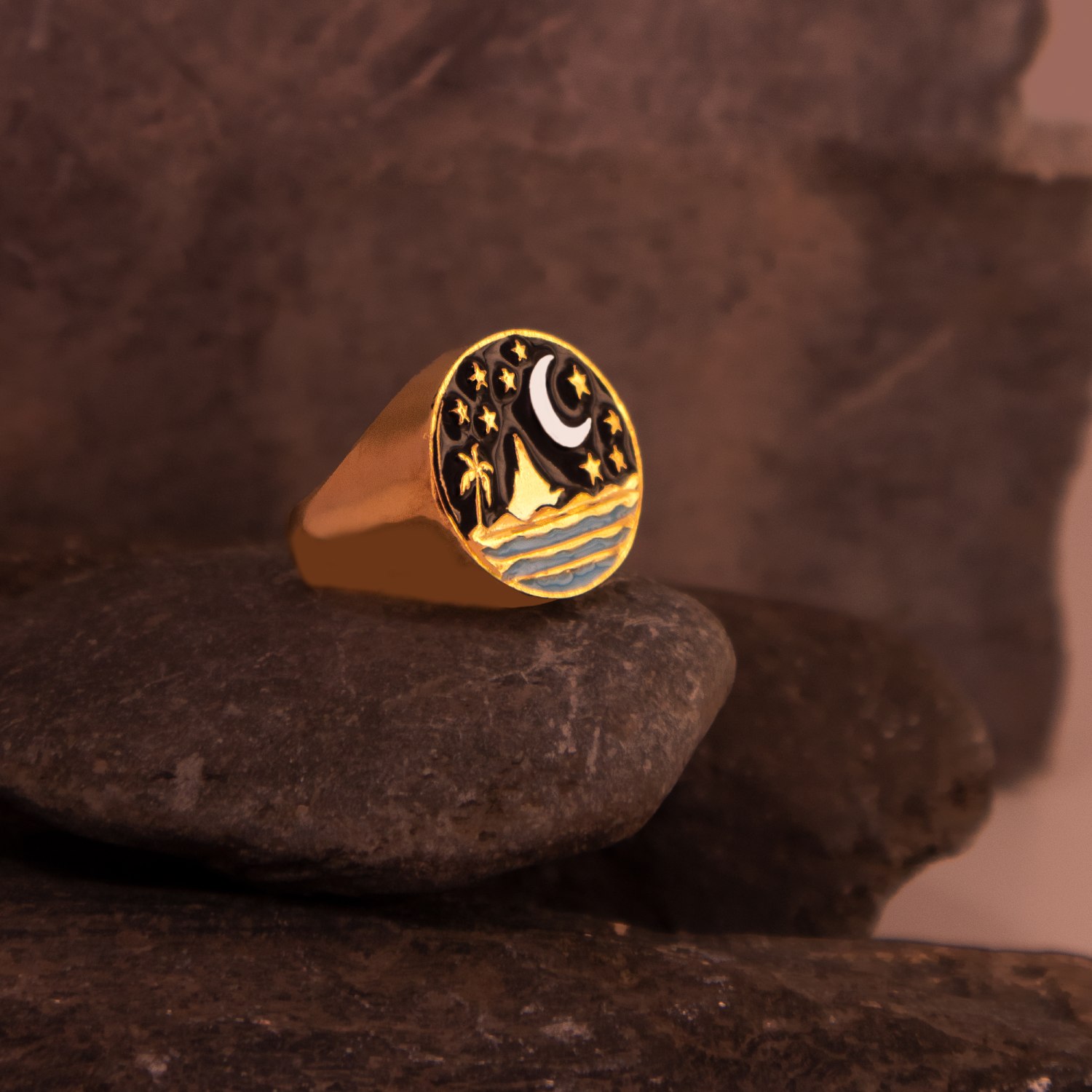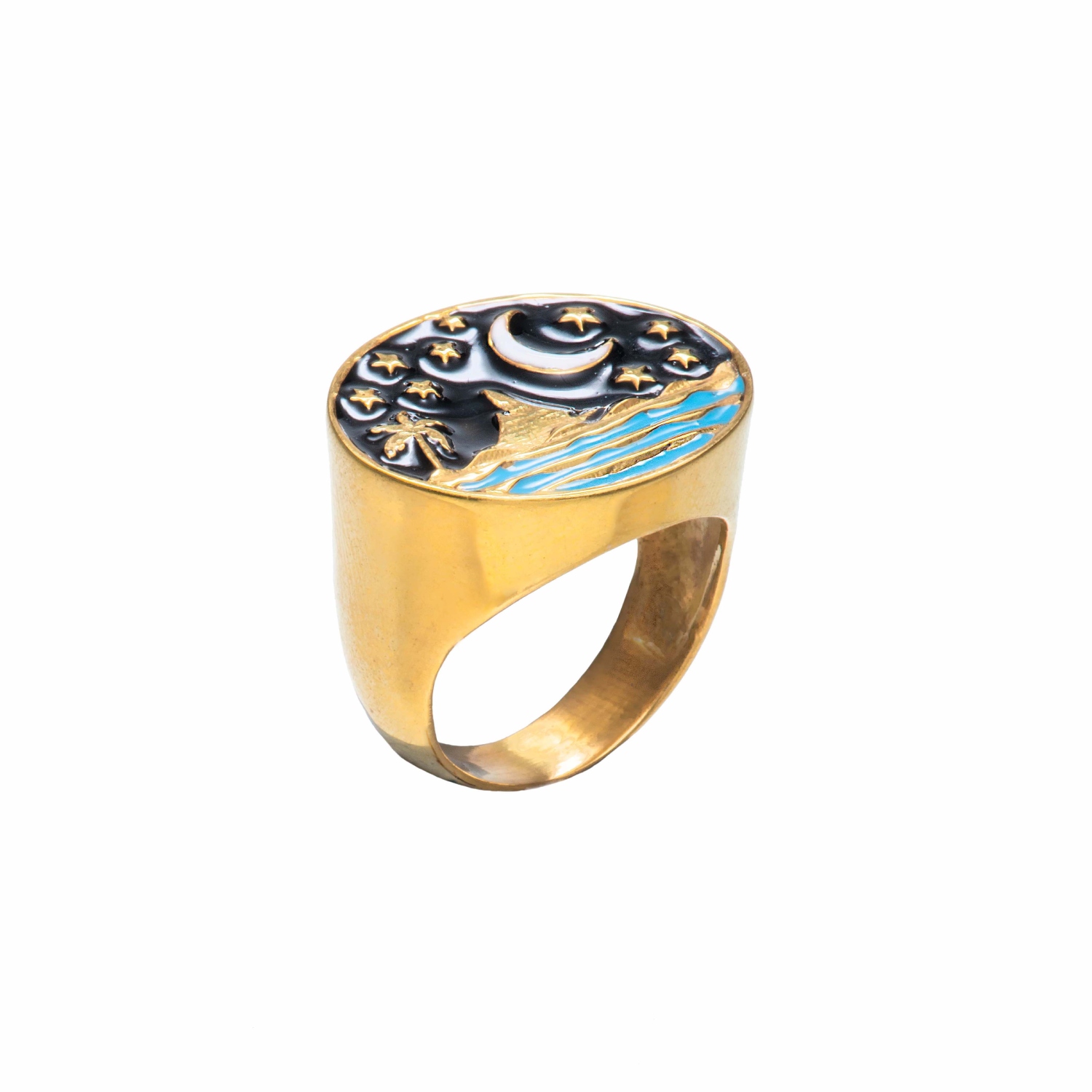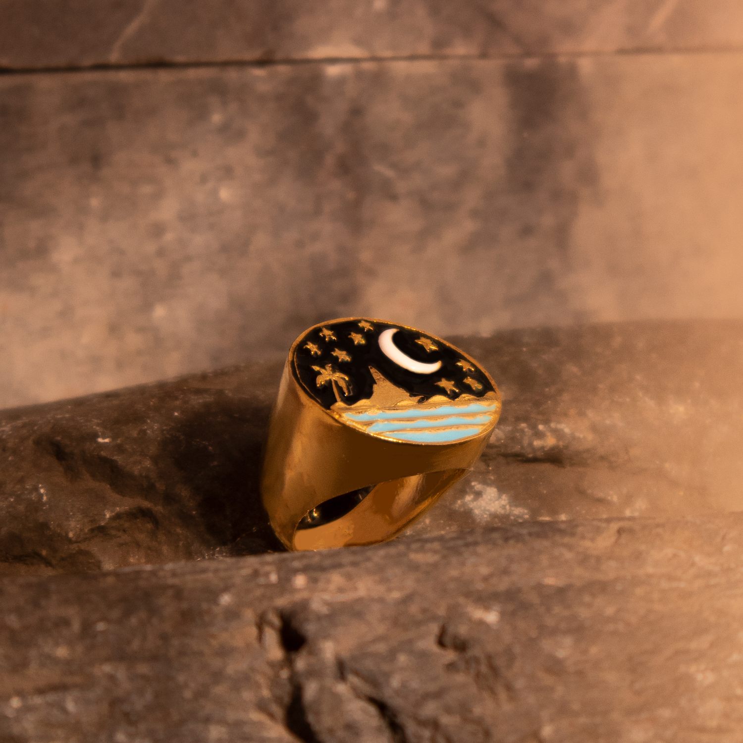 This ring is a beautiful accessory featuring a design that includes a moon, mountain, palm tree and stars set on a black base made of brass.