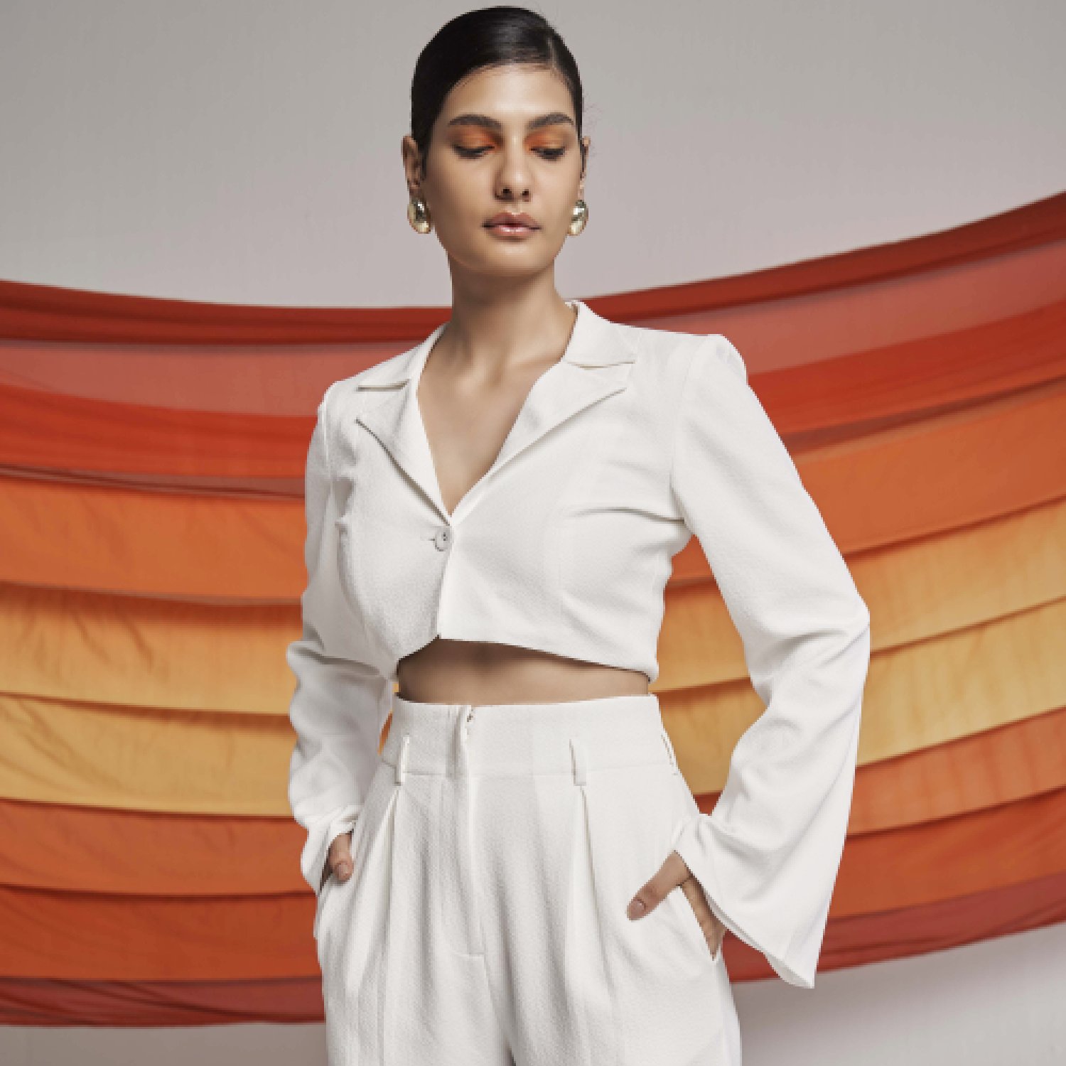 ₹ 14,500 (10% off)This co-ord set exudes effortless elegance and raw power. The self-fabric top features a button-up design with full bell sleeves and a collar, while the box-pleated trousers add a touch of femininity. This ivory statement outfit is perfect for the fall and winter seasons.