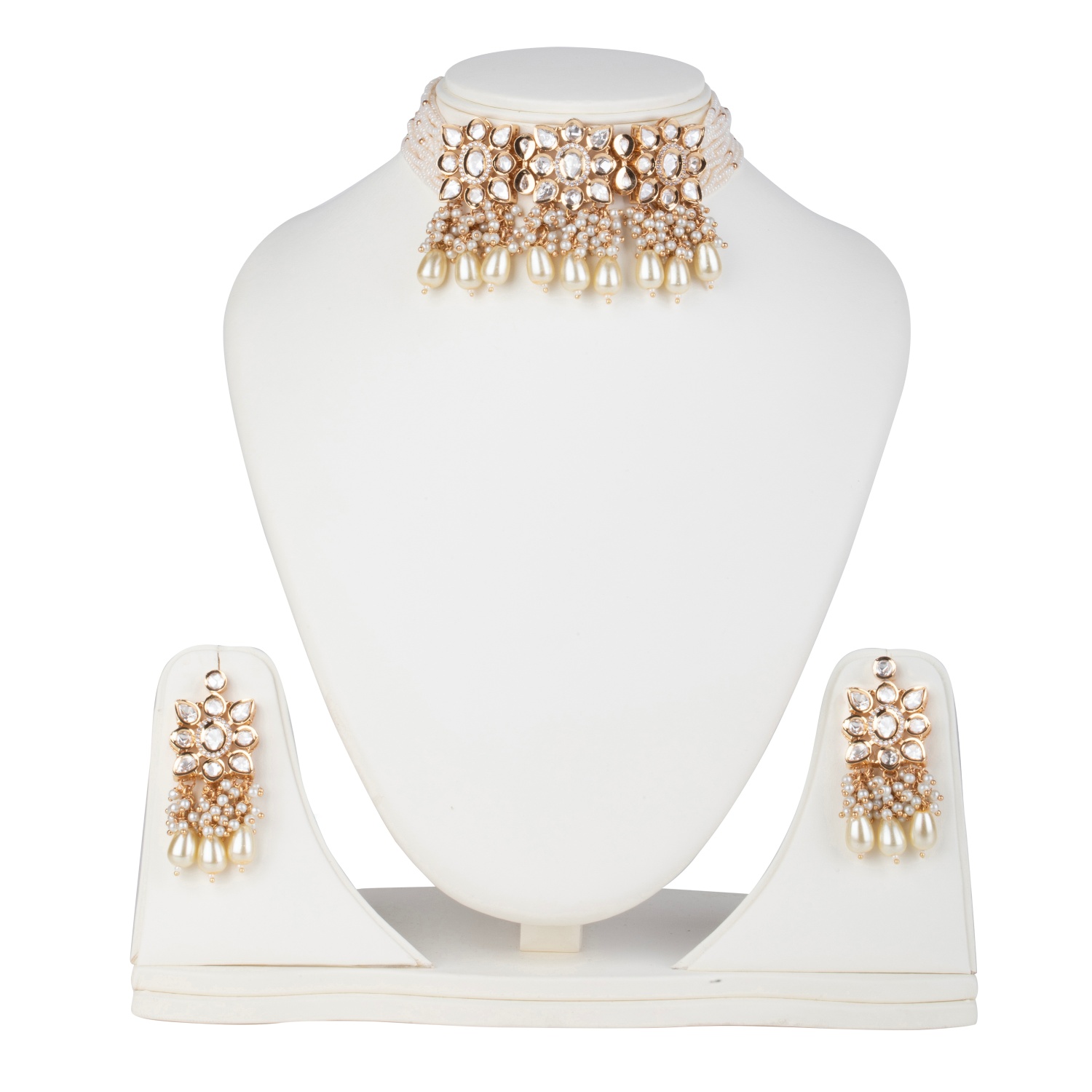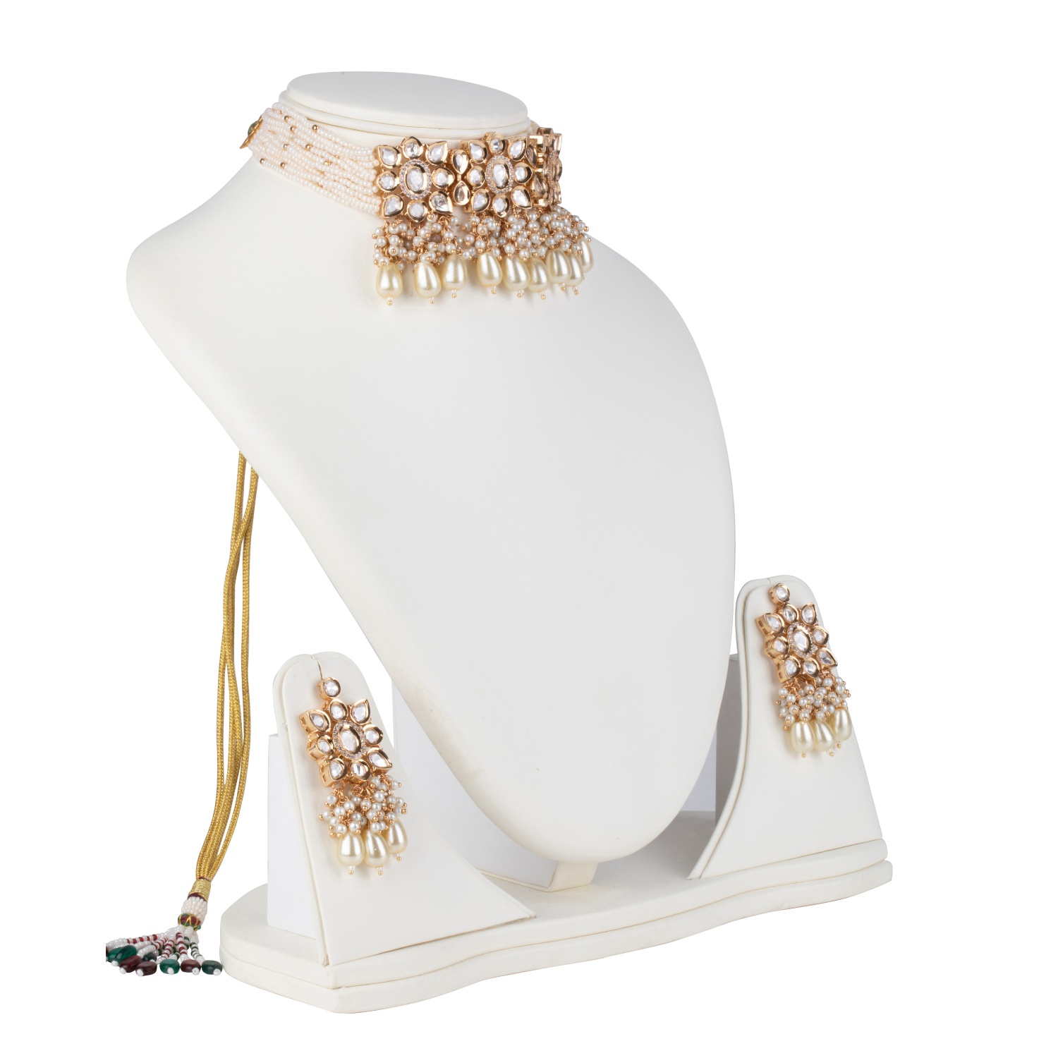 ₹ 8,100 (5% off)Embrace elegance with Minaki's noor kundan choker set. This statement piece is beautifully crafted in a grand kundan/polki setting and adorned with pearls and crystals, all set in 22kt gold-plated mixed metal. Perfect for weddings and formal occasions, complete the ensemble with matching earrings.