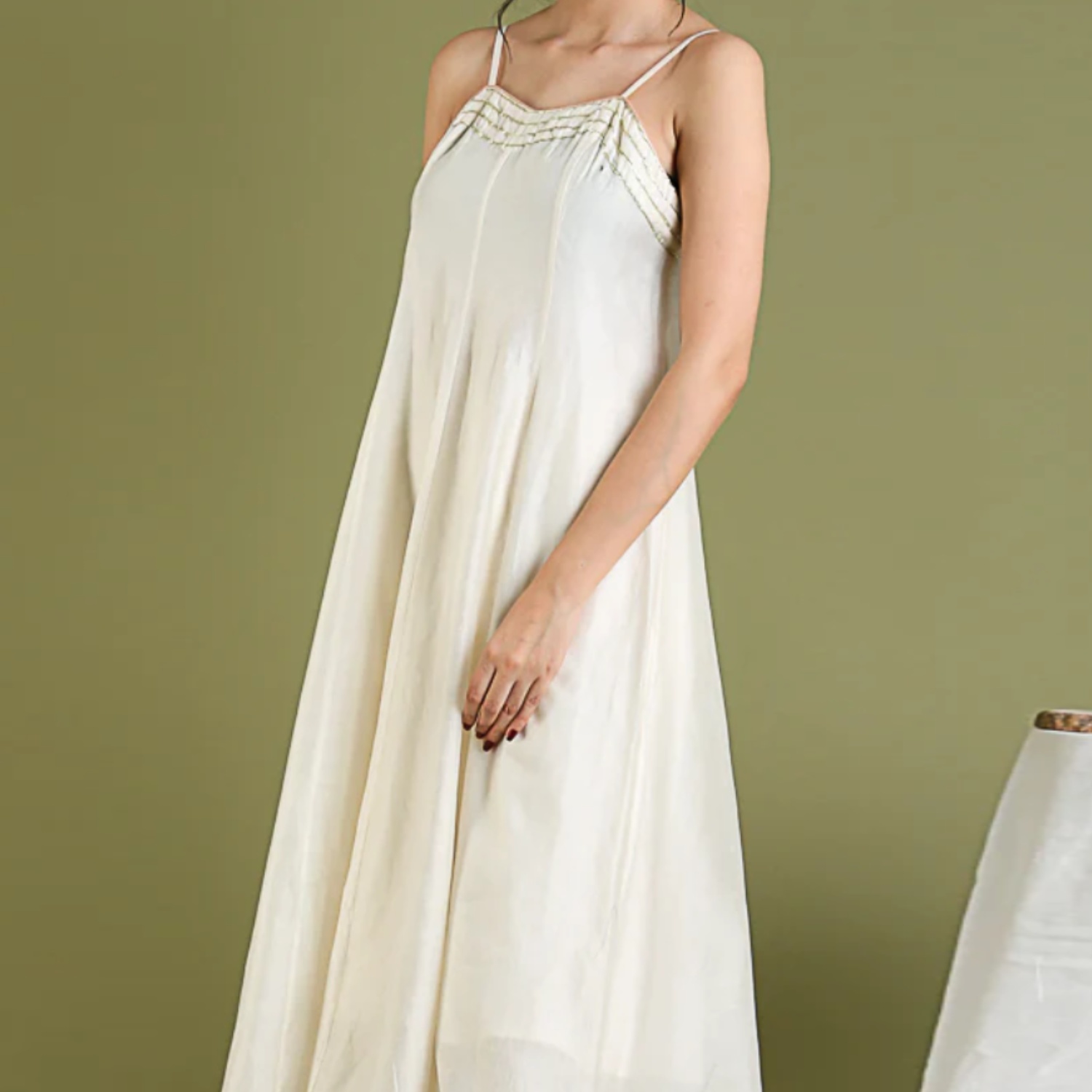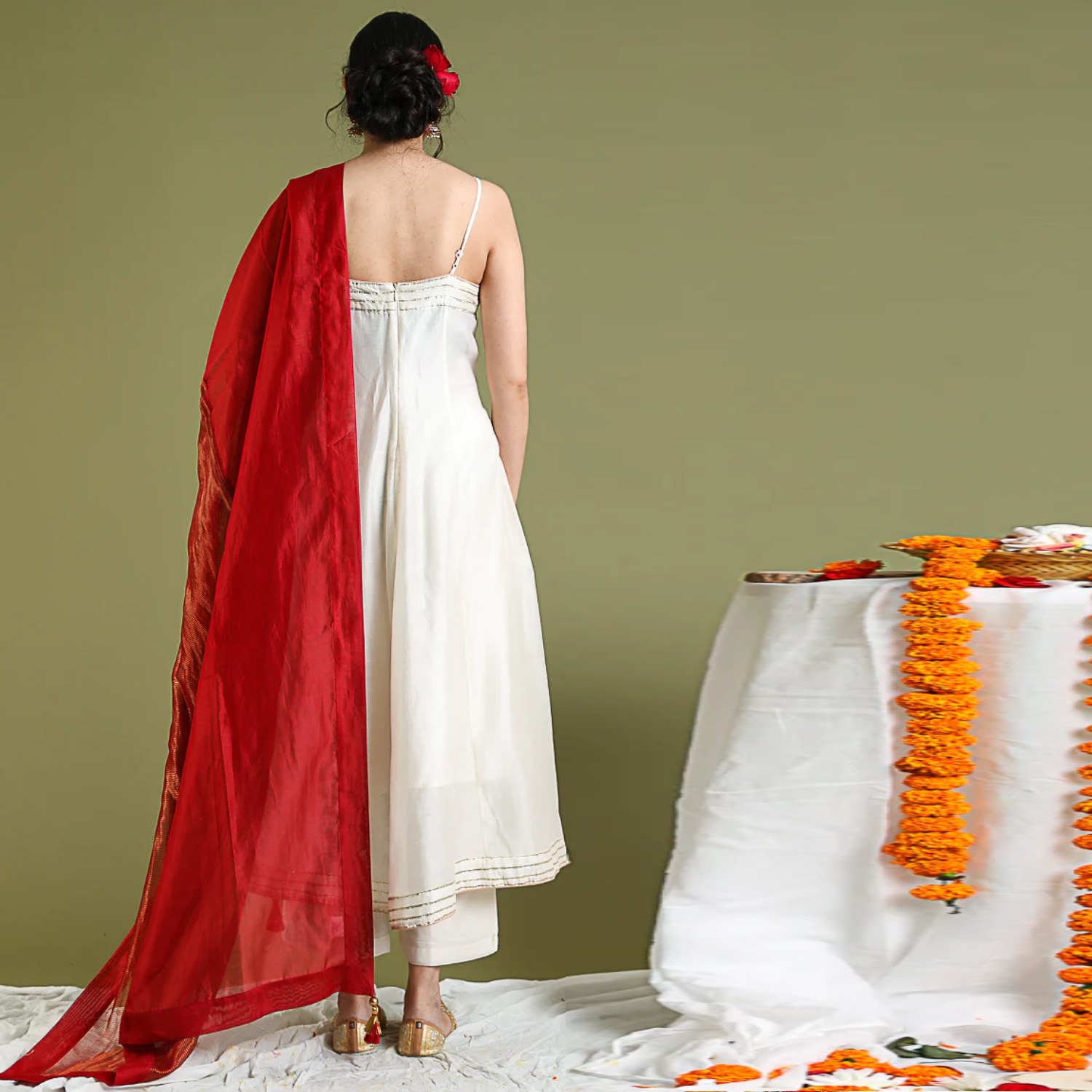 ₹ 6,999 (10% off)Embrace contemporary elegance in this off-white anarkali, featuring spaghetti straps and gota detailing on the front and hemline. Paired effortlessly with matching chanderi pants, the ensemble exudes modern sophistication. Perfect for those seeking a chic and stylish ensemble that seamlessly blends tradition with contemporary flair.
