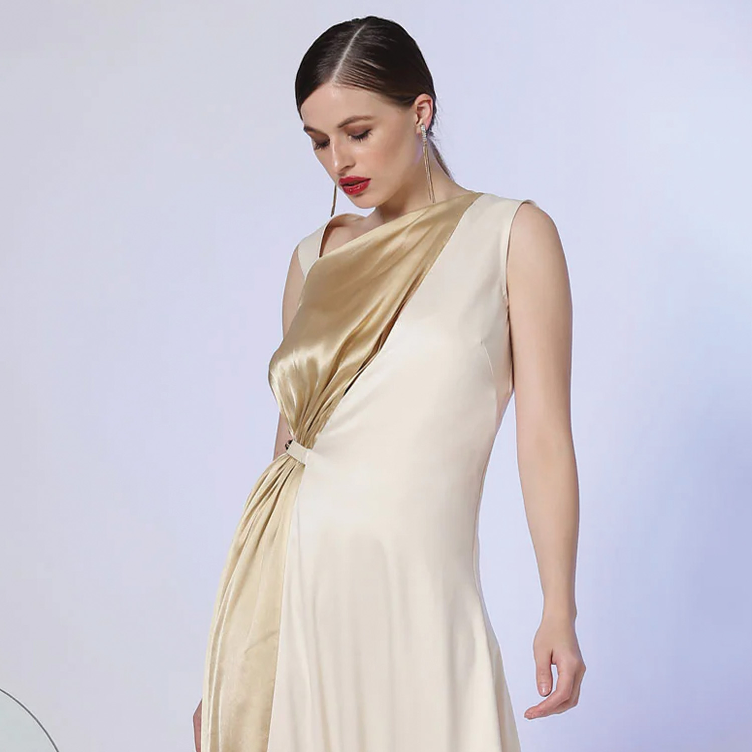 This gown is crafted from lightweight and soft satin fabric. It has a beautiful combination of off-white and champagne shades, adding opulence to the look. Style it with statement earrings and a clutch for a dressy event.