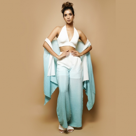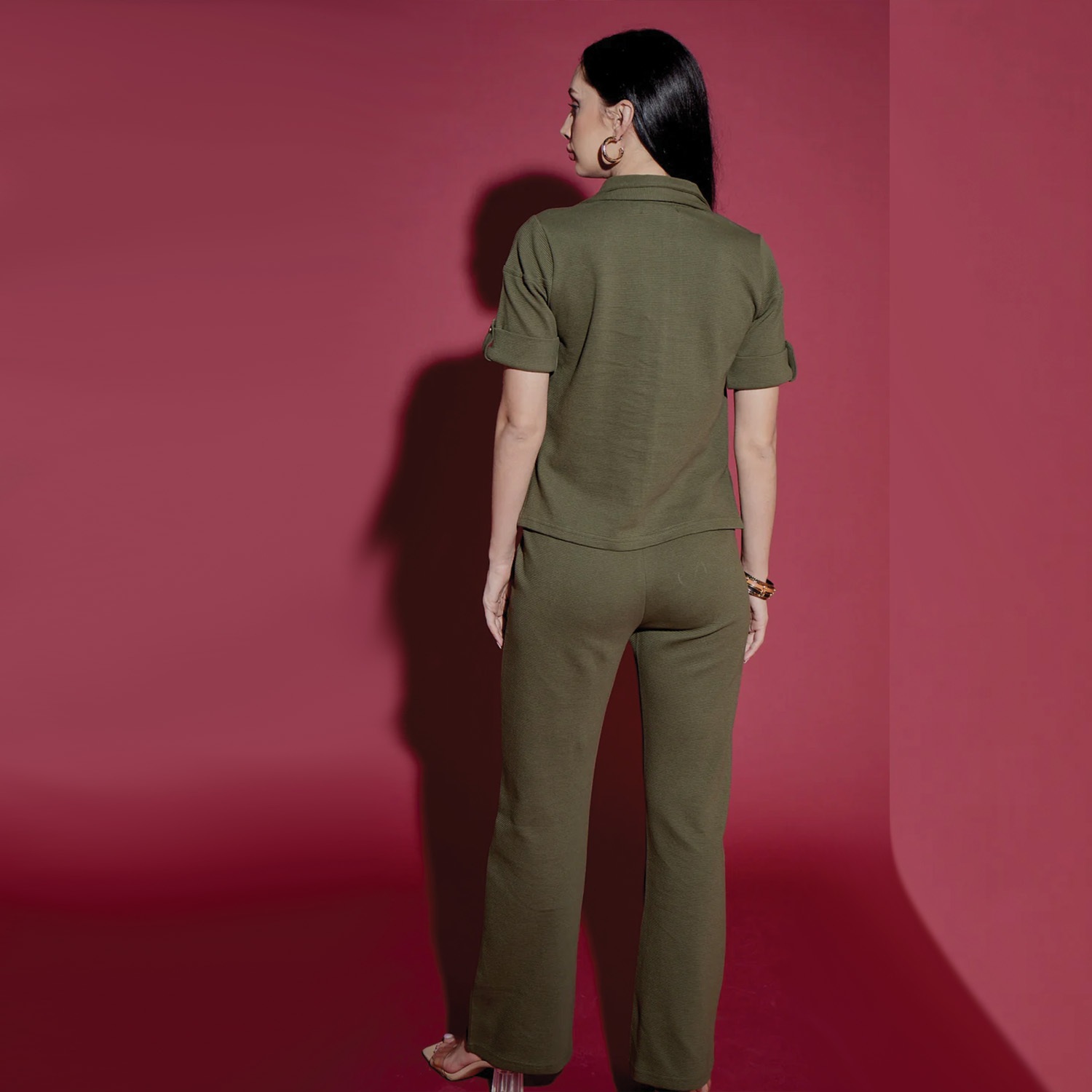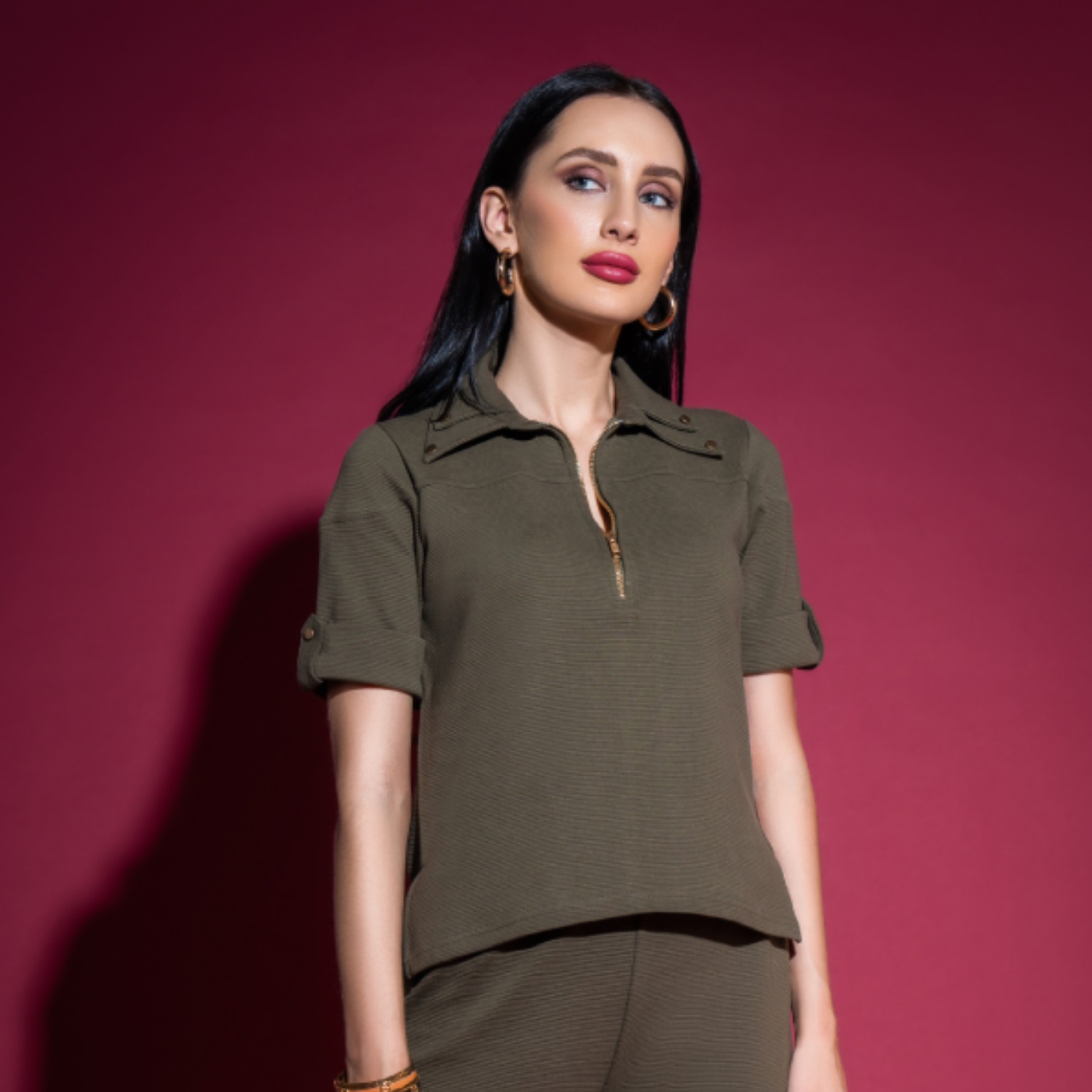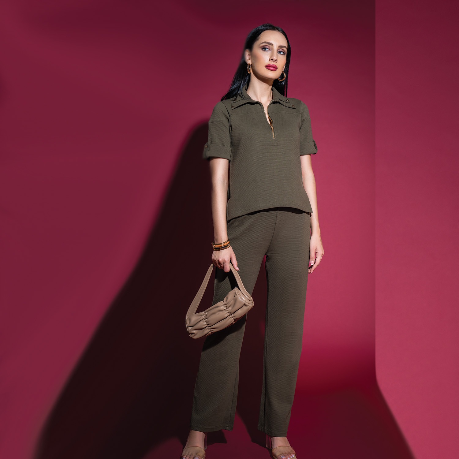 This statement olive green co-ord set is crafted in a rich ribbed fabric. It features a collared top with detailed stitch lines, metallic buttons, a center zip & a side slit. It is paired with matching elasticated pants, offering comfort and style. Pair it with statement gold earrings and a sling bag for a dressy day soiree.