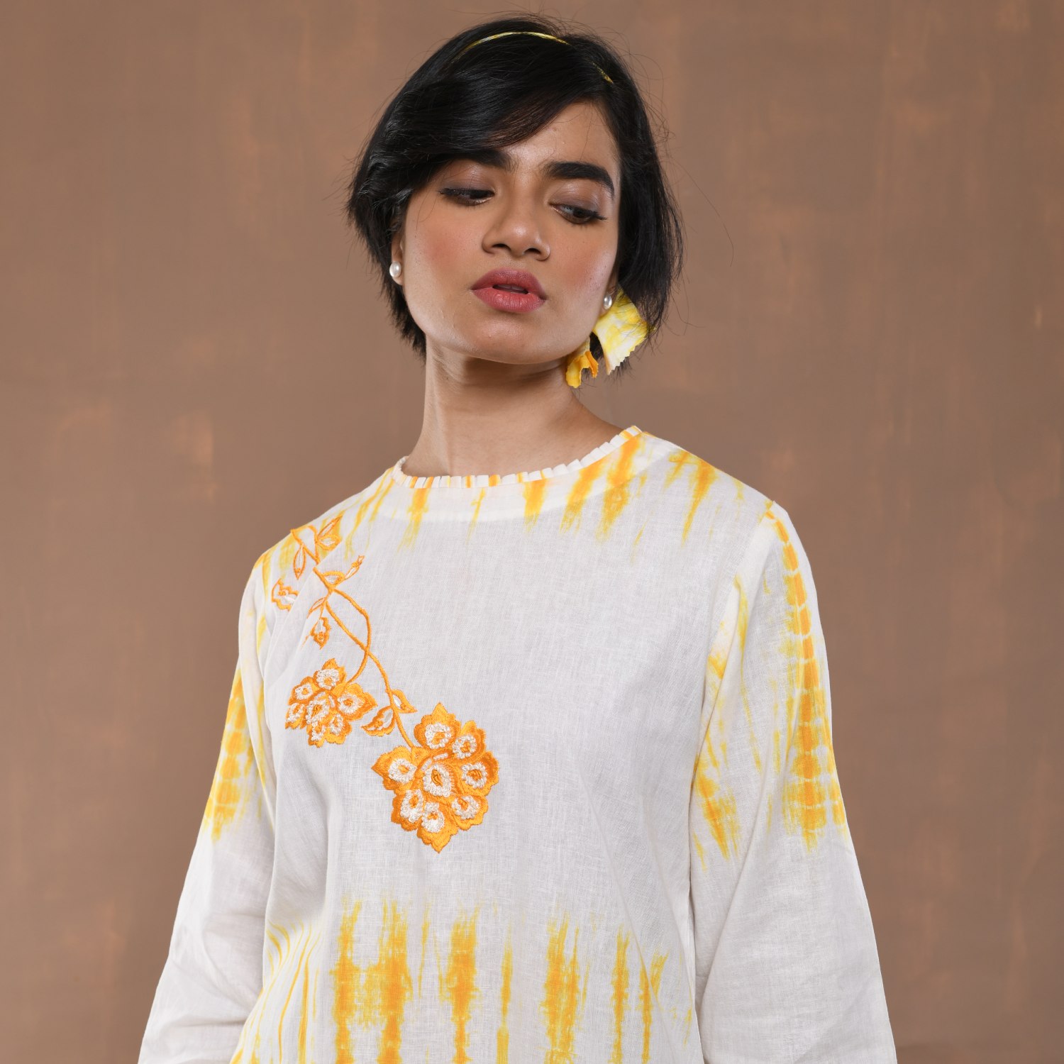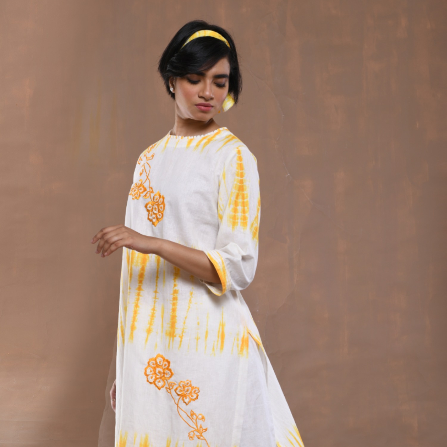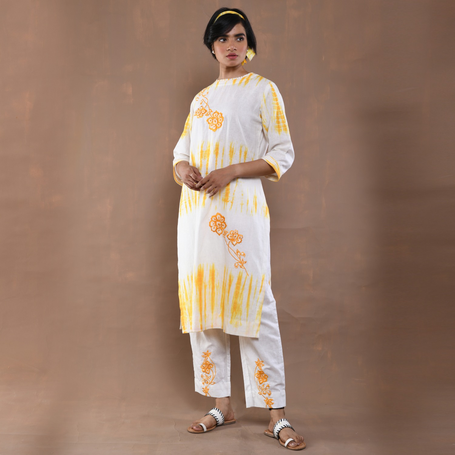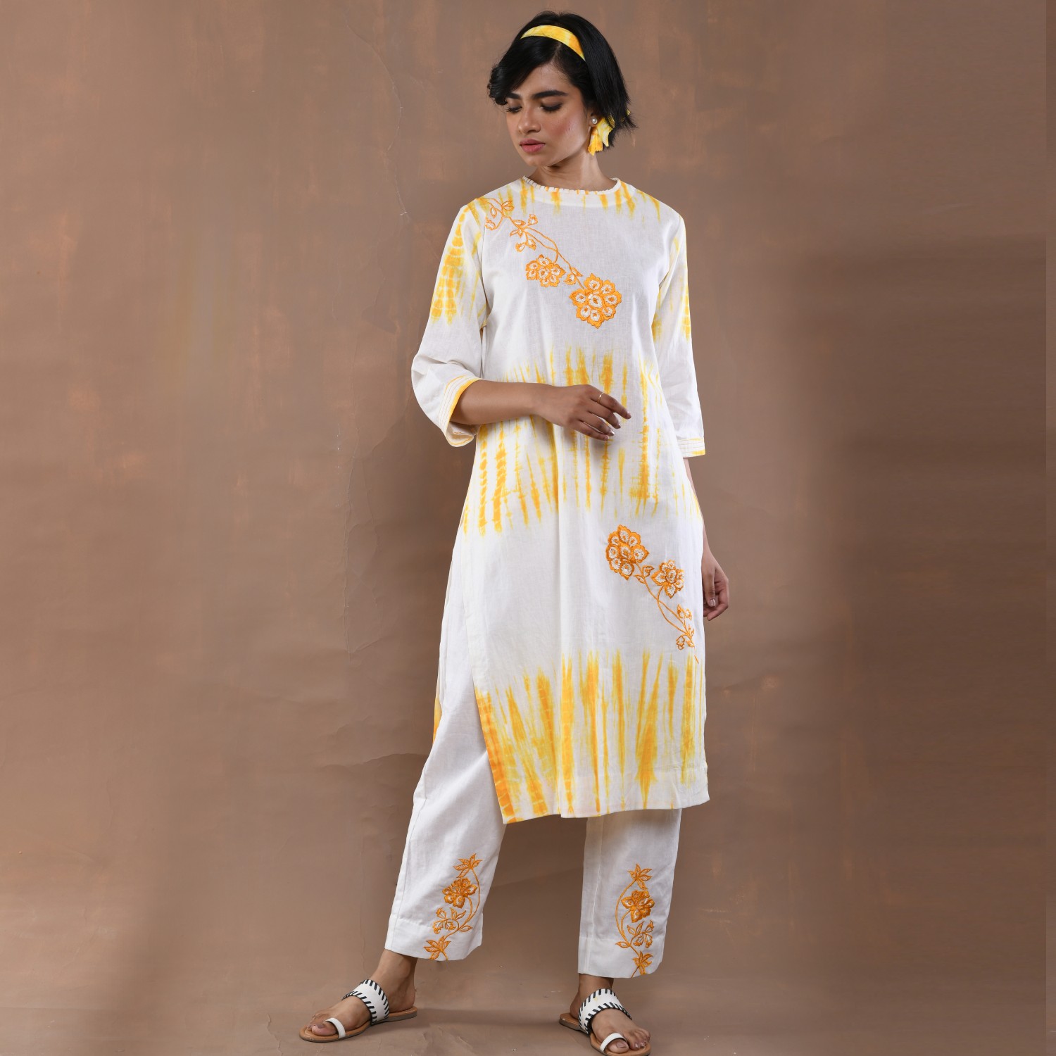 ₹ 6,399 (20% off)Crafted from breathable linen fabric, this set features a relaxed-fit, straight-cut kurta and pants adorned with delicate floral embroidery and intricate hand-thread work details. The tie-dye pattern in shades of yellow and white adds elegance to the outfit. Pair it with bold earrings and a sling bag for a day out with friends.