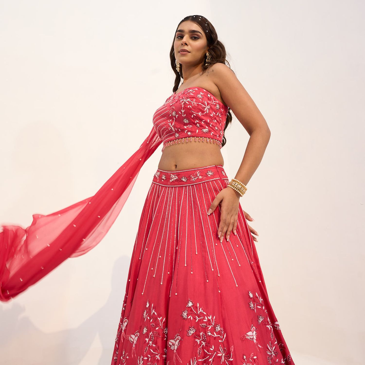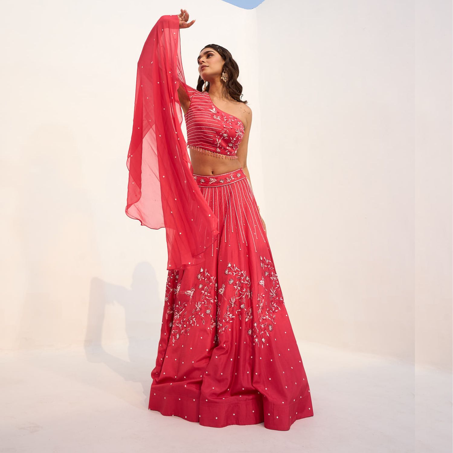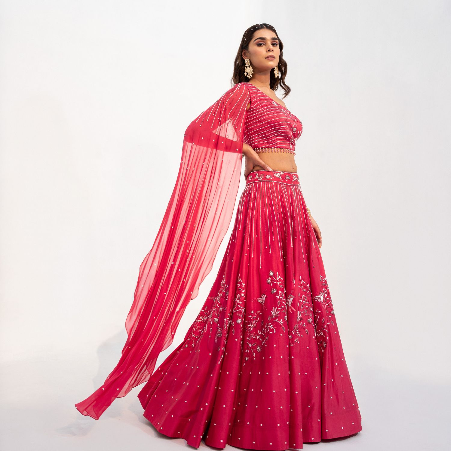 Add a touch of traditional luxury to your wardrobe with this embroidered crop top and skirt set. This coral red set features a carmine one-shoulder crop top with a dreamy attached cape. It is adorned with intricate hand embroidery all over. Style this outfit with statement earrings for weddings or festivities.
