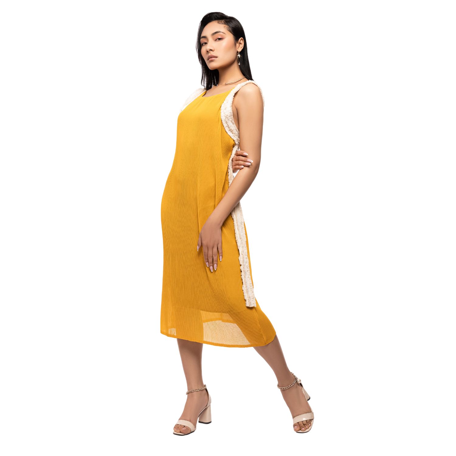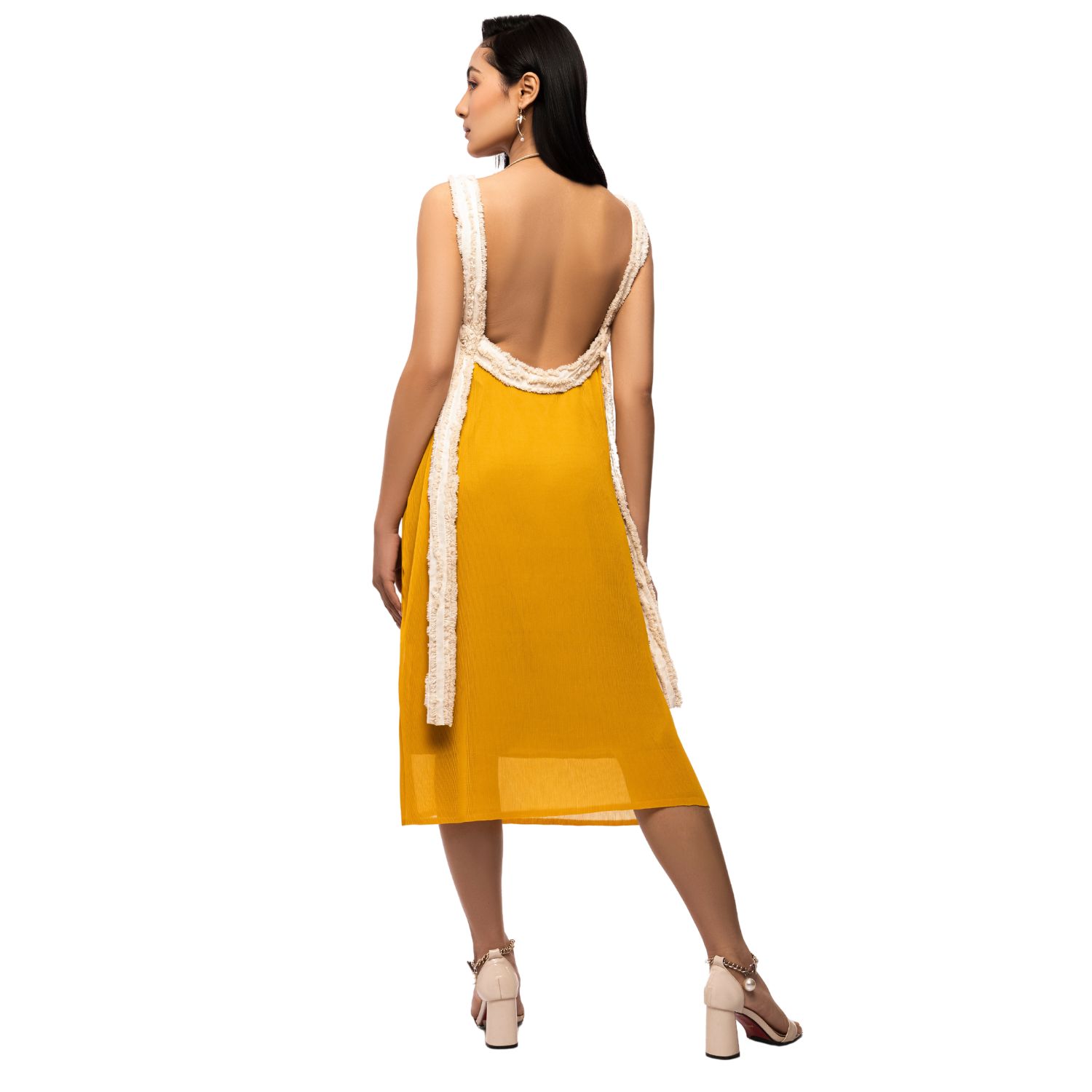 Get ready for summer with our stunning open-back pleated dress, designed to elevate your fashion game. Featuring long dress-length textured loose straps, this georgette dress is summery, playful and the perfect addition to your vacation wardrobe.