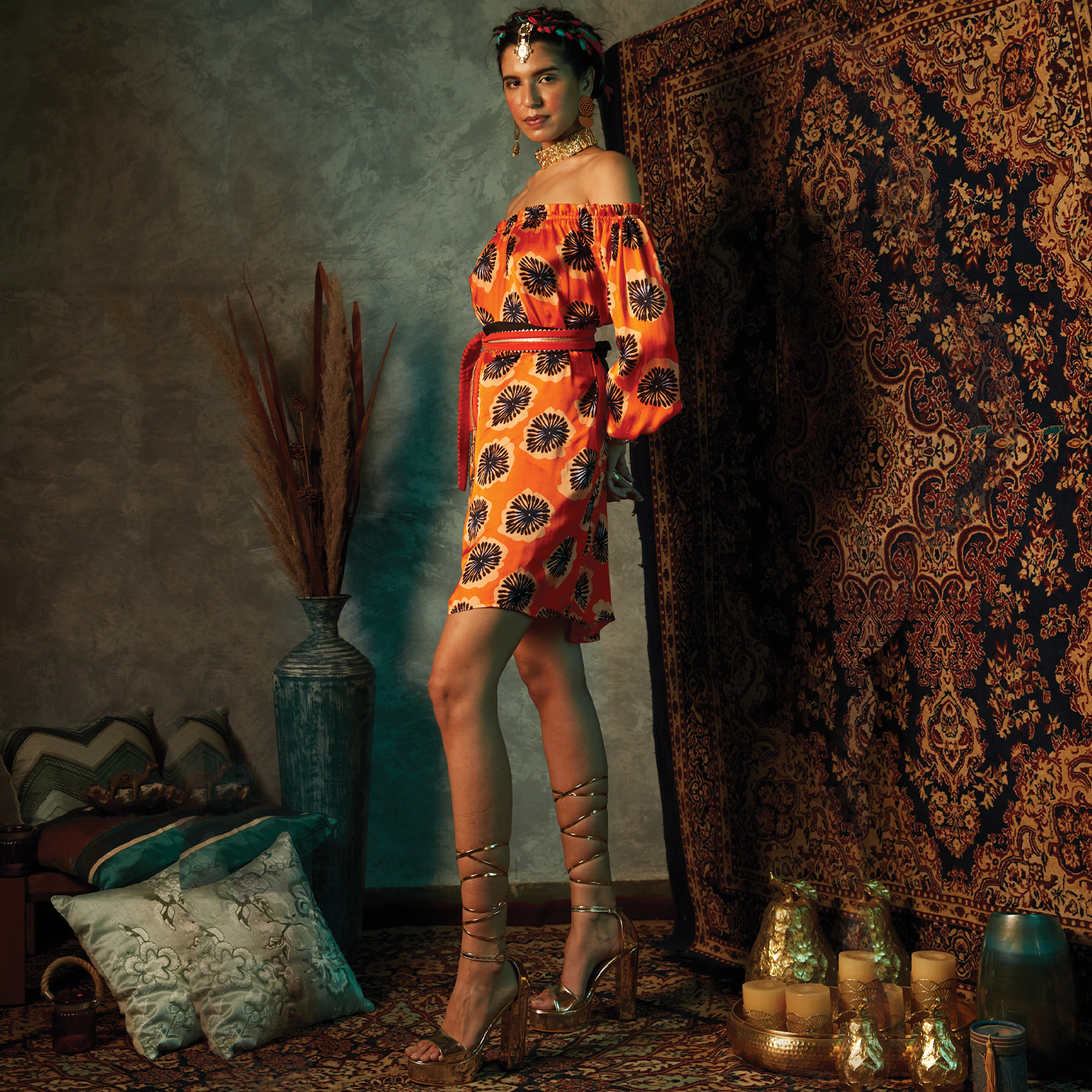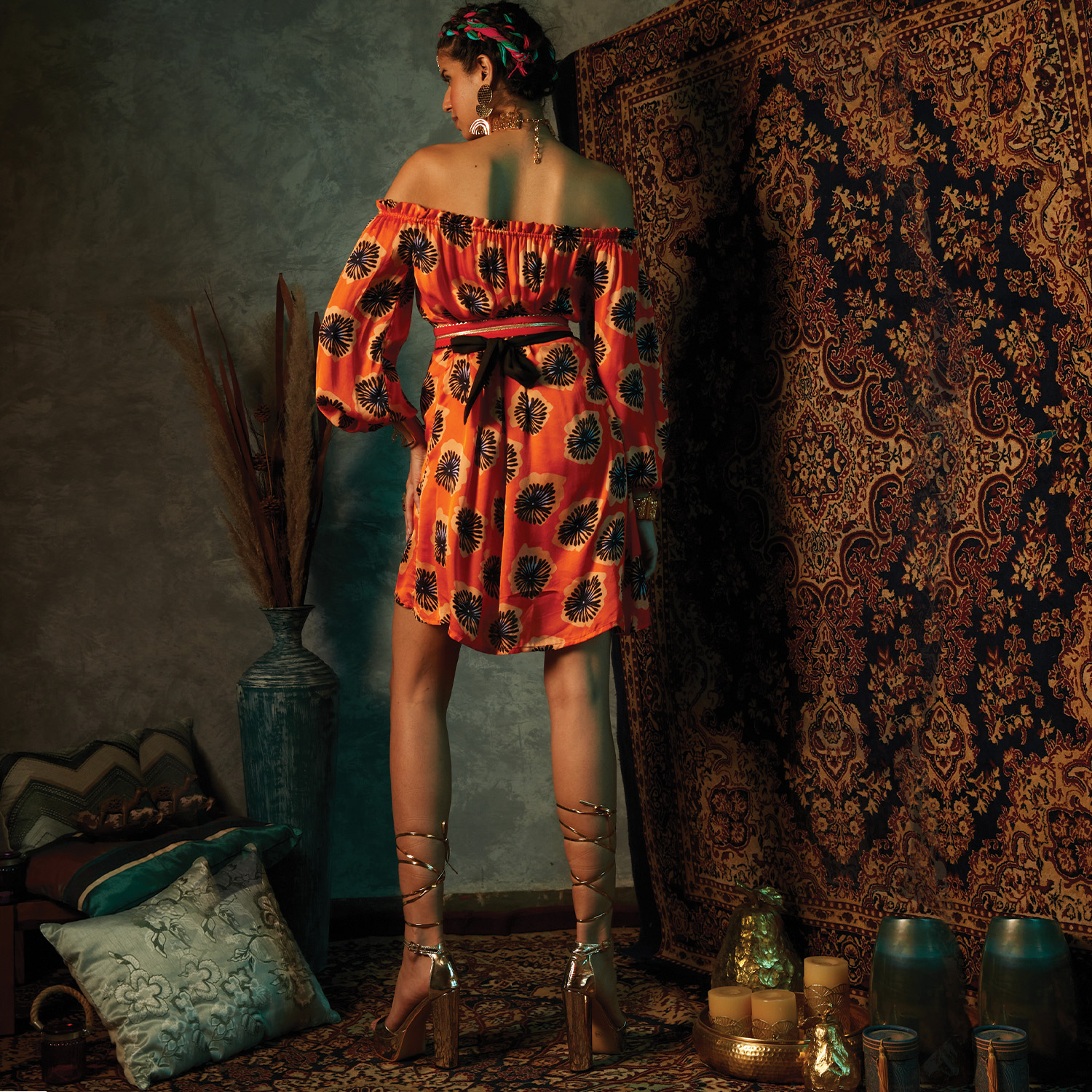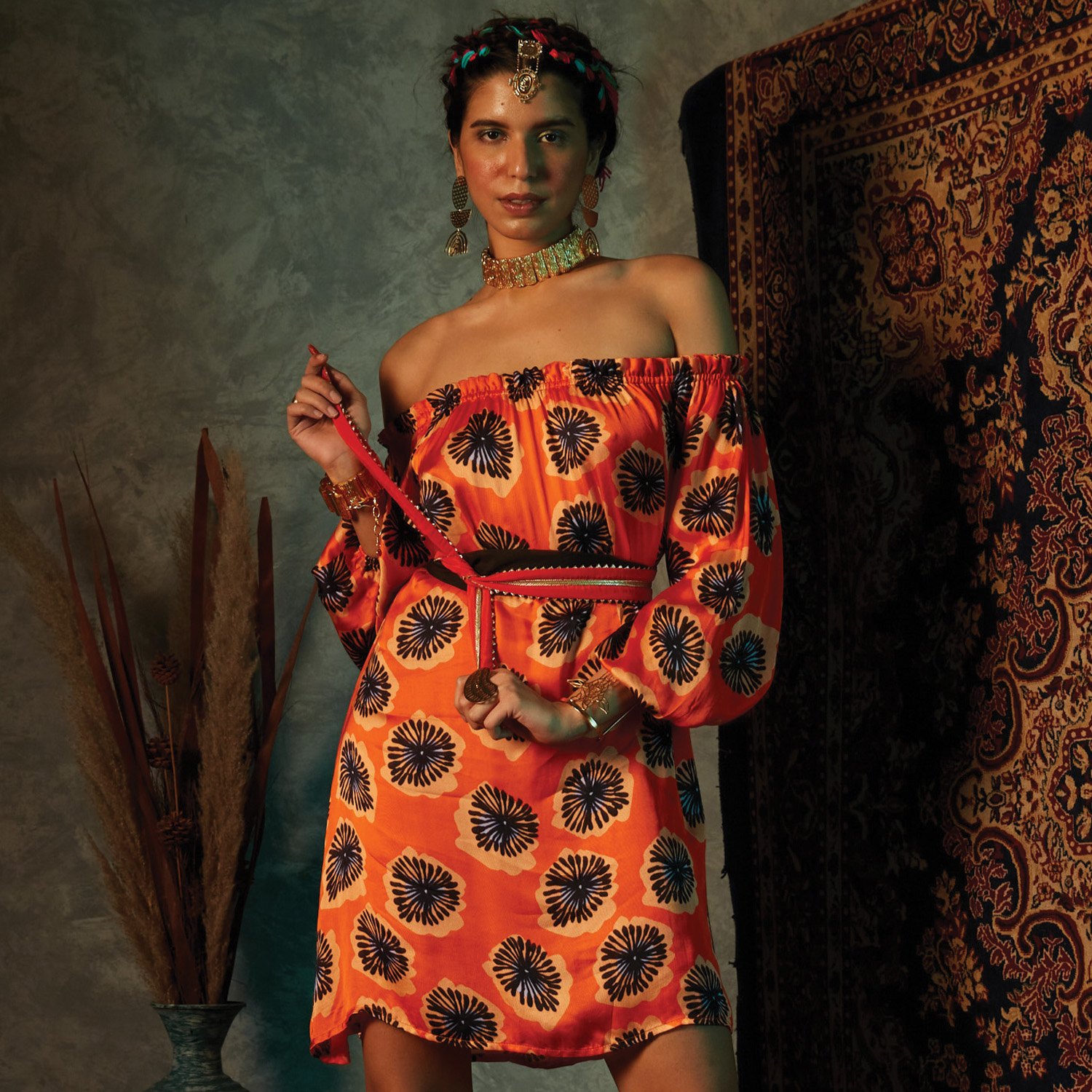 Crafted from high-quality crepe fabric, this off-shoulder dress features an orange base with a contrasting print, offering elegance and style. It is completed with a fabric belt to accentuate your waist, offering a flattering silhouette.