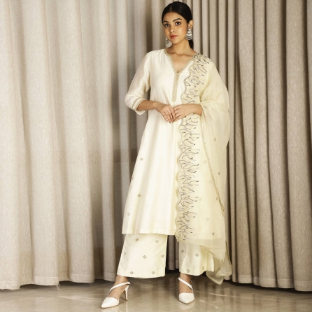This orange liva kurta set is made of liva silk and embellished with block print and hand embroidery. The set includes a kurta with intricate embroidery and a matching pair of pants. The fabric is lightweight and breathable, making it an ideal choice for summer and spring days.