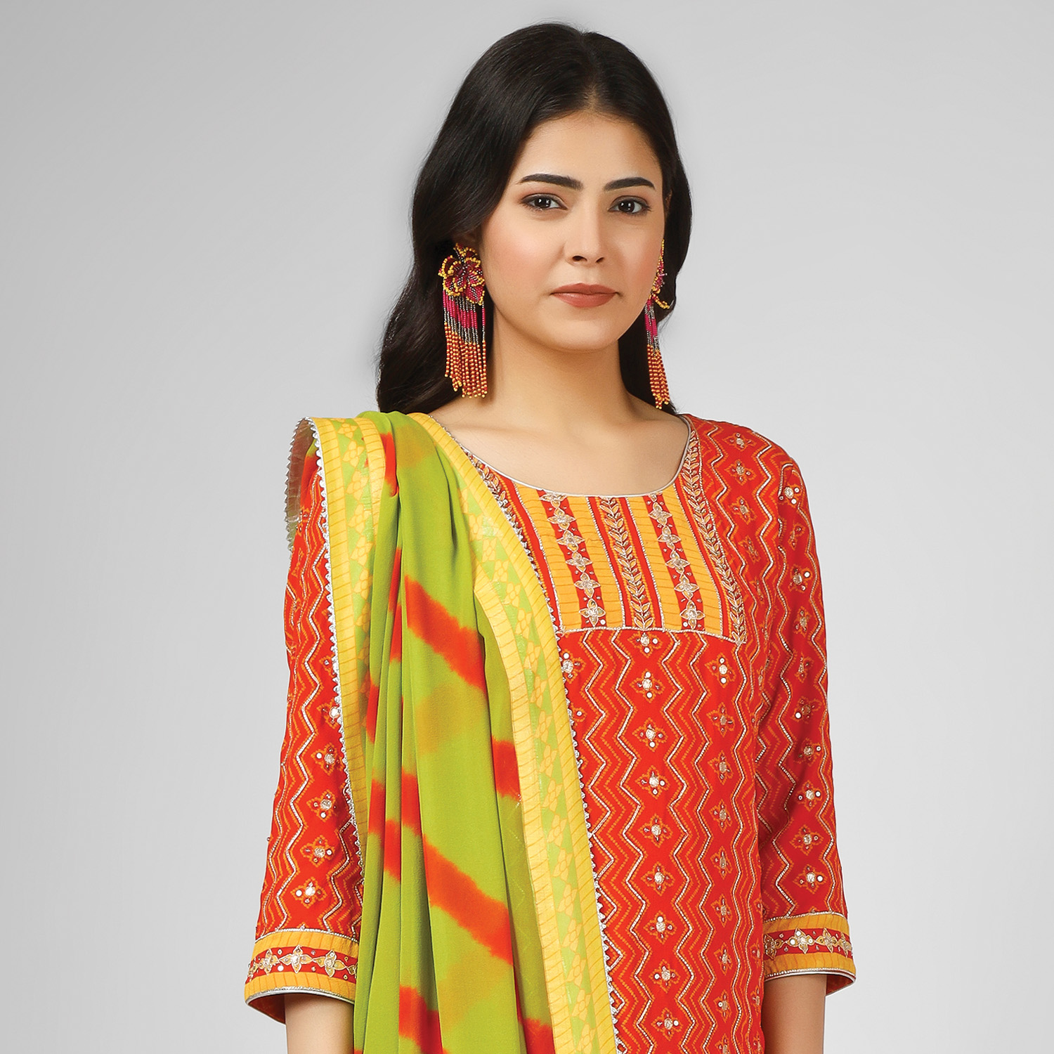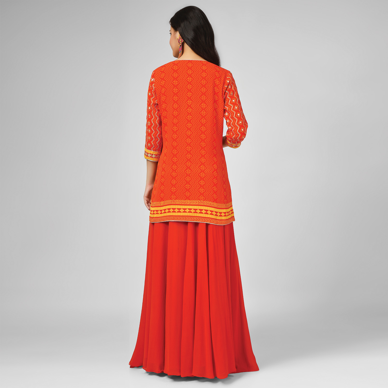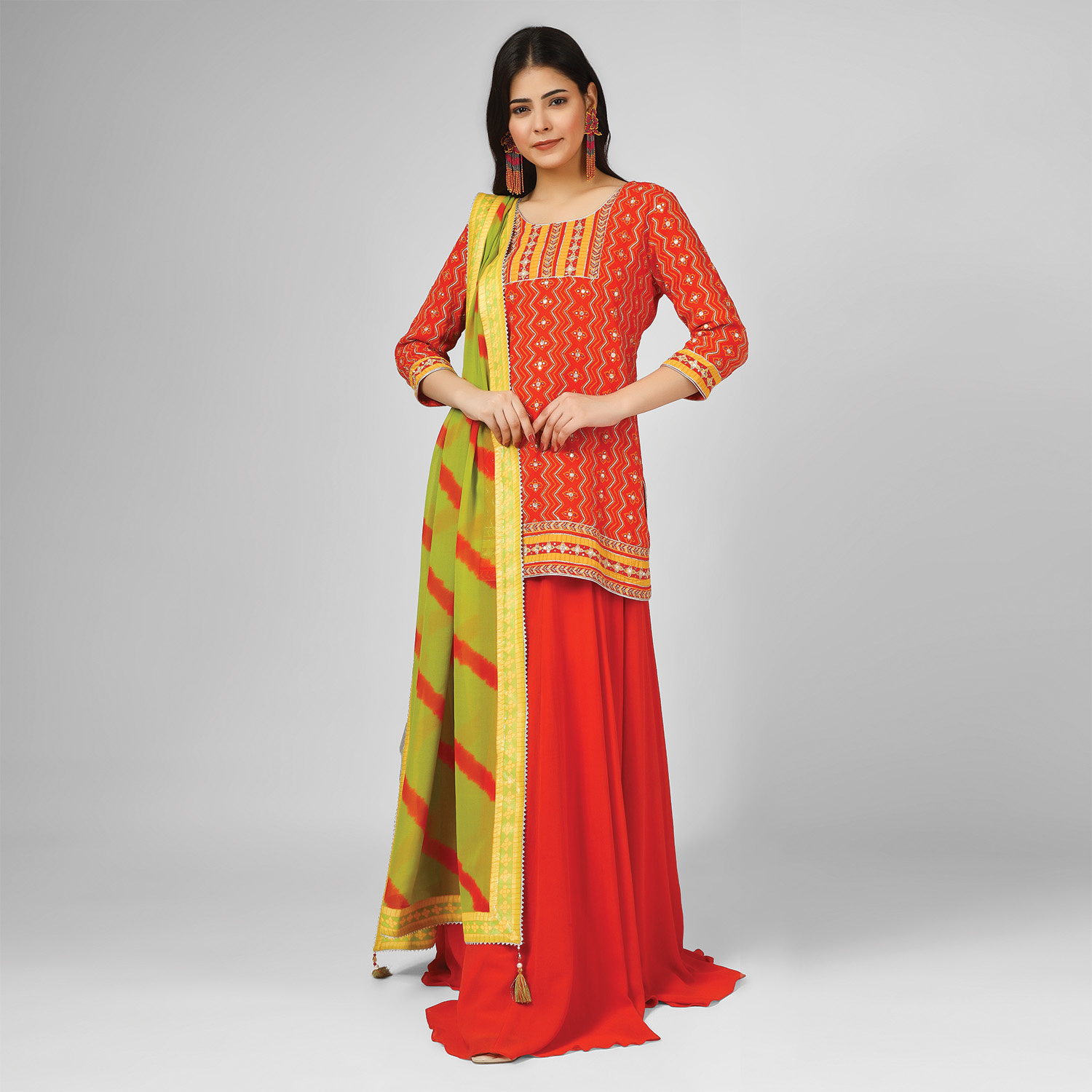 This beautiful set comprises a kurta with a matching sharara and a green printed dupatta. The short kurta features digital printing and hand embroidery, adding intricate details to the outfit. The set is completed with a green printed dupatta that complements the orange kurta and sharara pants.