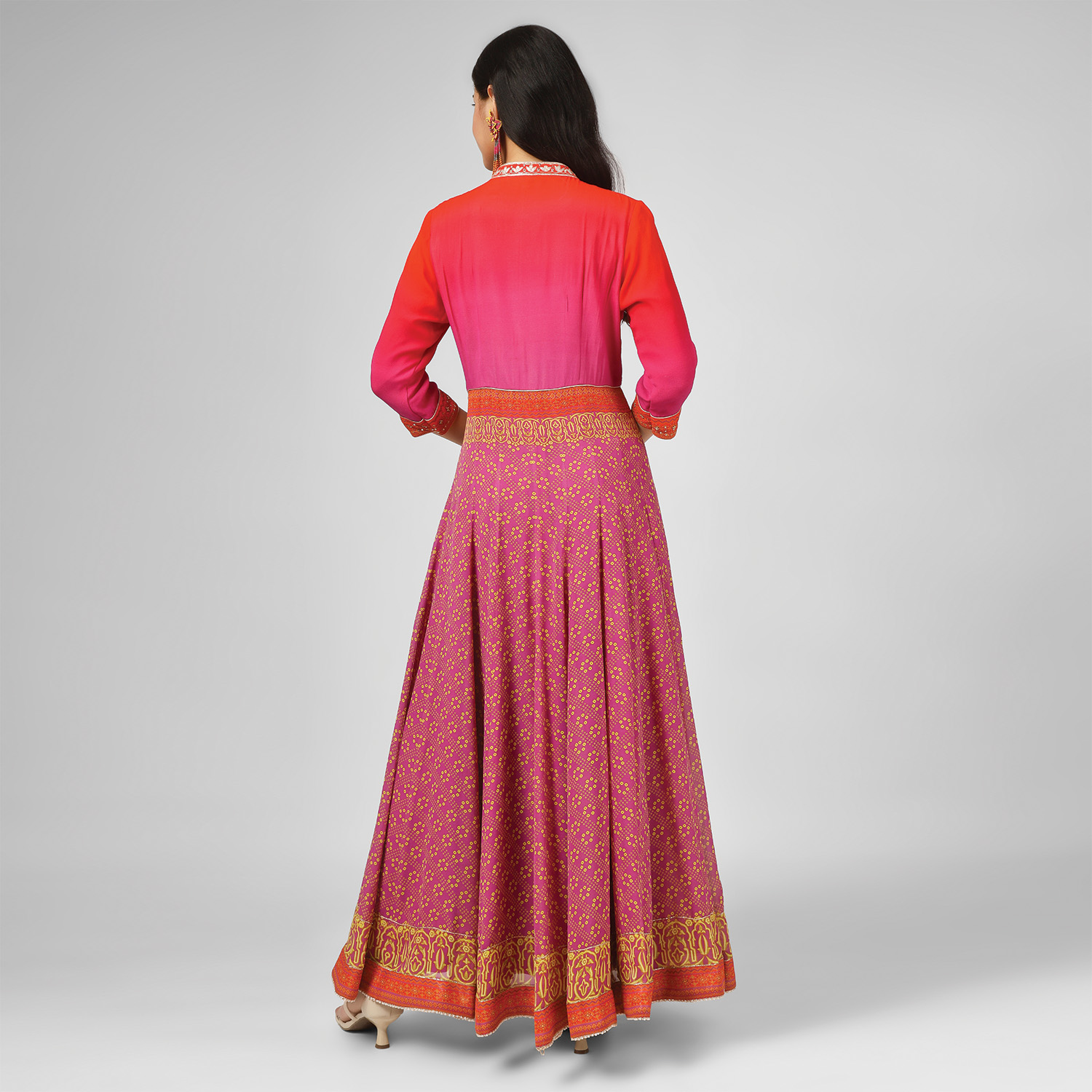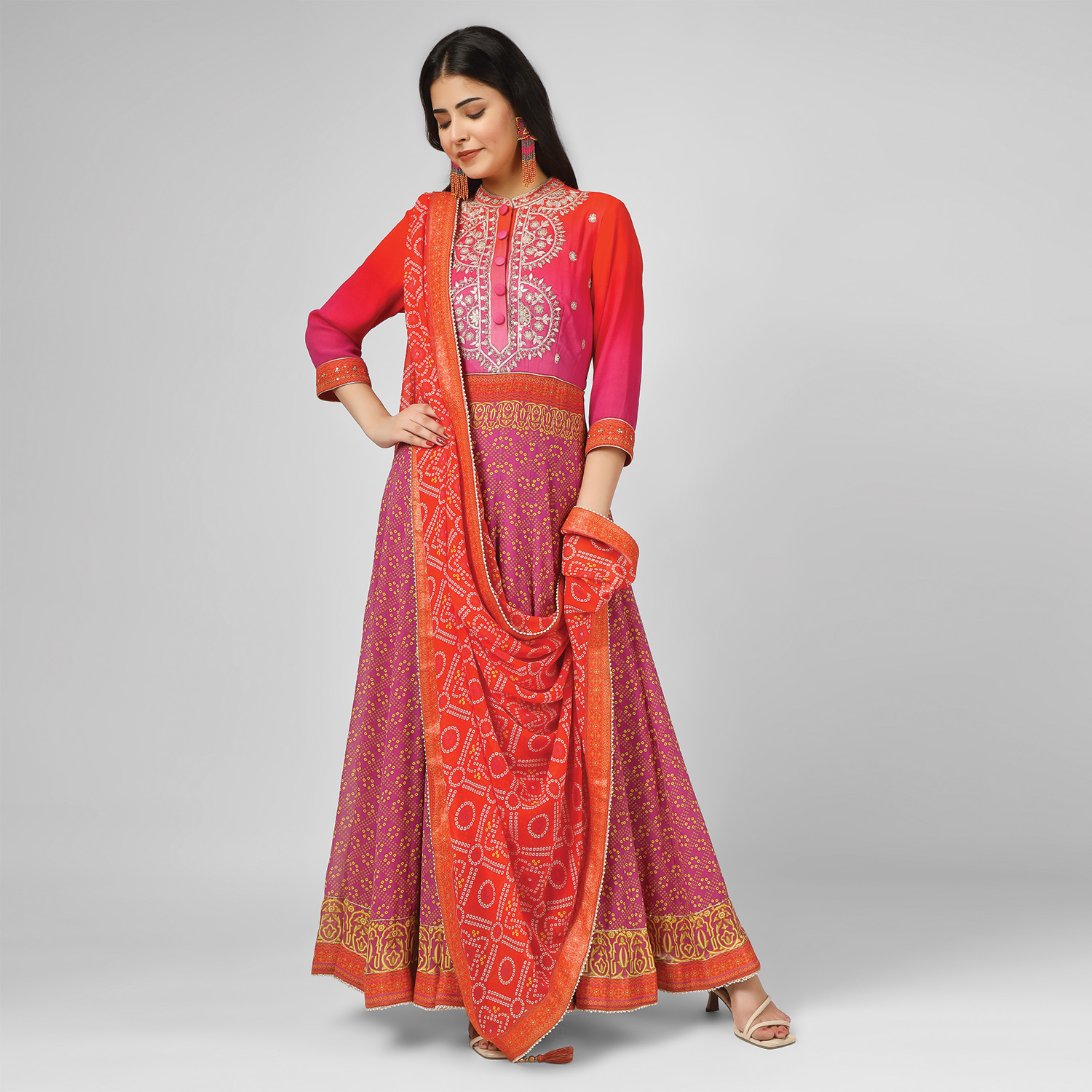 This beautiful kurta and dupatta set is crafted from high-quality silk georgette fabric and features pink and orange hues. The set is adorned with intricate embroidery and digital print, adding elegance to the look. Pair it with statement jhumkas and an embellished clutch for traditional events.