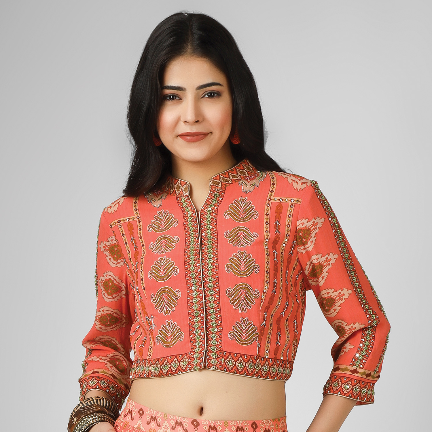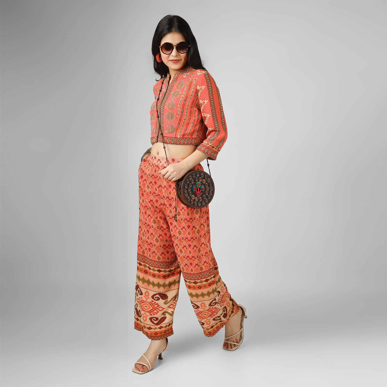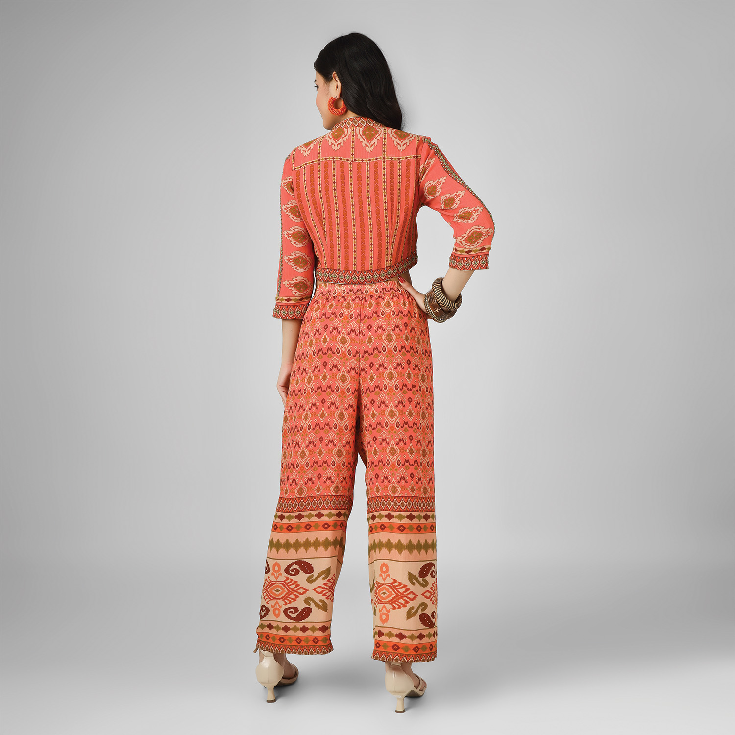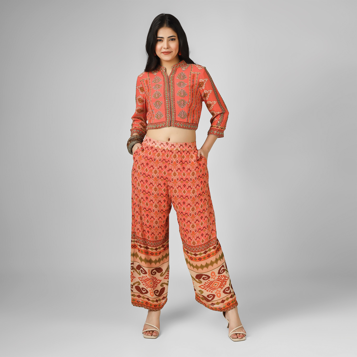 Crafted from high-quality silk georgette fabric, this set comes in a vibrant orange shade. It features a crop top with intricate embroidery and digital print. The top is paired with matching palazzo pants, creating a cohesive look. Style it with statement earrings and heels for a dressy event.