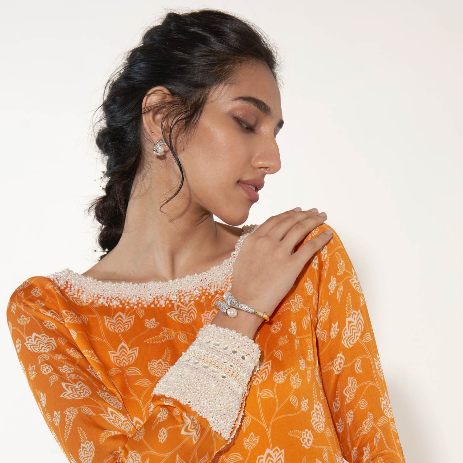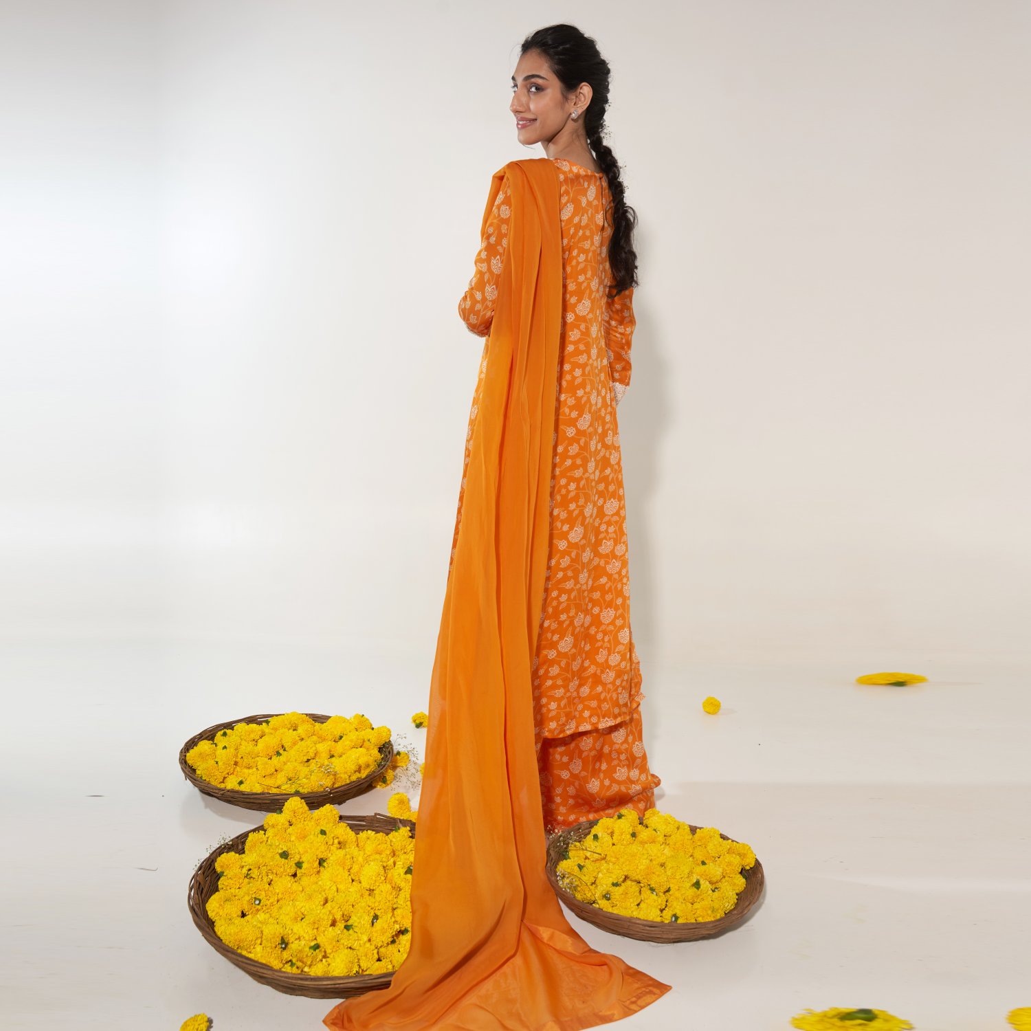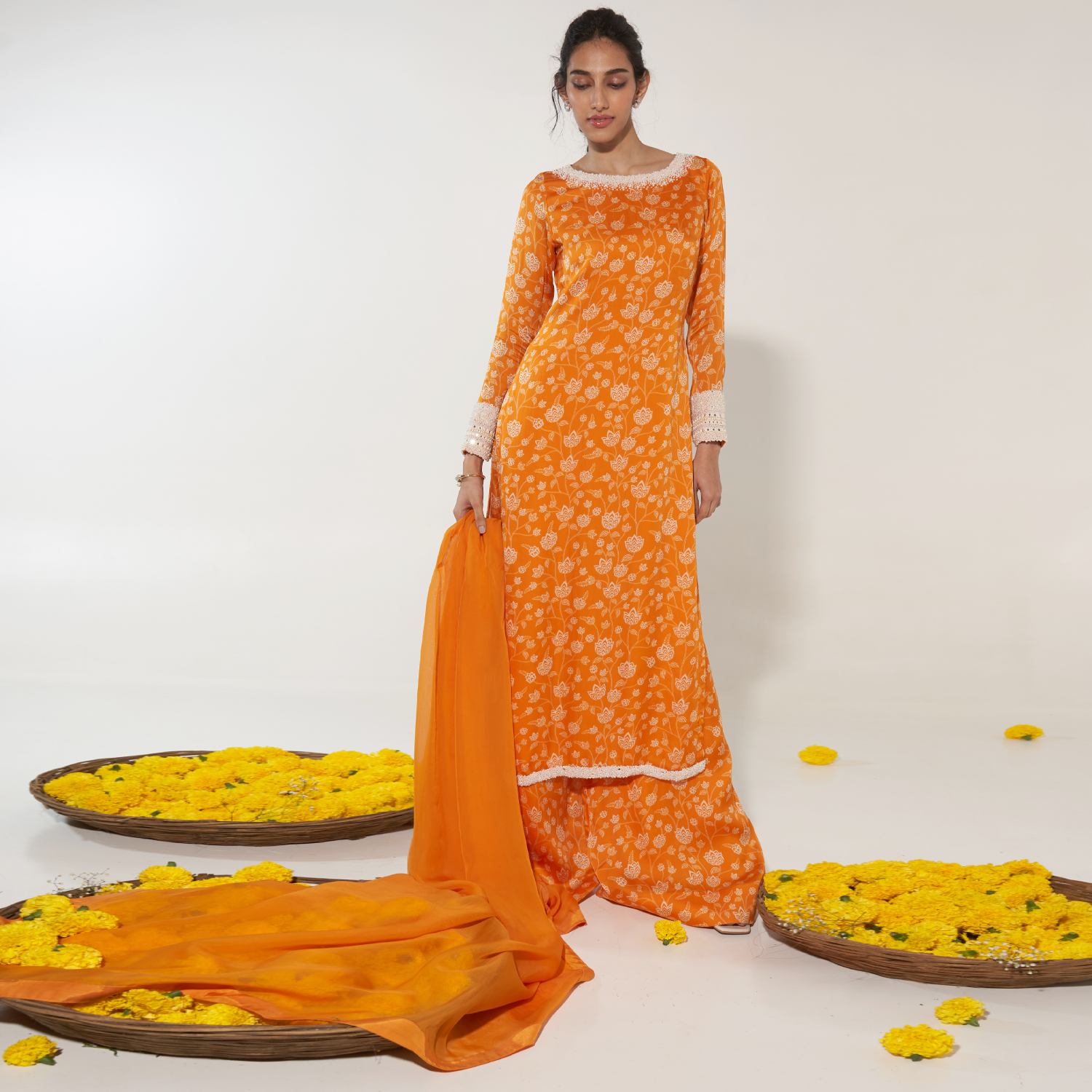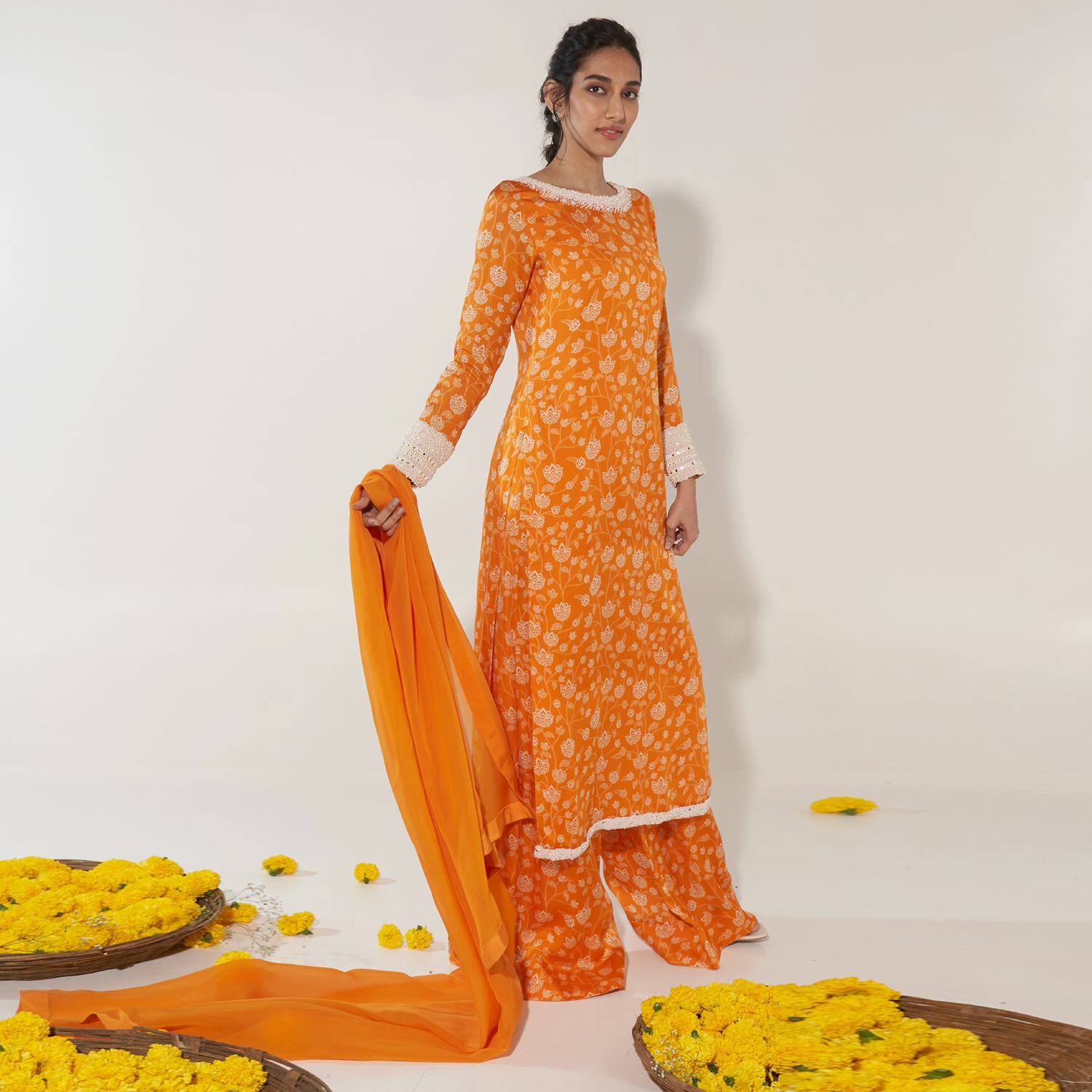 ₹ 24,250 (15% off)This beautiful kurta features a relaxed fit and is adorned with a charming orange and white floral print. The sleeves, neckline, and hem of the kurta have been beautifully hand-embroidered with pearls, mirrors, and white glass beads, adding sophistication to the look. The set is completed with palazzo pants and an orange organza dupatta, adding a pop of color and contrast.