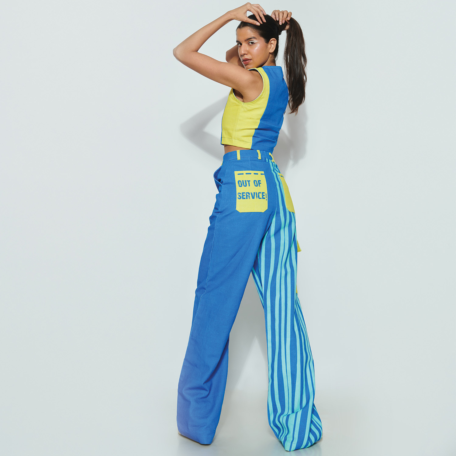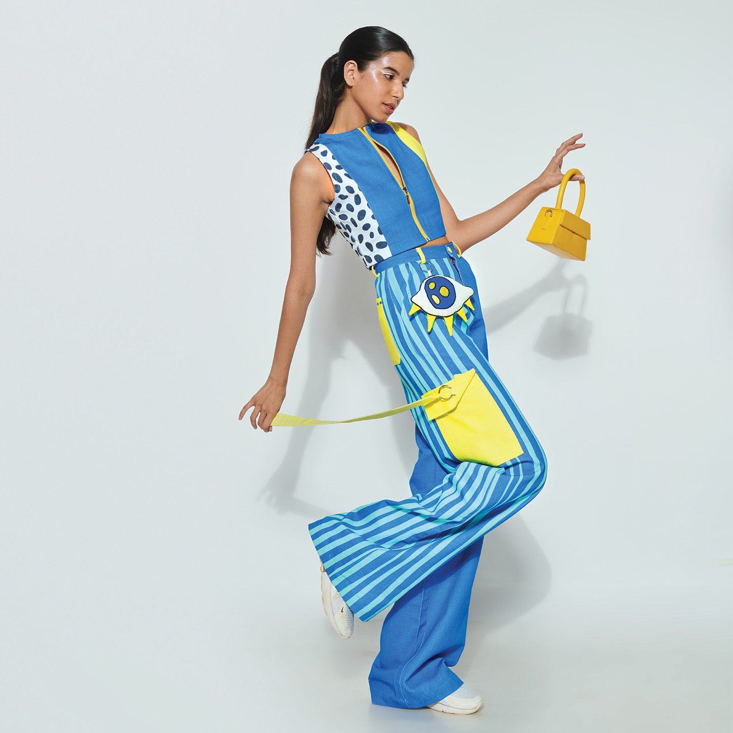 ₹ 8,199 (10% off)These pants are high-waisted with a straight, wide-leg design and side pockets. They offer a relaxed fit, detachable lanyard, and puff eye accessory for added style. These pants feature digitally printed artwork in a multicolored pattern on white denim. Style them with statement earrings and heels for a dressy day event.