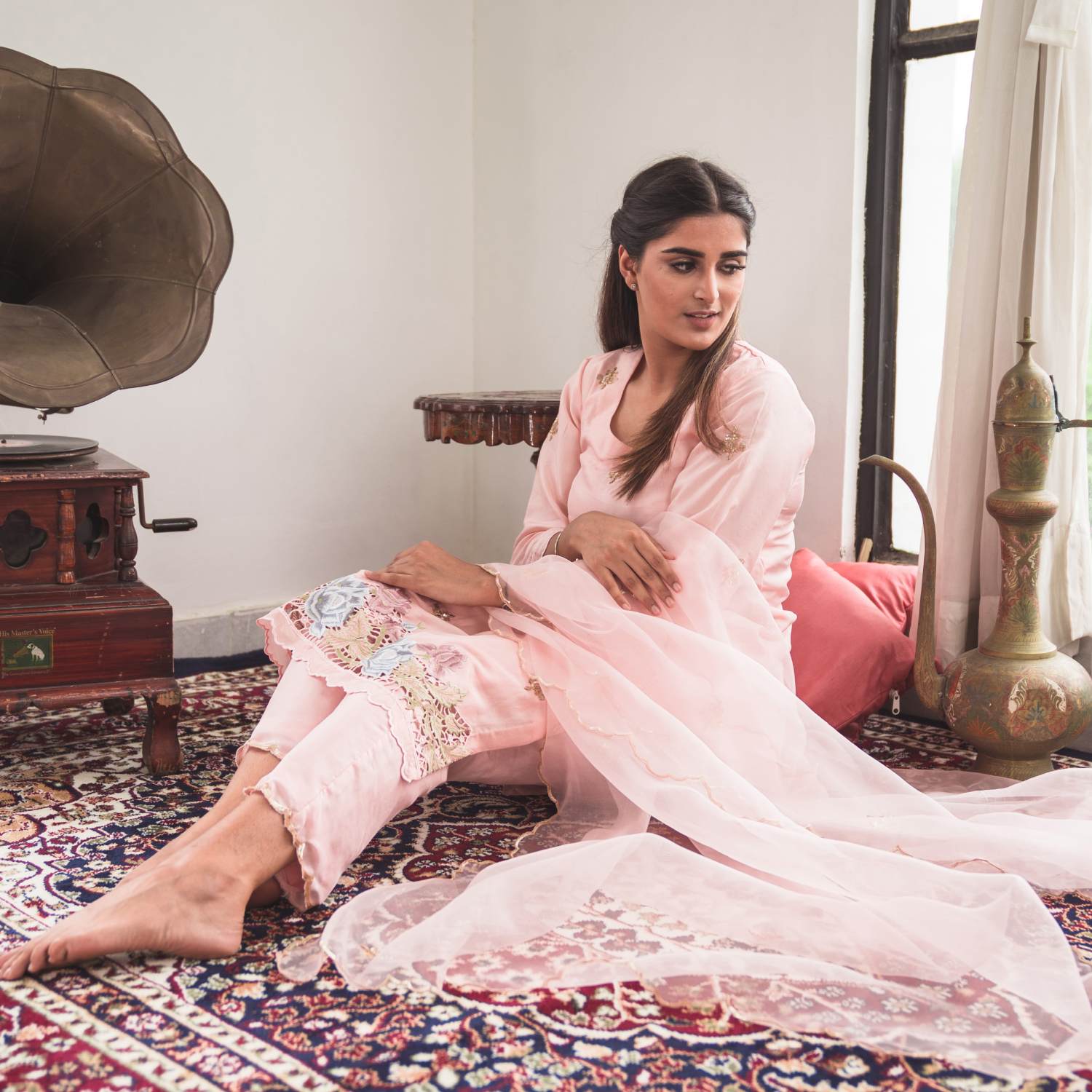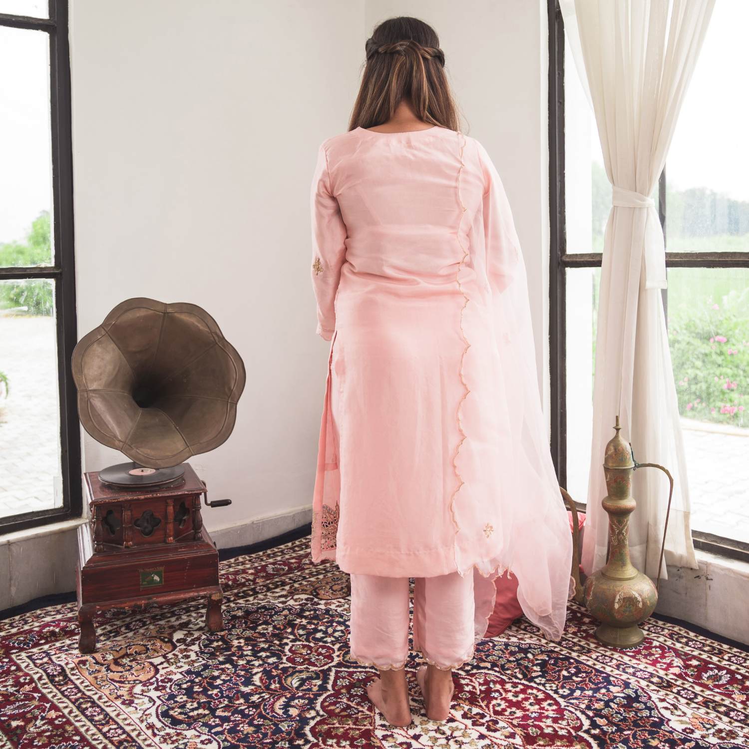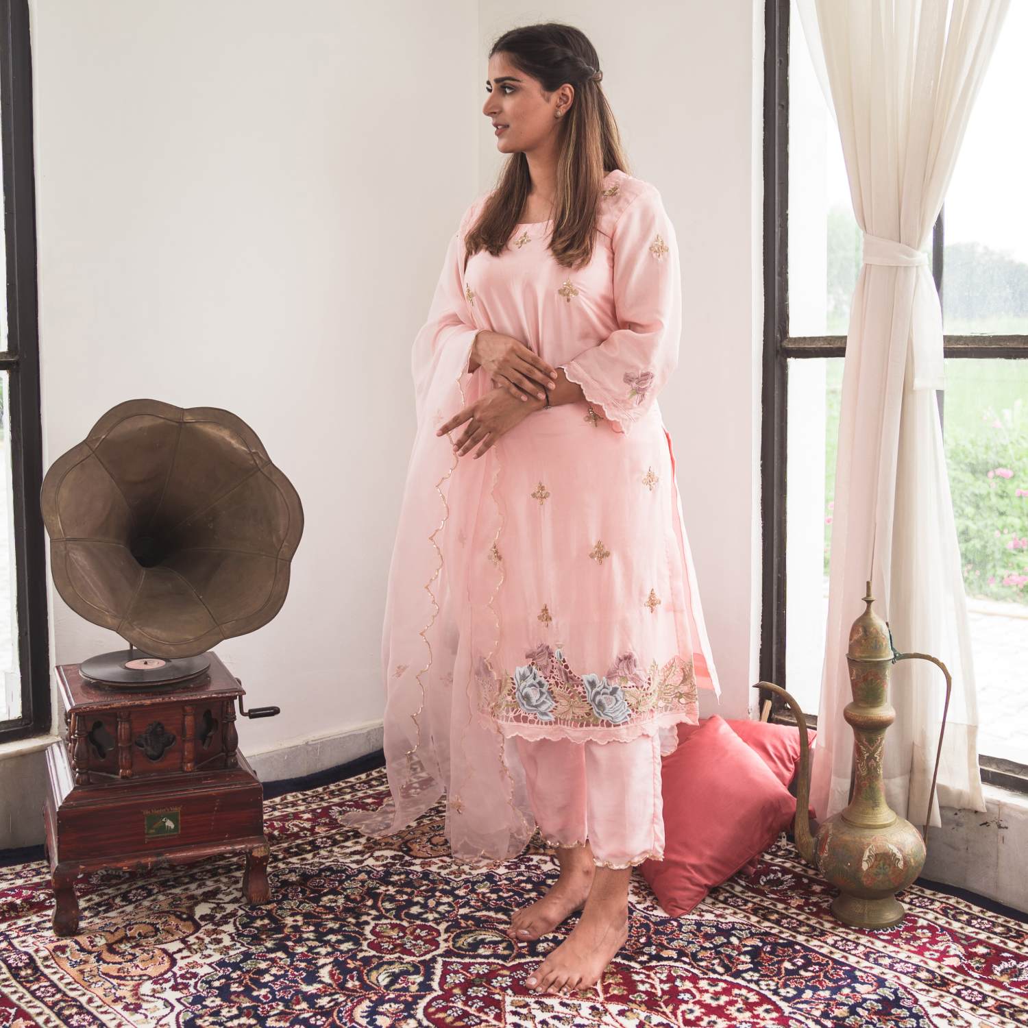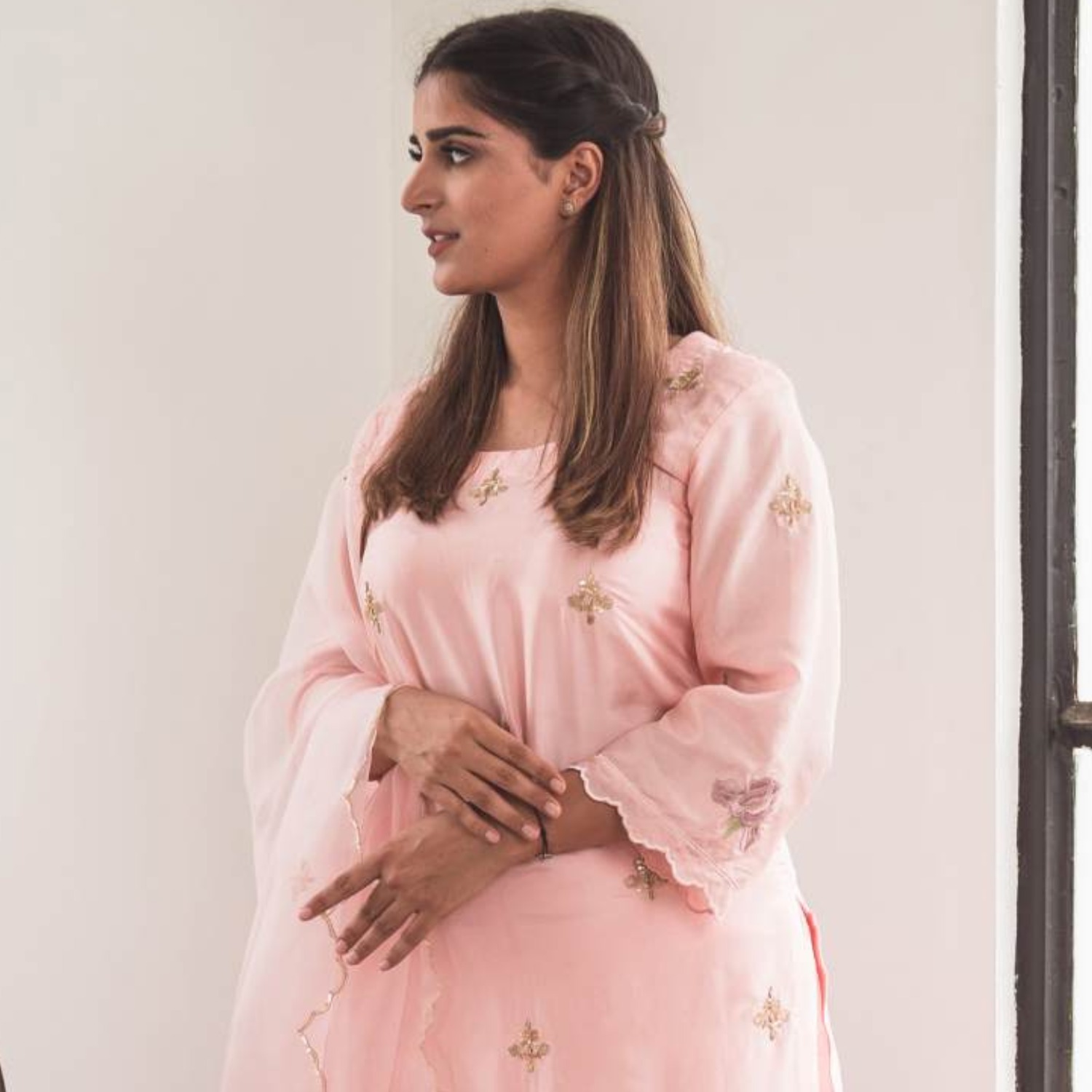 ₹ 22,400 (10% off)This set is crafted from pure silk and features a pale pink kurta with intricate cutwork embroidery at the ghera. Small motifs in gold sequins, scattered throughout the kurta and the matching dupatta, accentuate the outfit's timeless elegance. The set is completed with silk pants finished with subtle sequin handwork. Pair it with statement earrings and an embellished clutch for weddings or festivities.