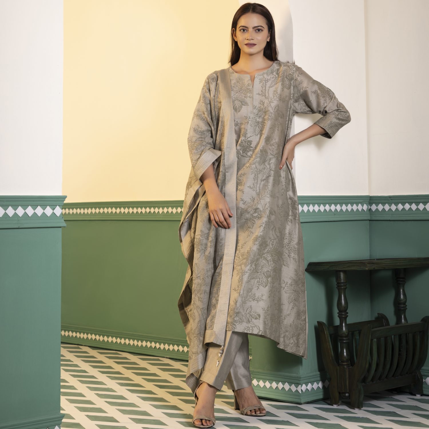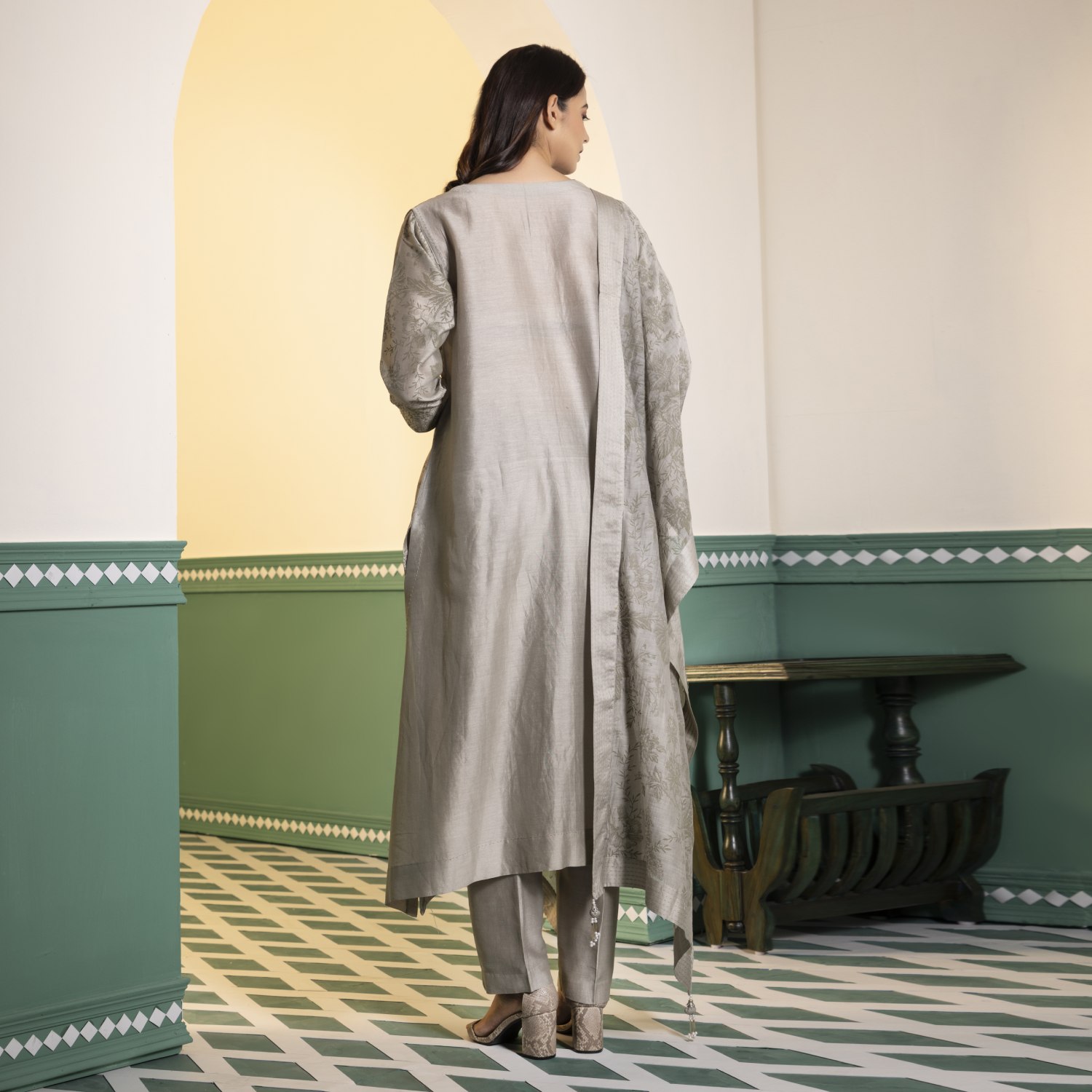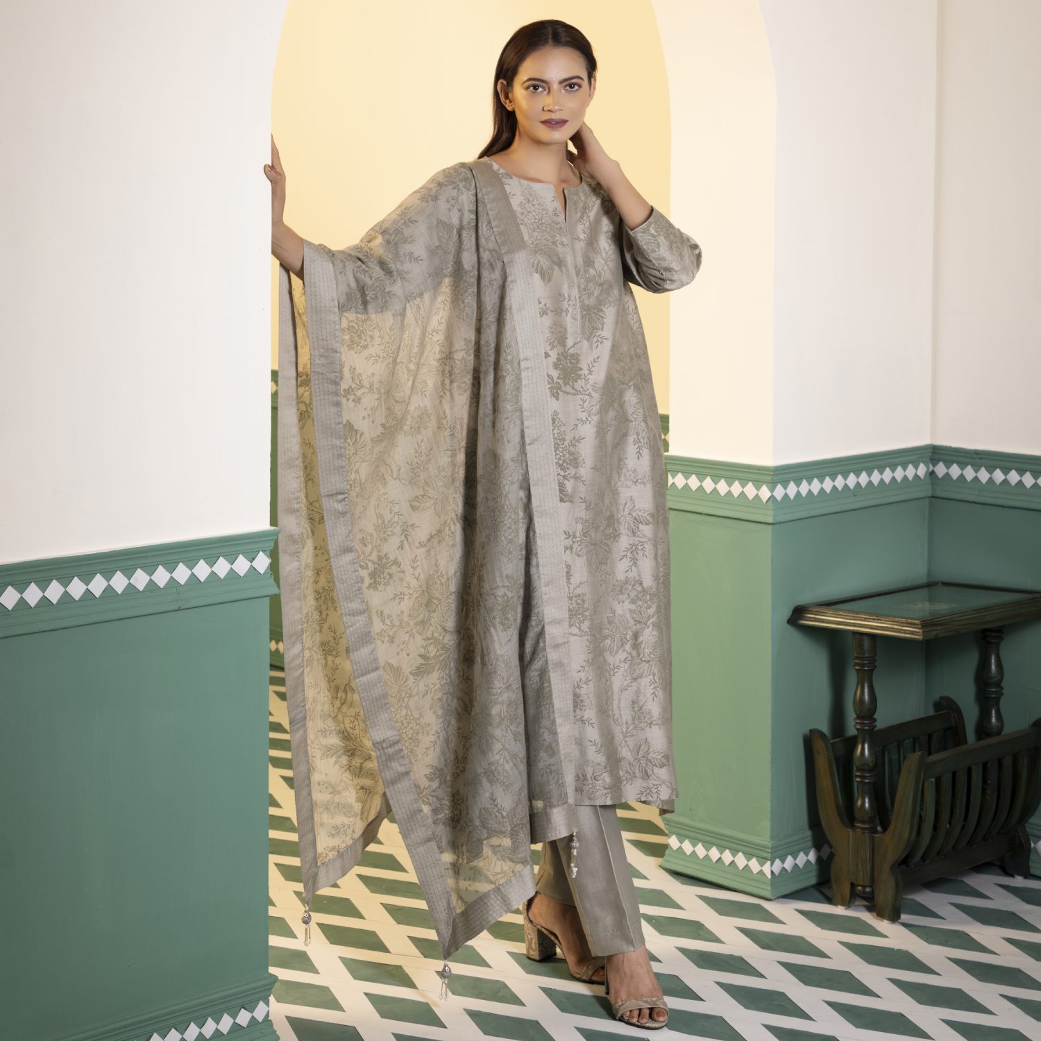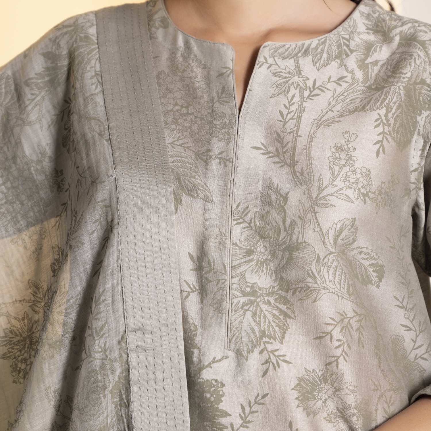 Discover the sheer elegance of our pastel green A-line printed kurta set, handcrafted from the finest screen printed chanderi silk. Featuring intricate chawal taka details interwoven within the enchanting print, this kurta set emanates a delicate and sophisticated charm.