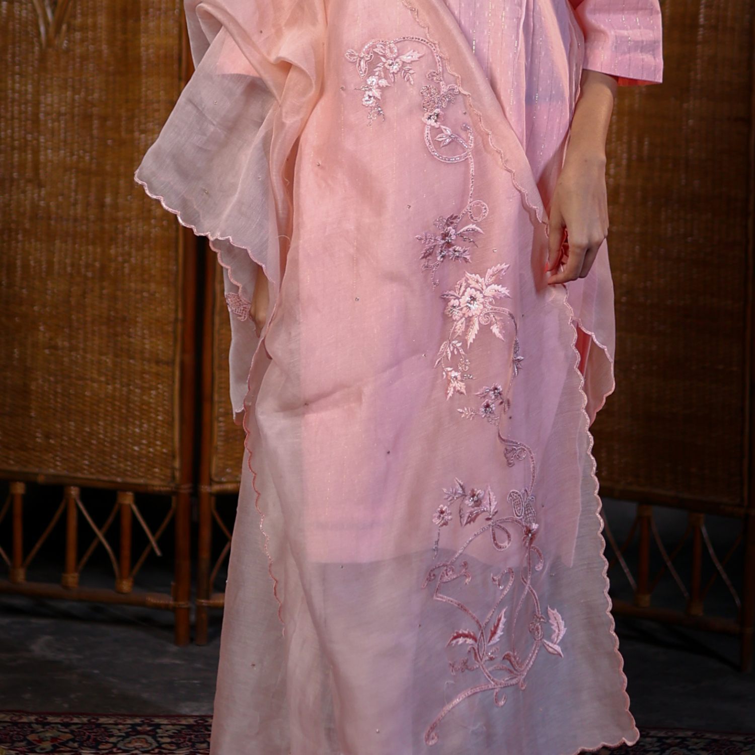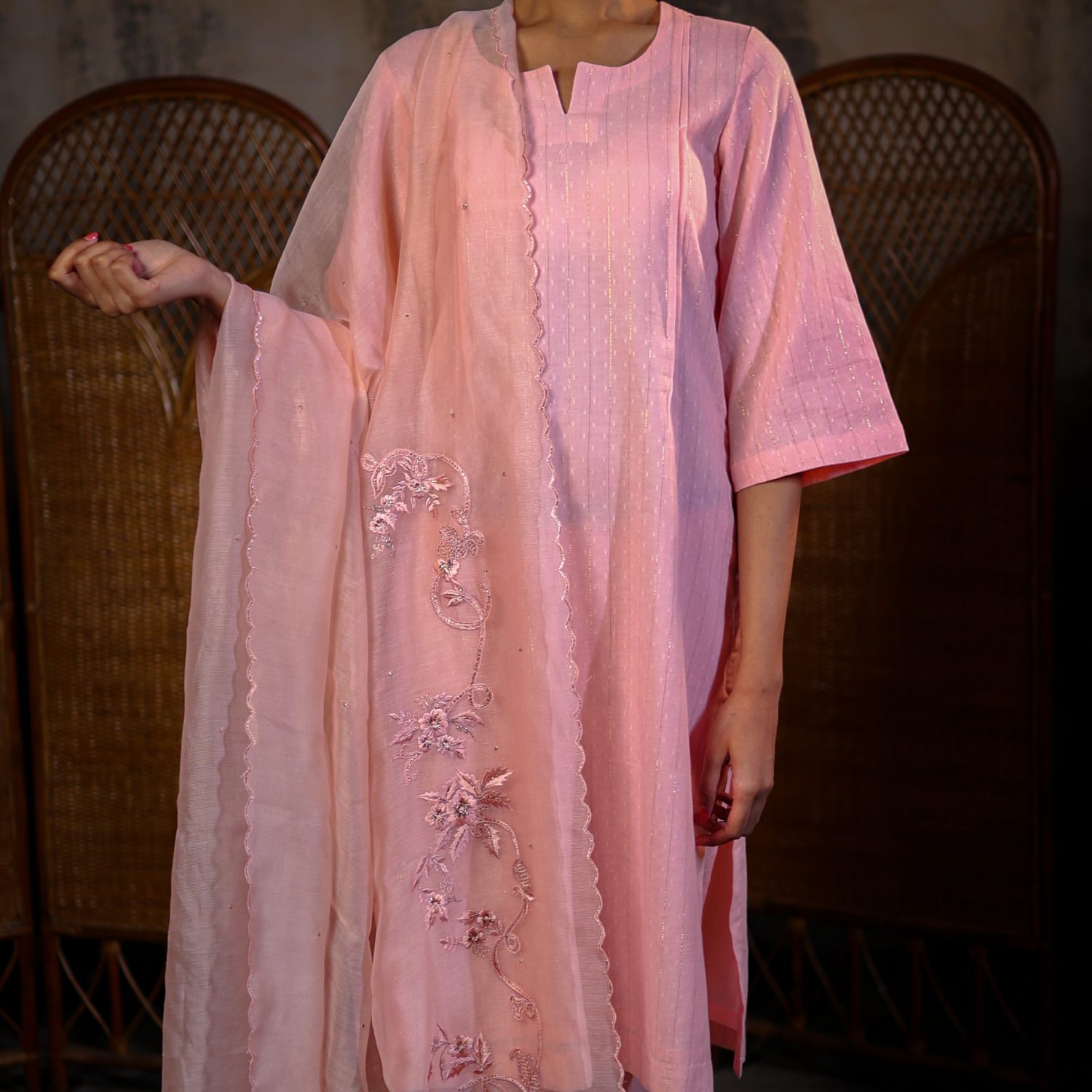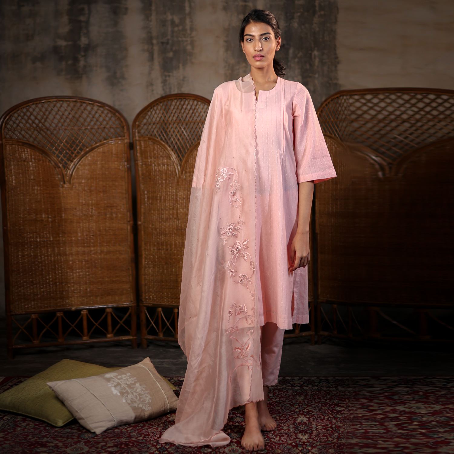 ₹ 9,520 (10% off)This peach kurta is adorned with gold woven lines and exudes understated elegance. Paired with matching pants featuring scalloped edges, this set offers a relaxed fit for ultimate comfort. The embroidered dupatta in the same self-color completes with grace and simplicity. Pair it with statement earrings and an embellished clutch for weddings or festivities.