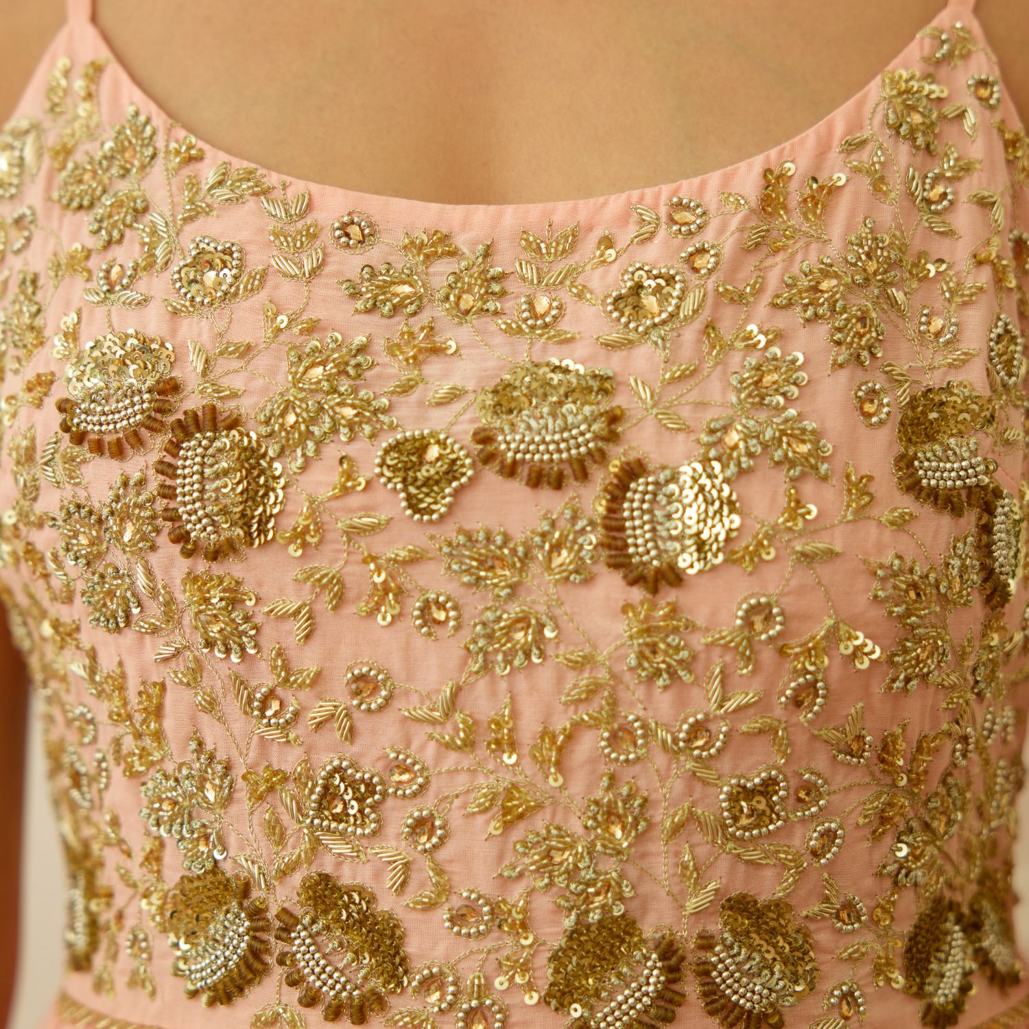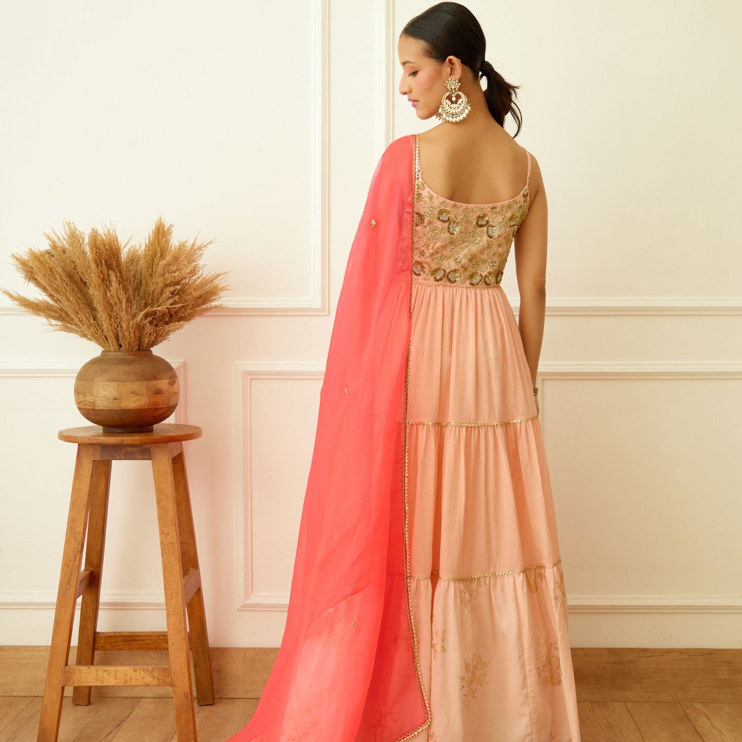 Dazzle in this peach cotton silk dabka and sequins zardosi embroidered kalidar. Its exquisite craftsmanship radiates charm. Paired with a hot pink pure silk organza dupatta, this ensemble epitomizes elegance. Make a striking statement at any event with this captivating fusion of traditional artistry and modern allure.