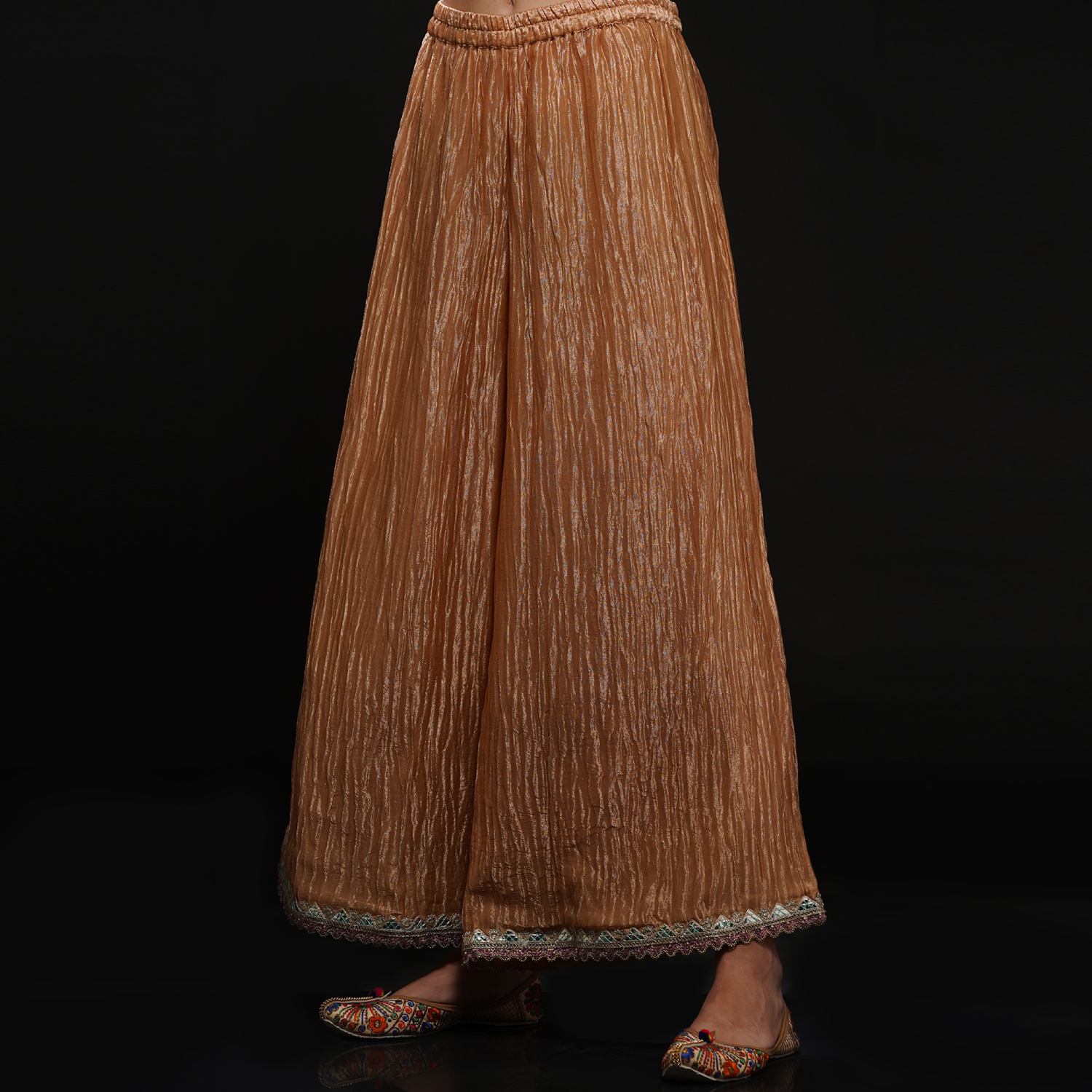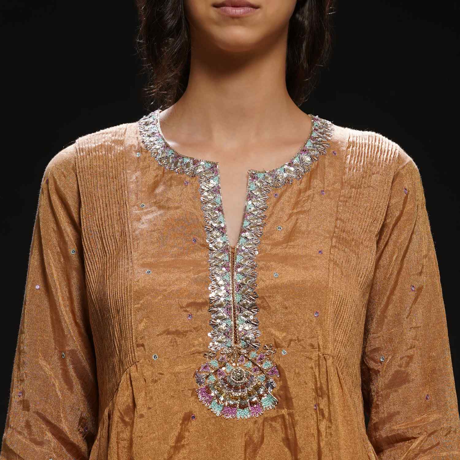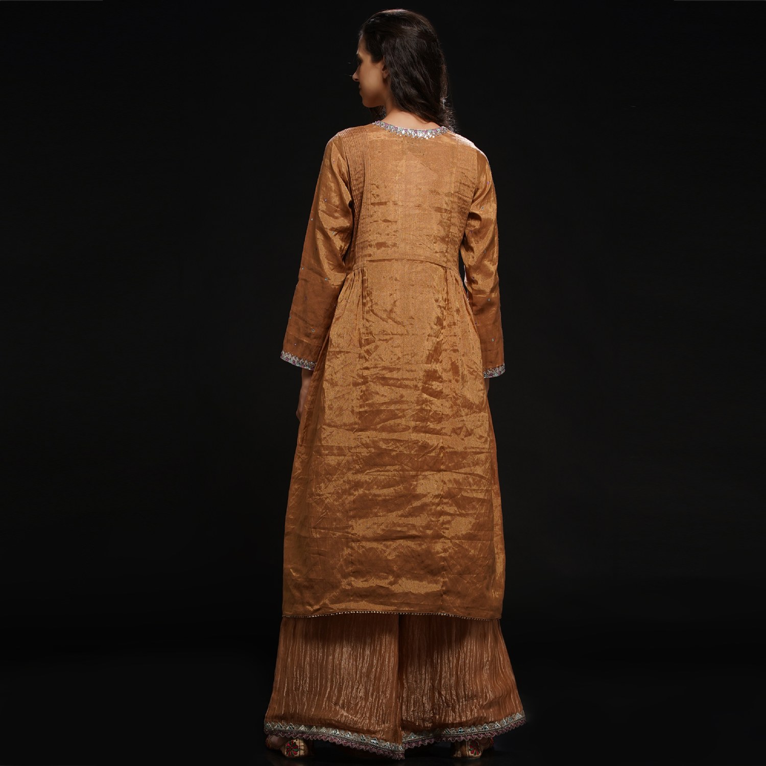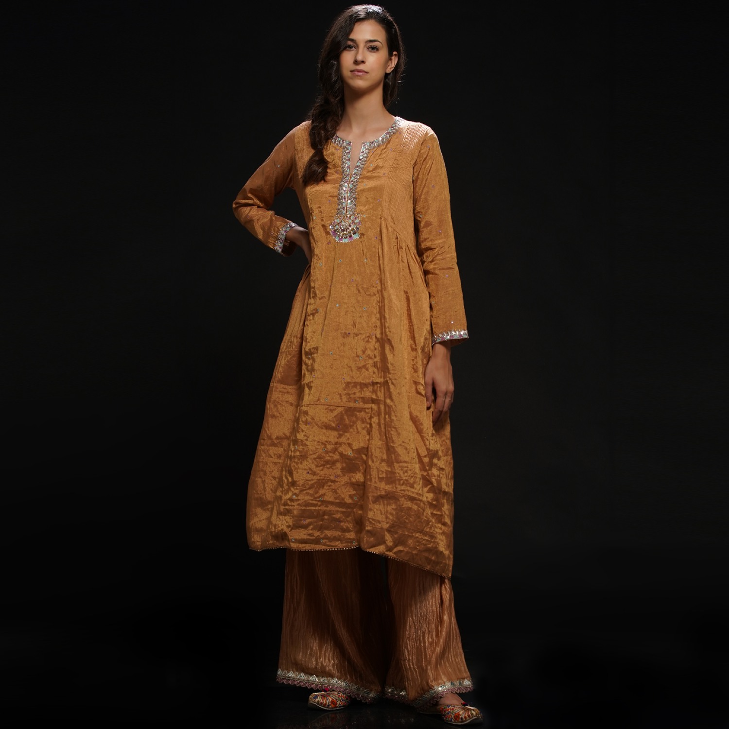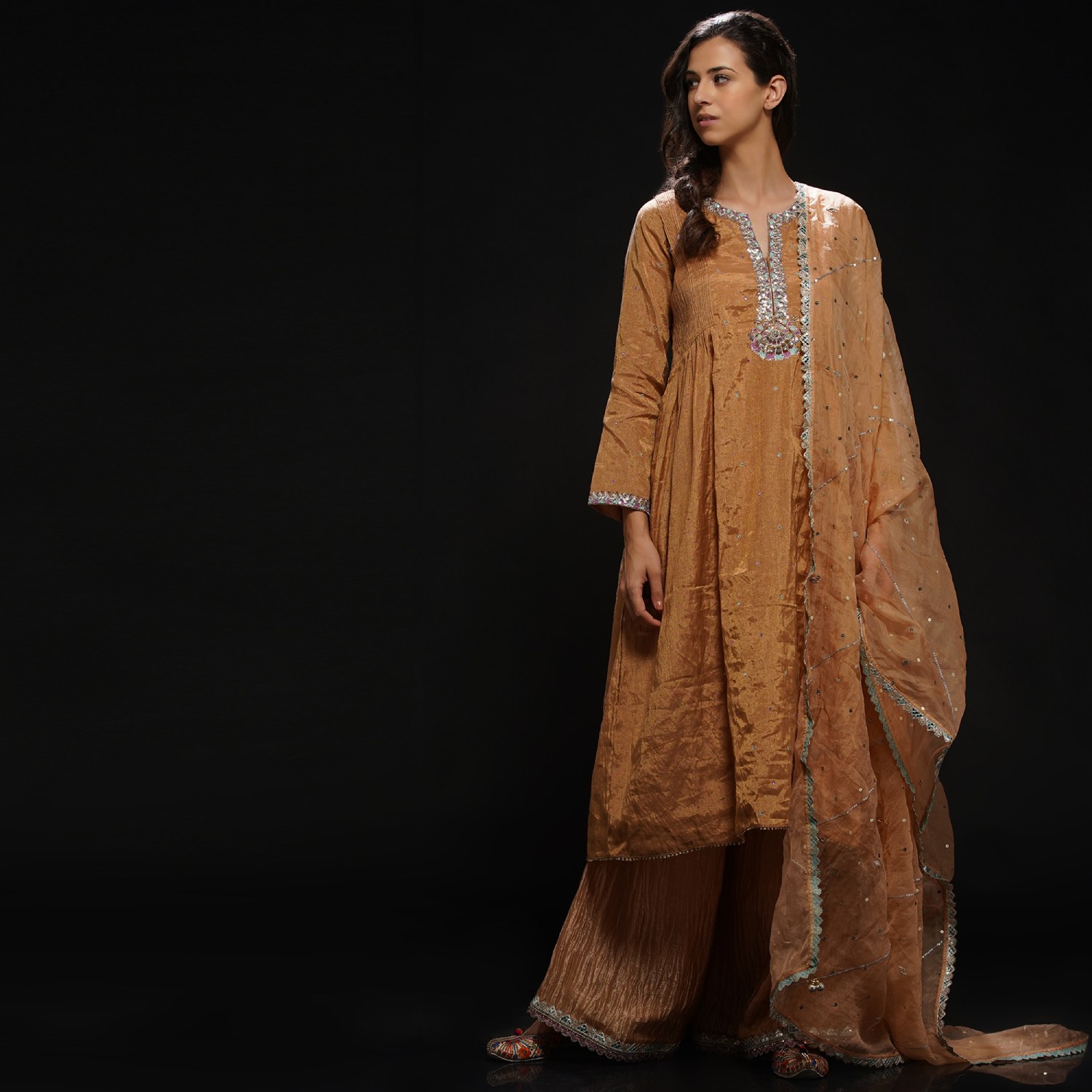 ₹ 21,500 (10% off)This beautiful peach set features an A-line pleated kurta, meticulously hand-embroidered with a blend of dabka, silk thread, and tikki work. Paired with the kurta are palazzo bottoms, which beautifully complement the outfit. The set is completed with a silk organza dupatta with hand embroidery, offering elegance. Pair this outfit with silver jewellery and strappy heels for weddings and festivities.
