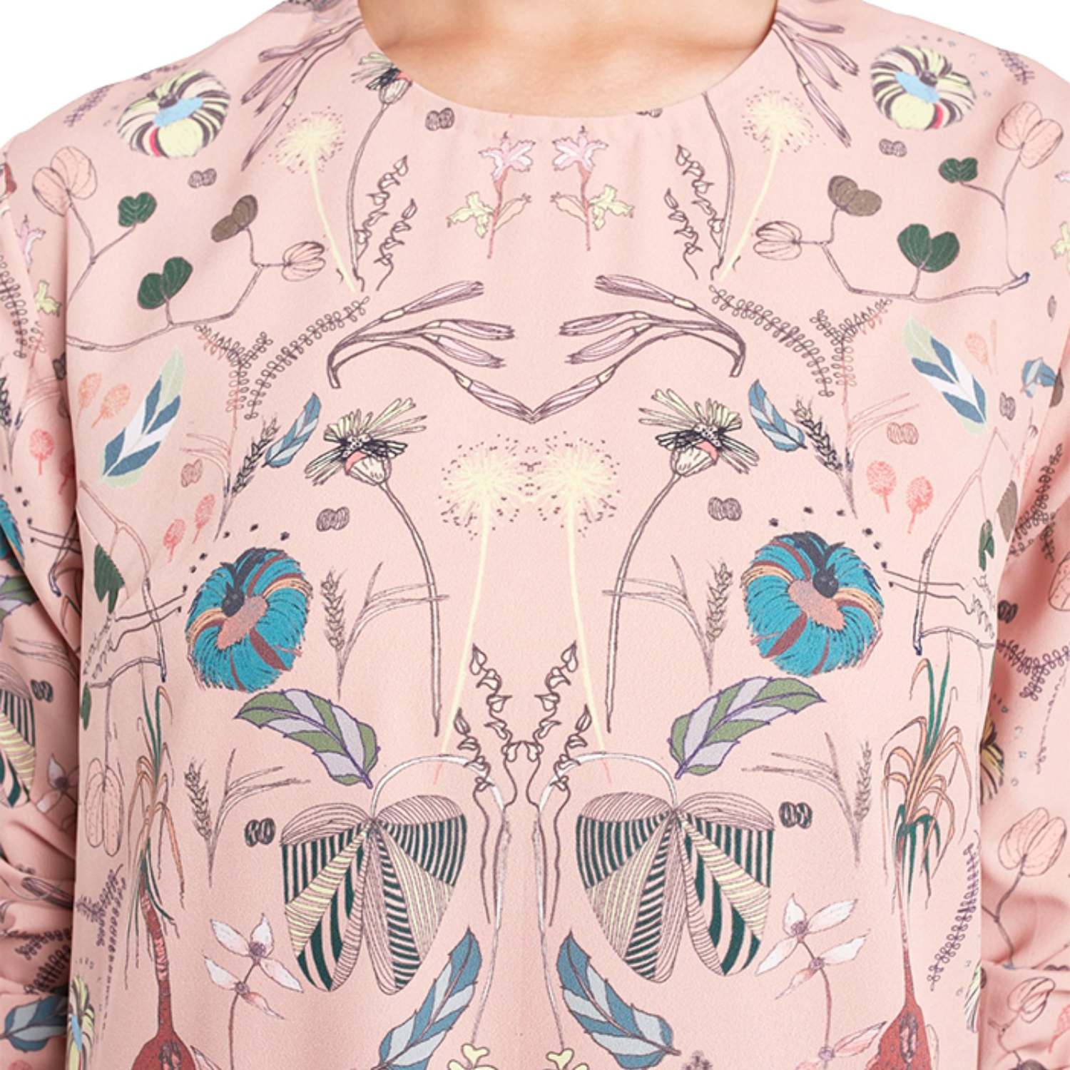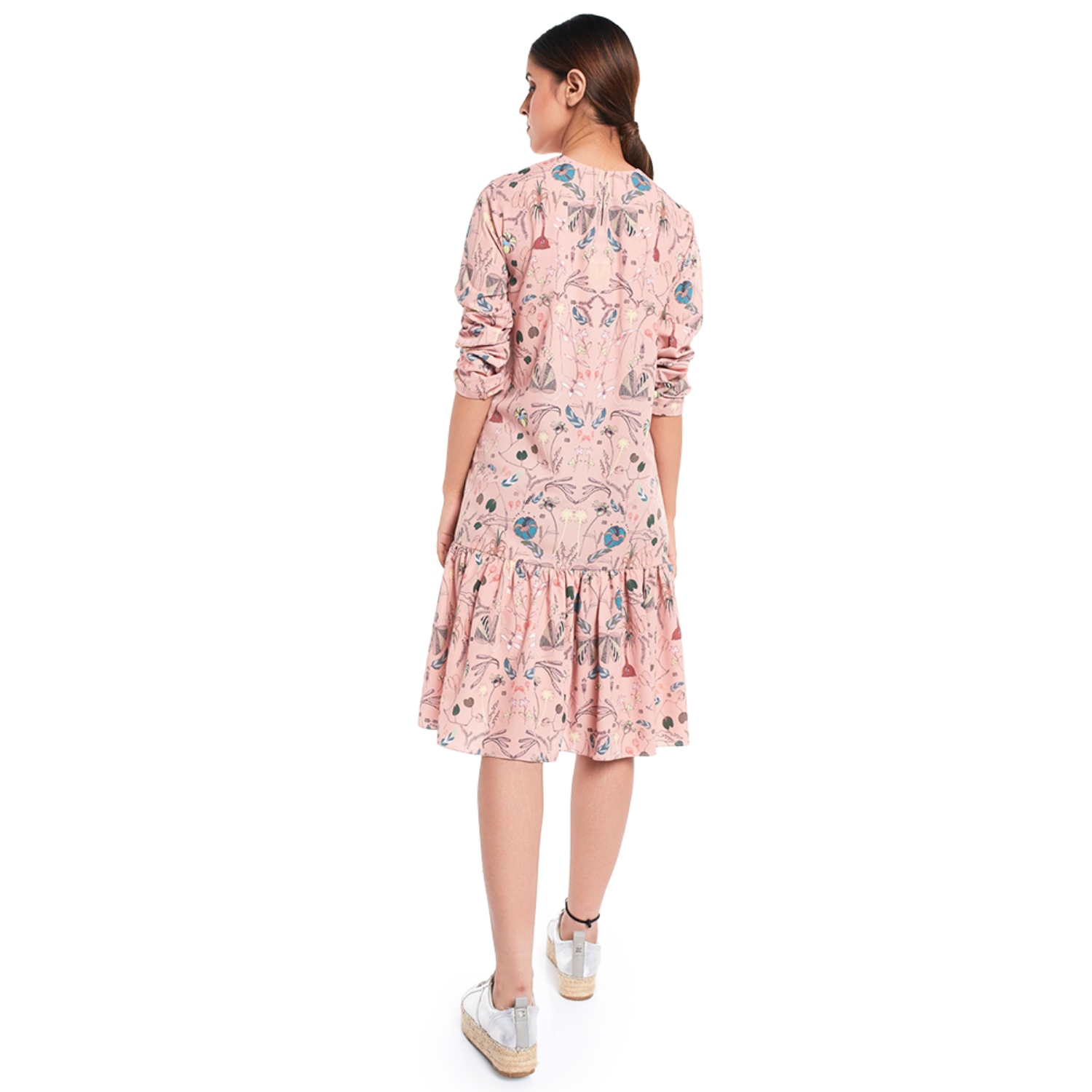 Crafted in high-quality crepe fabric, this tunic comes in a soft peach shade with a contrasting print. This tunic features a stunning forest print, 3/4th sleeves and a frill hem, adding playfulness to the outfit. Style it with strappy heels and a sling bag for a dress day out.