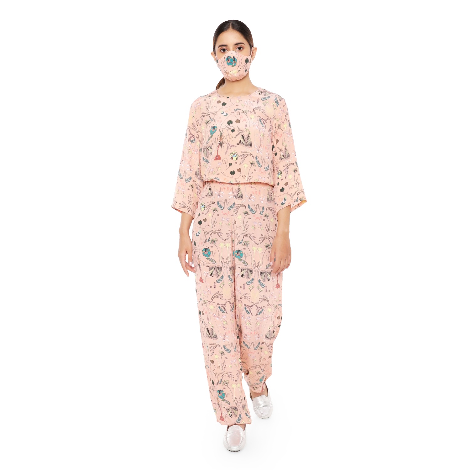 This gorgeous set features a peach forest printed crepe top and jogger pants. The jogger pants provide a comfortable and modern style. The set comes with a peach and eggplant forest-printed reversible 3-ply mask. The set includes a matching pouch and hairband, making it a complete outfit.