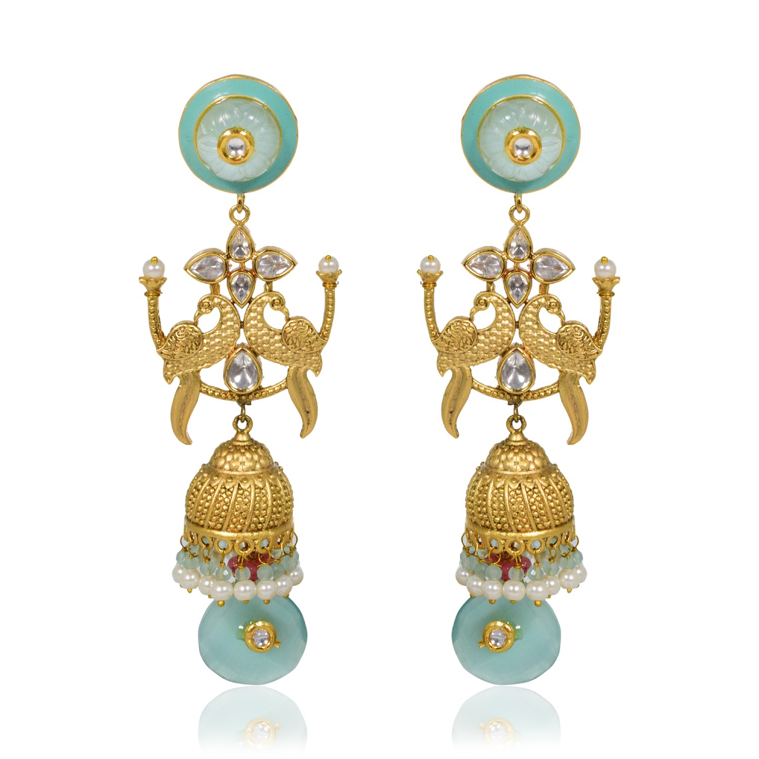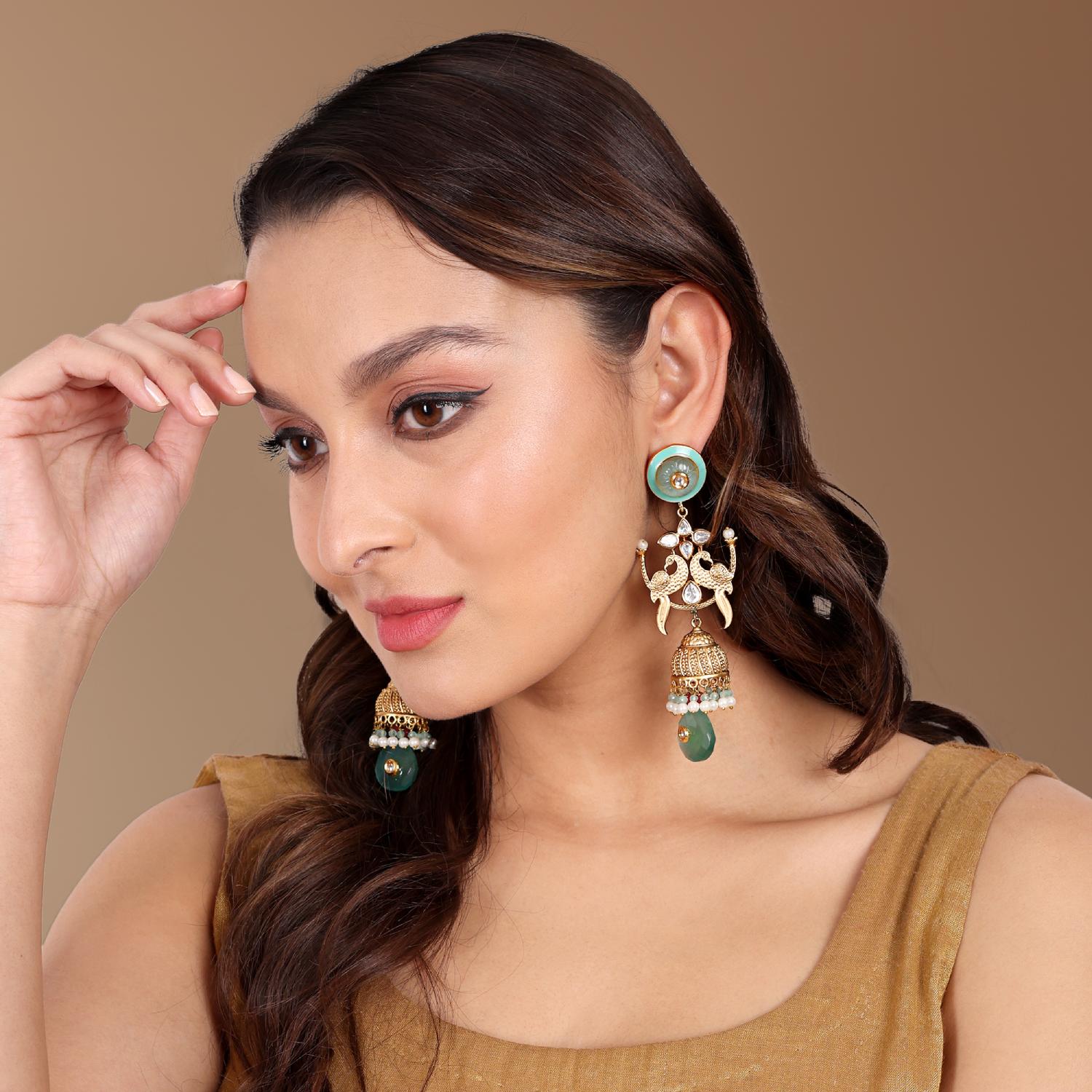 ₹ 6,750 (10% off)Unleash your inner beauty with tizora's stunning peacock handcrafted earrings. Featuring blue carving stones, kundan, and pearls on a 22kt gold-plated mixed metal base, it embodies the fusion of traditional and contemporary designs.