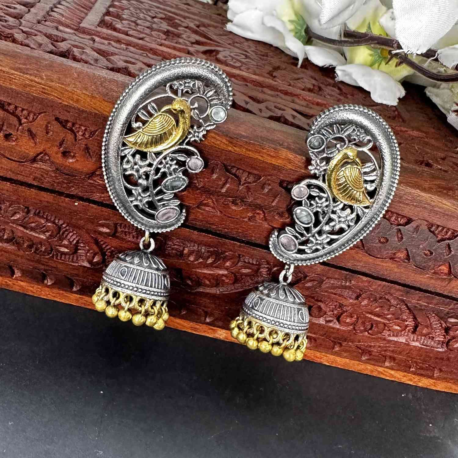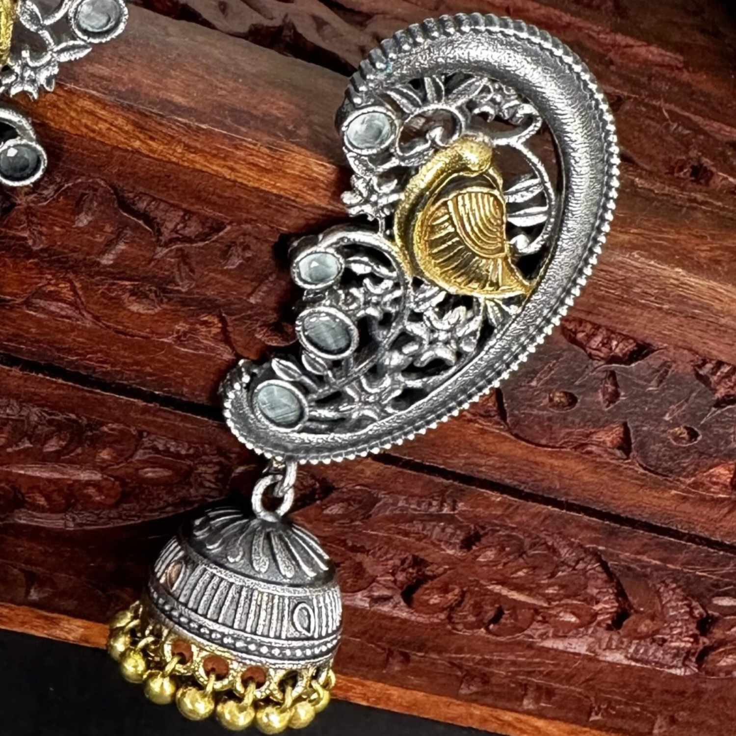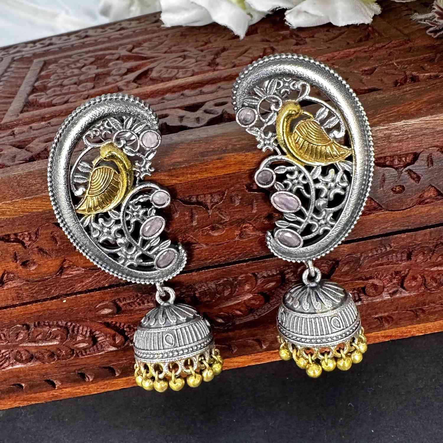 The peacock oxidised jhumka earring is a must-have in your collection, boasting a beautiful silver polish and intricate handwork. These earrings stand out, making a bold statement and providing the perfect finishing touch to any outfit. Elevate your style with this unique piece that effortlessly combines elegance and charm for a stunning look.