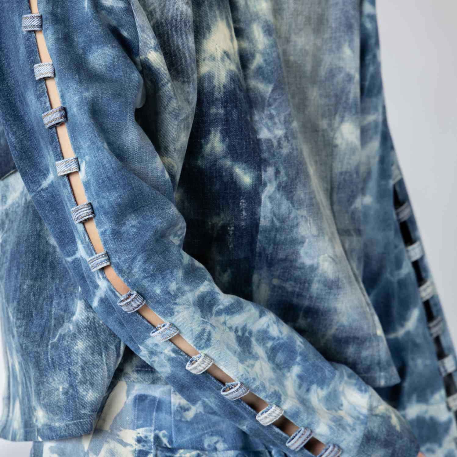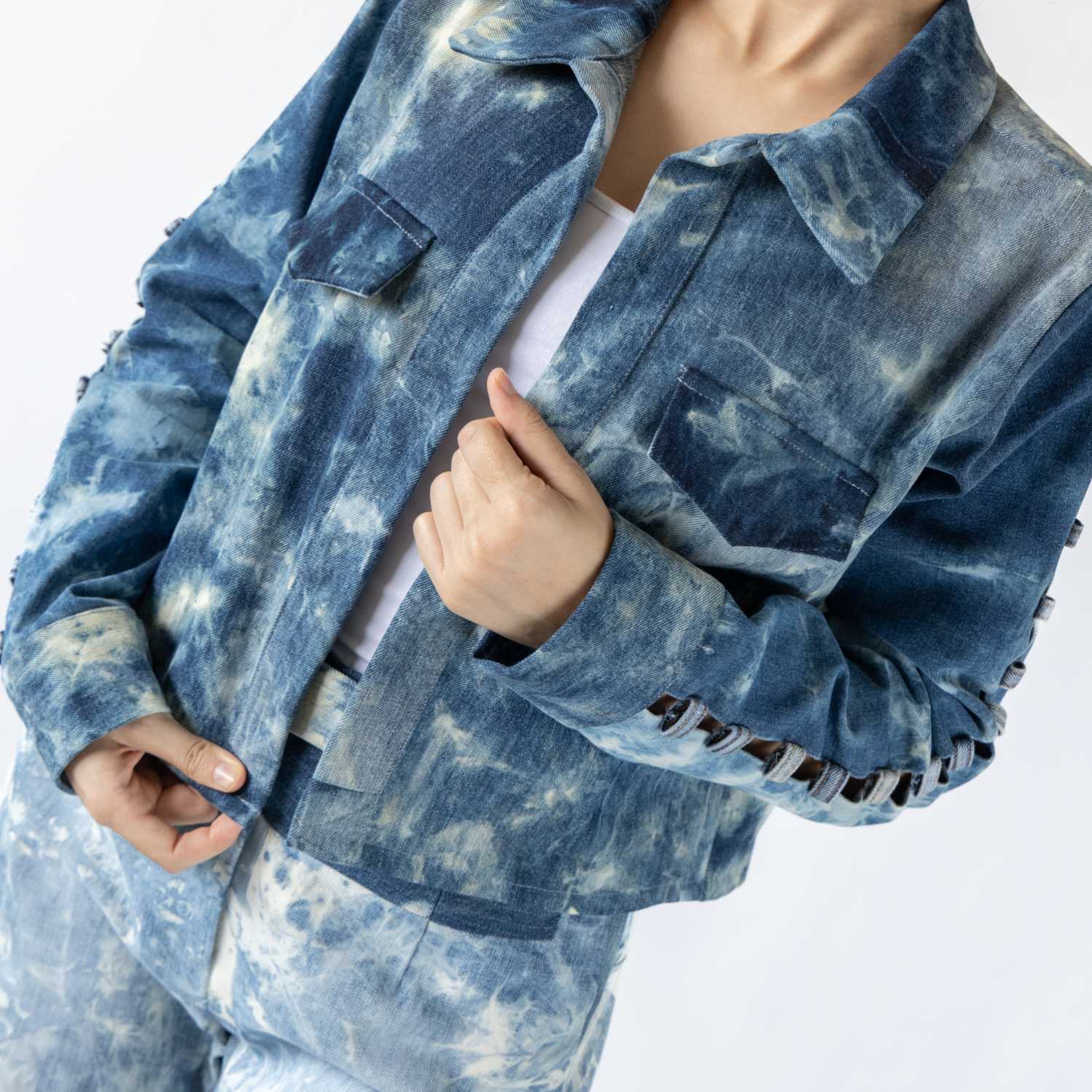 It's time to elevate your layering game with this blue denim oversized jacket. This jacket was crafted by upcycling three different pairs of jeans. Style it with statement silver hoops and heels for a dressy event.