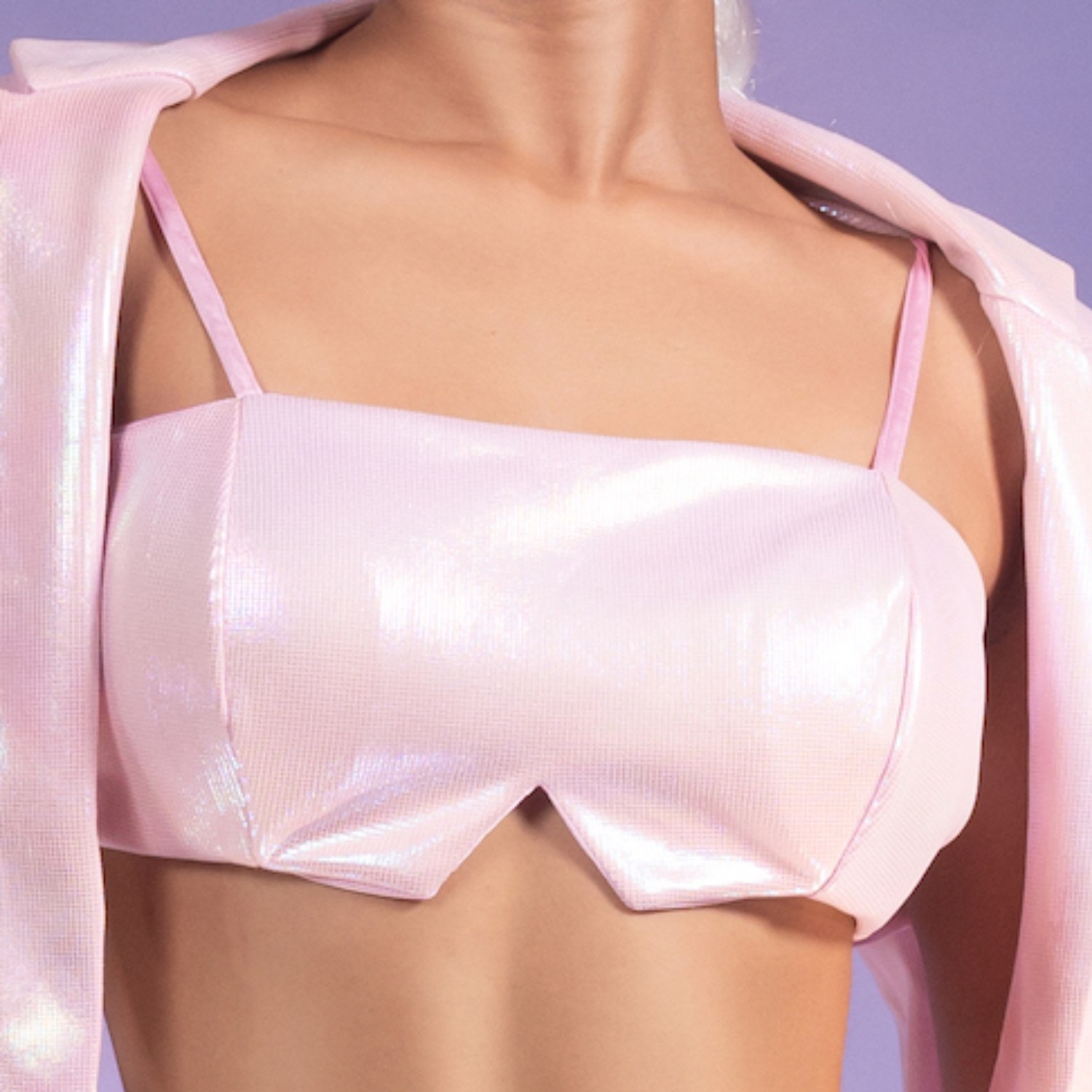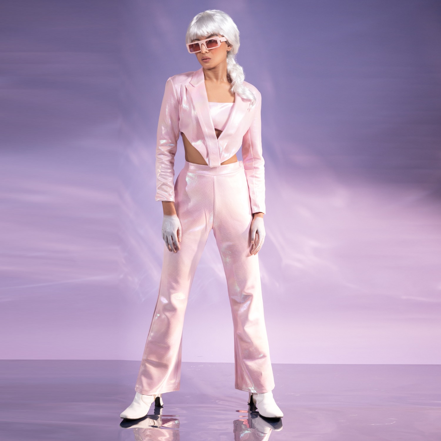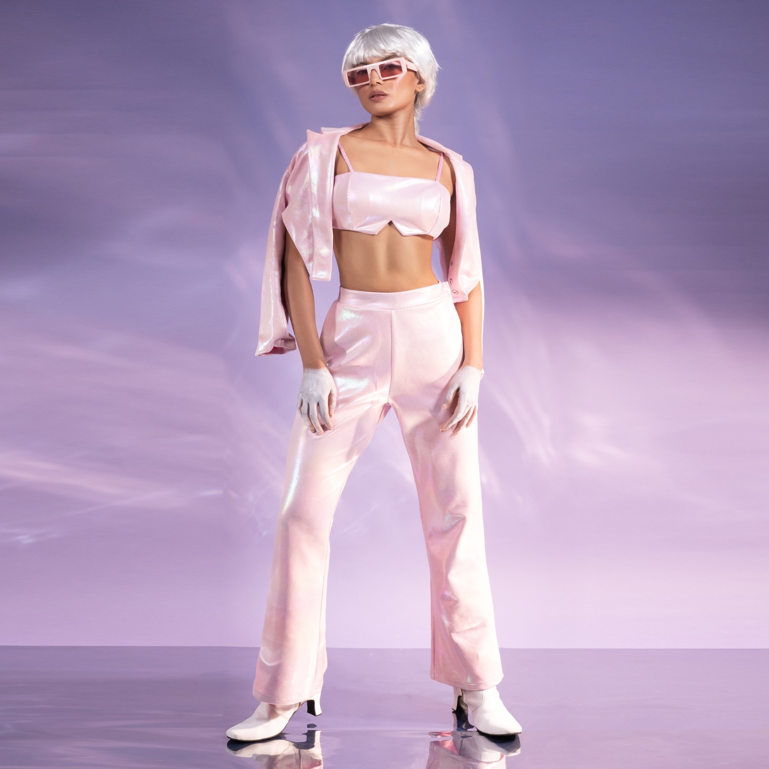 Elevate your style with our piggy bling co-ord set. Crafted from rich sheen fabric, this three-piece ensemble exudes sophistication. The cropped blazer, with its lapel collar and detailed sleeves, perfectly complements the cupped crop top. Complete the polished look with our matching bell-bottom, featuring an elasticated waist for comfort.