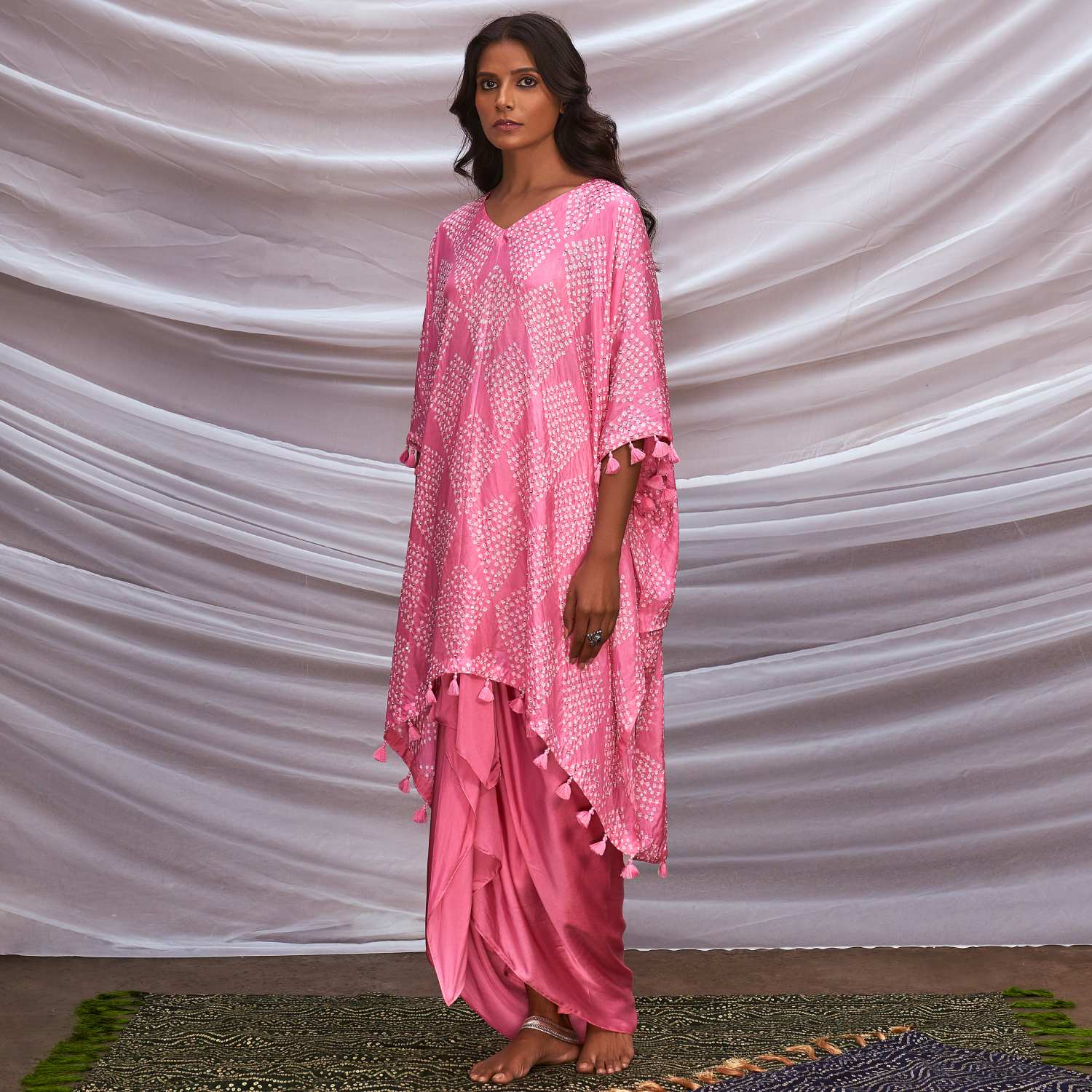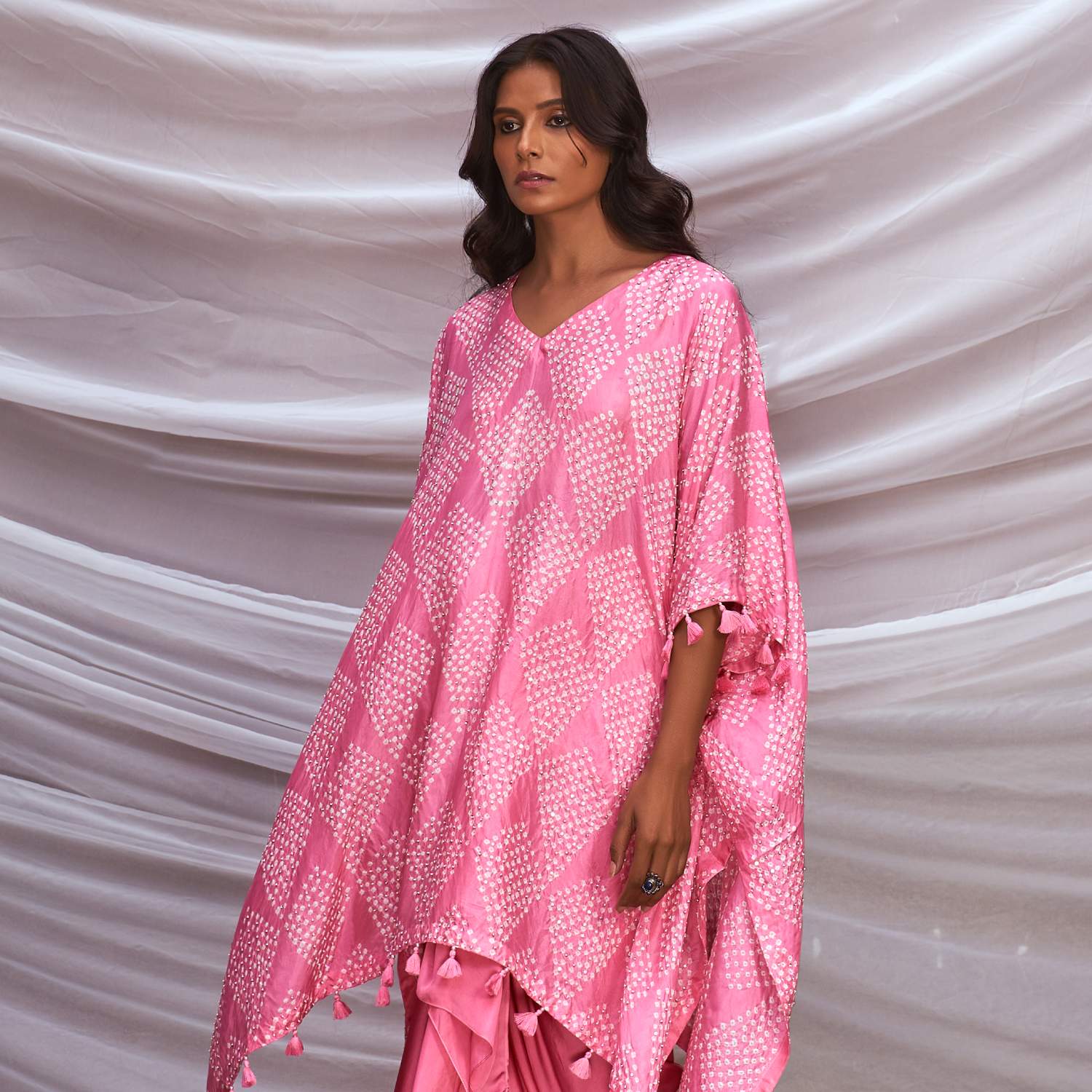 This stunning set comprises a kaftan and draped skirt with sequins and pearl embroidery crafted from luxurious silk. The kaftan features bandhani dots in a kite pattern and tassel detailing on the hemline and sleeves, offering playfulness. Style it with delicate jewellery and strappy sandals for weddings and festivities.