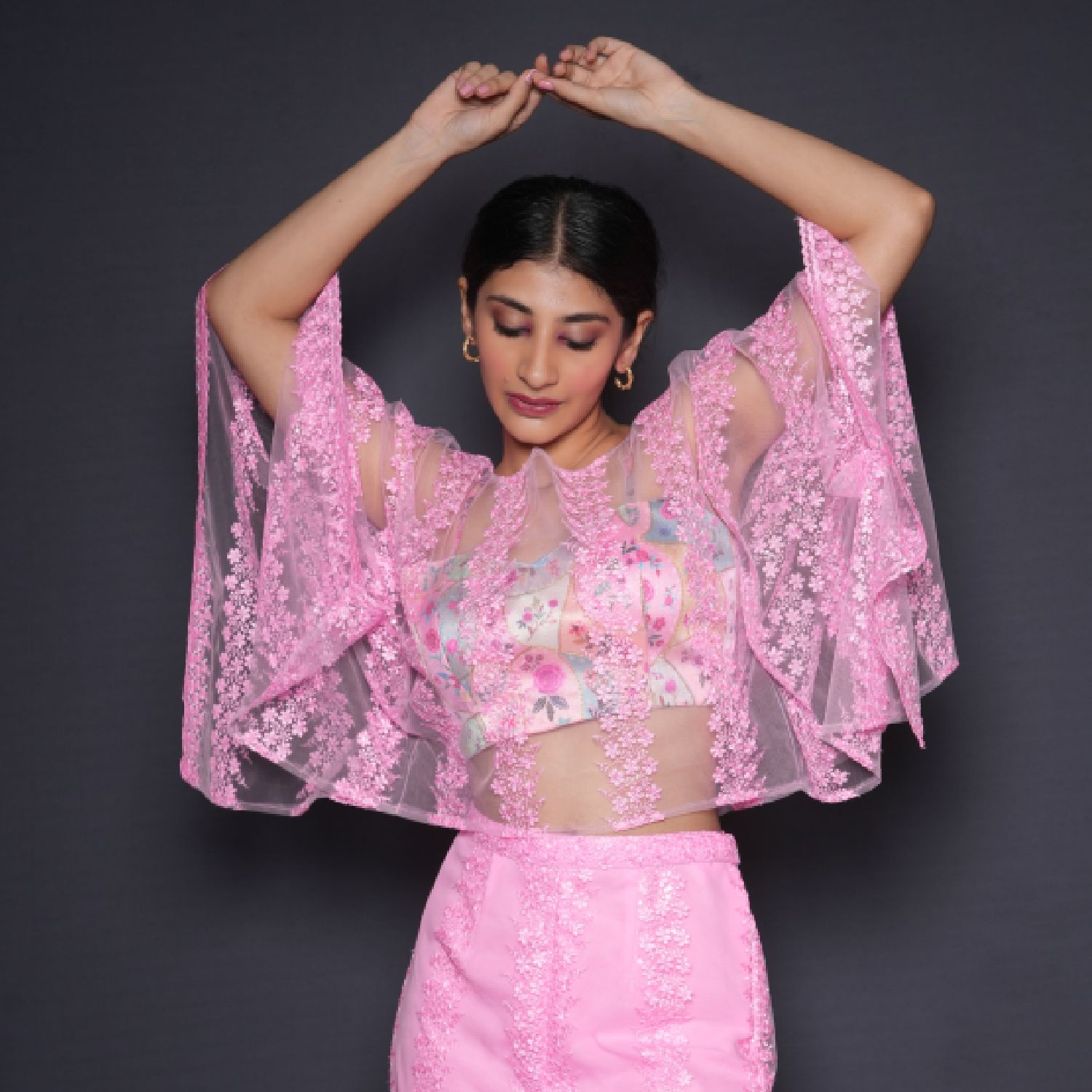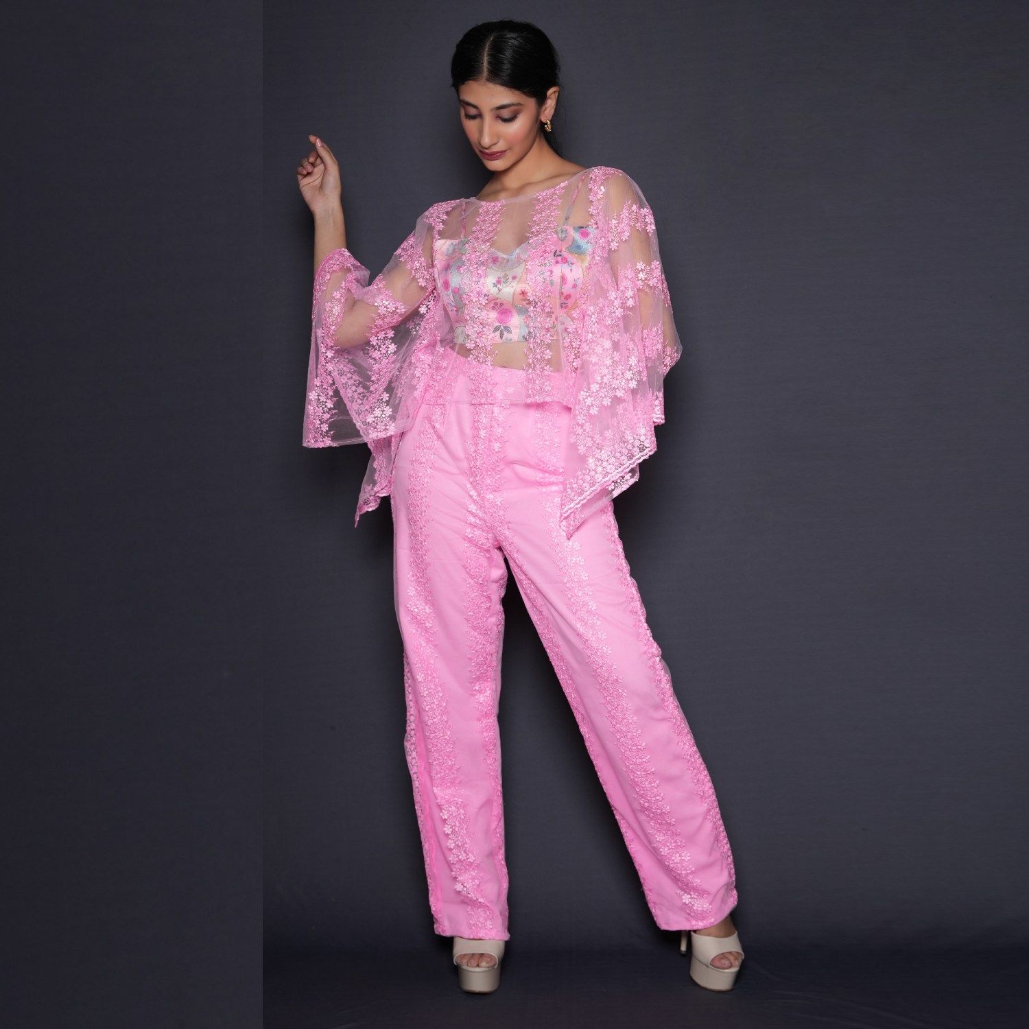 This beautiful pink set features a net cape, floral printed phantom blouse, and high-waisted pants. The short-length cape is made of net fabric and is adorned with sequin embellishments that catch the light beautifully. Pair it with statement earrings, heels, and a sling bag for weddings or festivities.