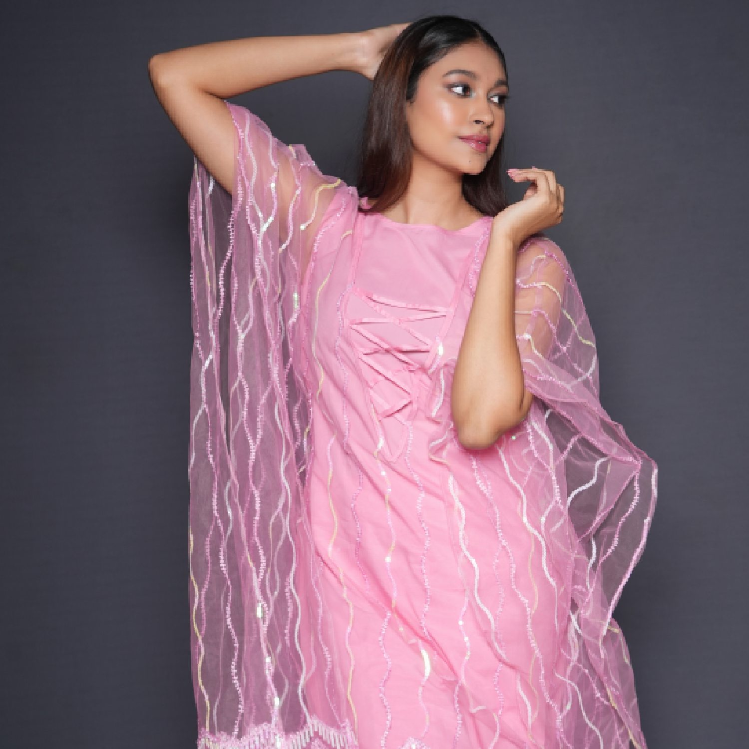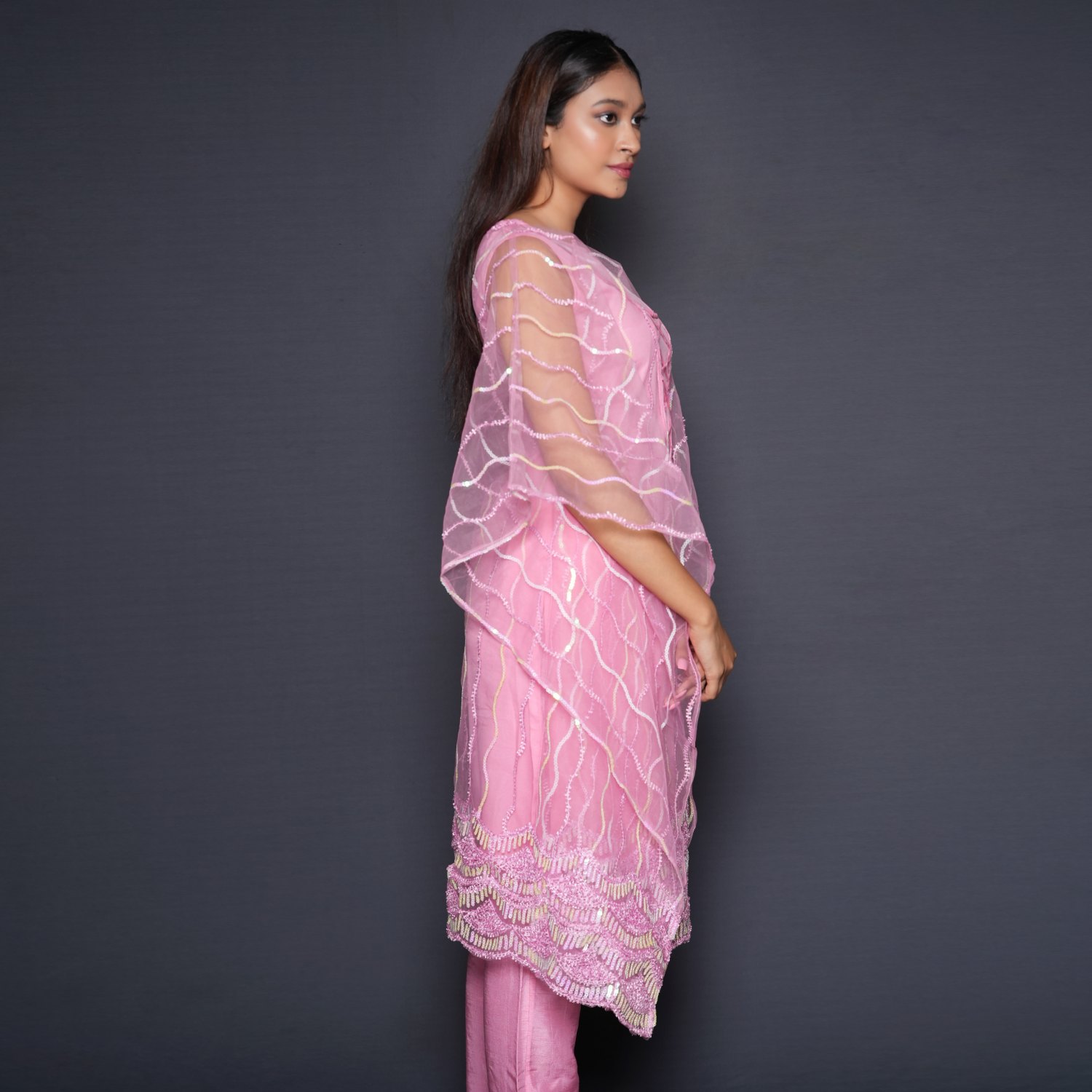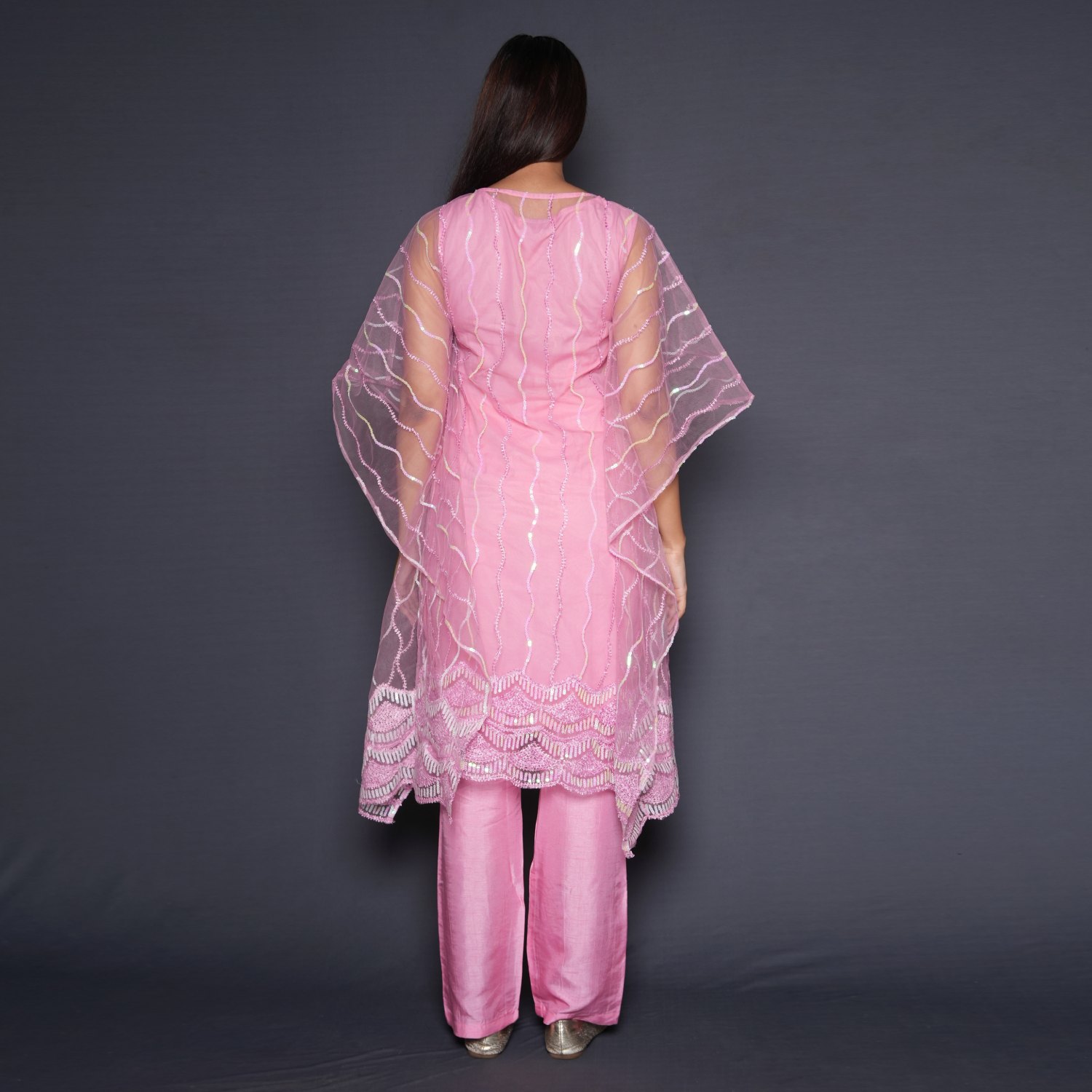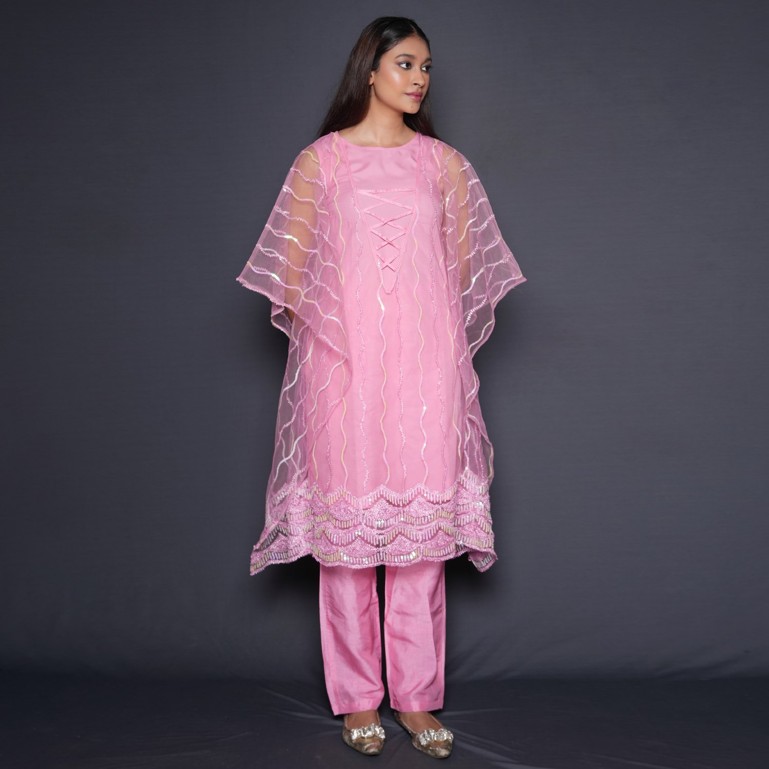 This beautiful kaftan is designed with intricate embellishments on net fabric, creating a luxurious and elegant look. Its relaxed fit and flowy design make it comfortable to wear. The raw silk straight-fit pants complement the kaftan and the crepe inner completes the look. Style it with minimal jewellery and heels for a dressy event.