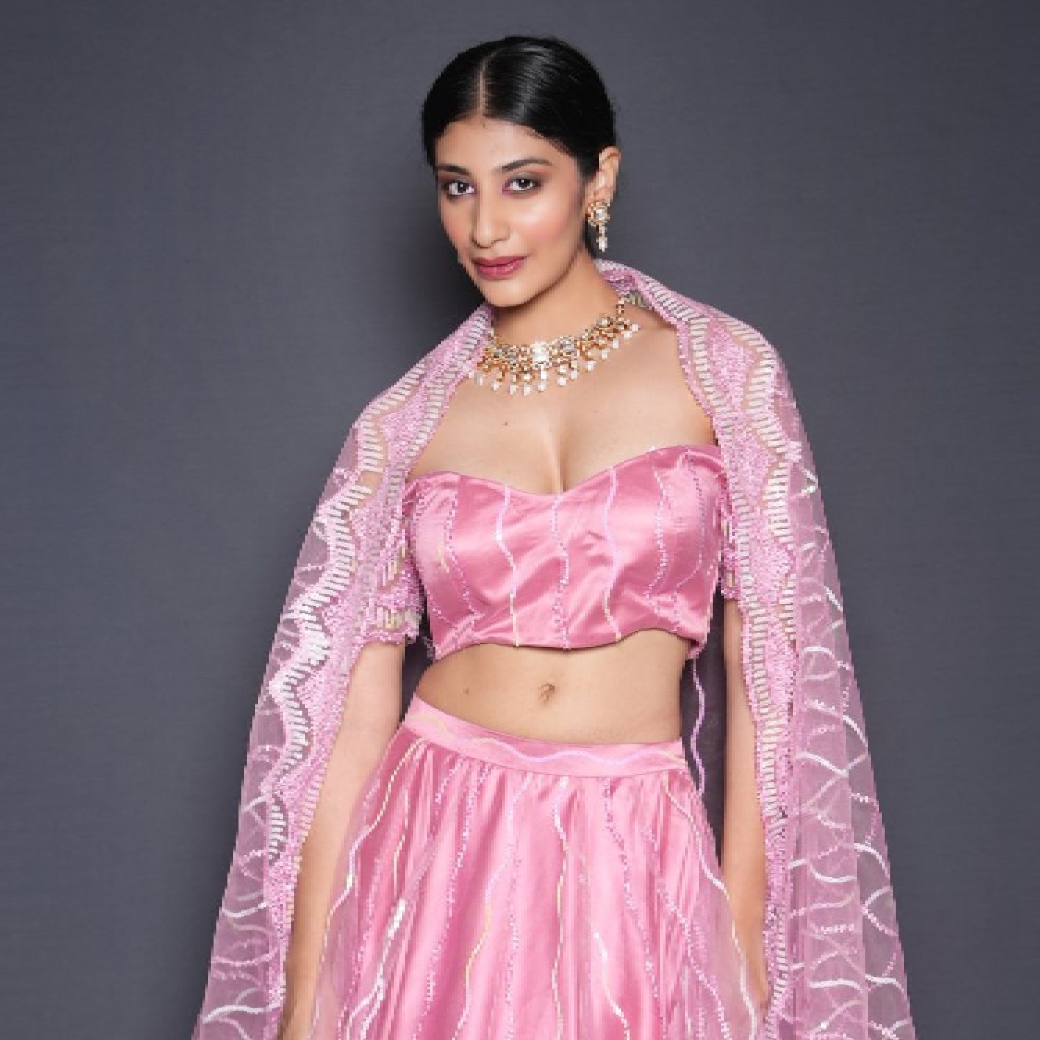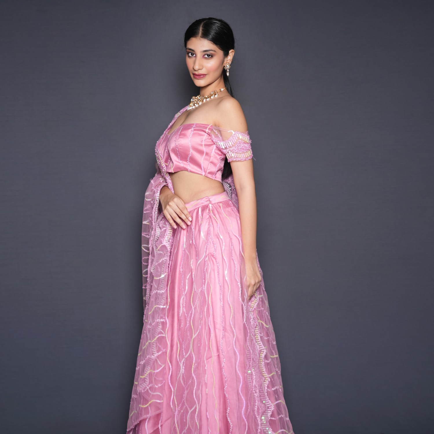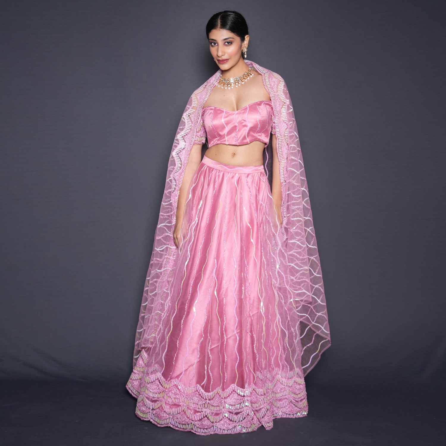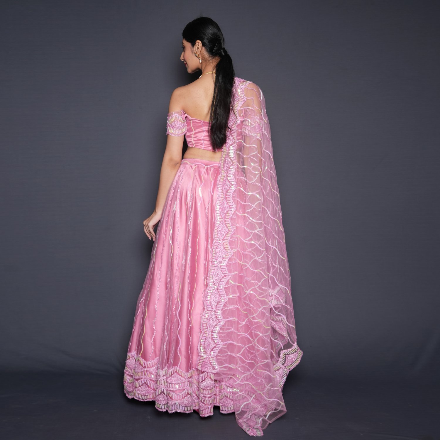 This beautiful pink set features an embellished net lehenga, a matching blouse, and a dupatta. The lehenga is heavily embellished and features a wide bordered hemline, creating a grand and regal look. The blouse is designed with an off-shoulder style and a sweetheart neckline, complementing the lehenga beautifully. Pair it with statement earrings and a clutch for weddings or festivities.