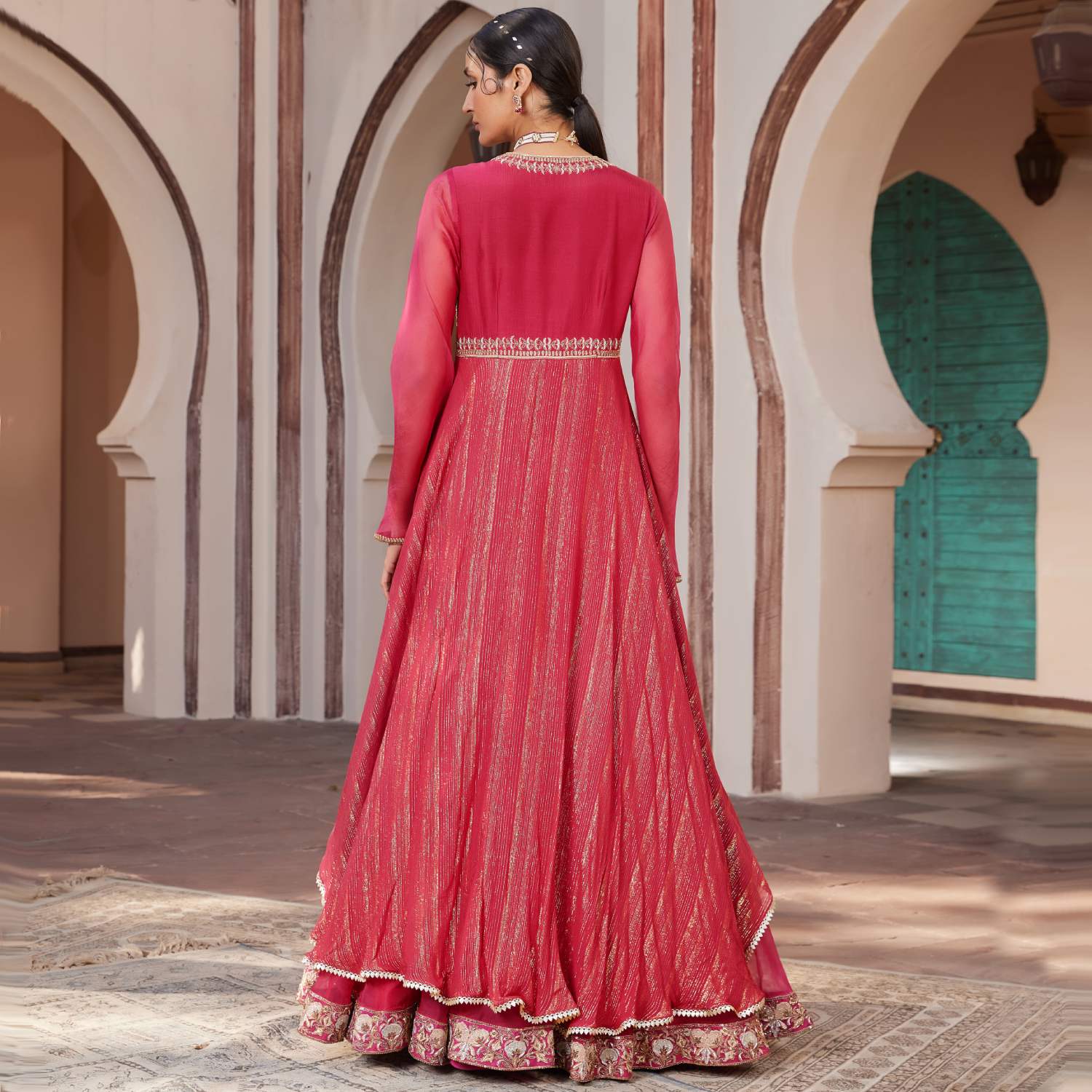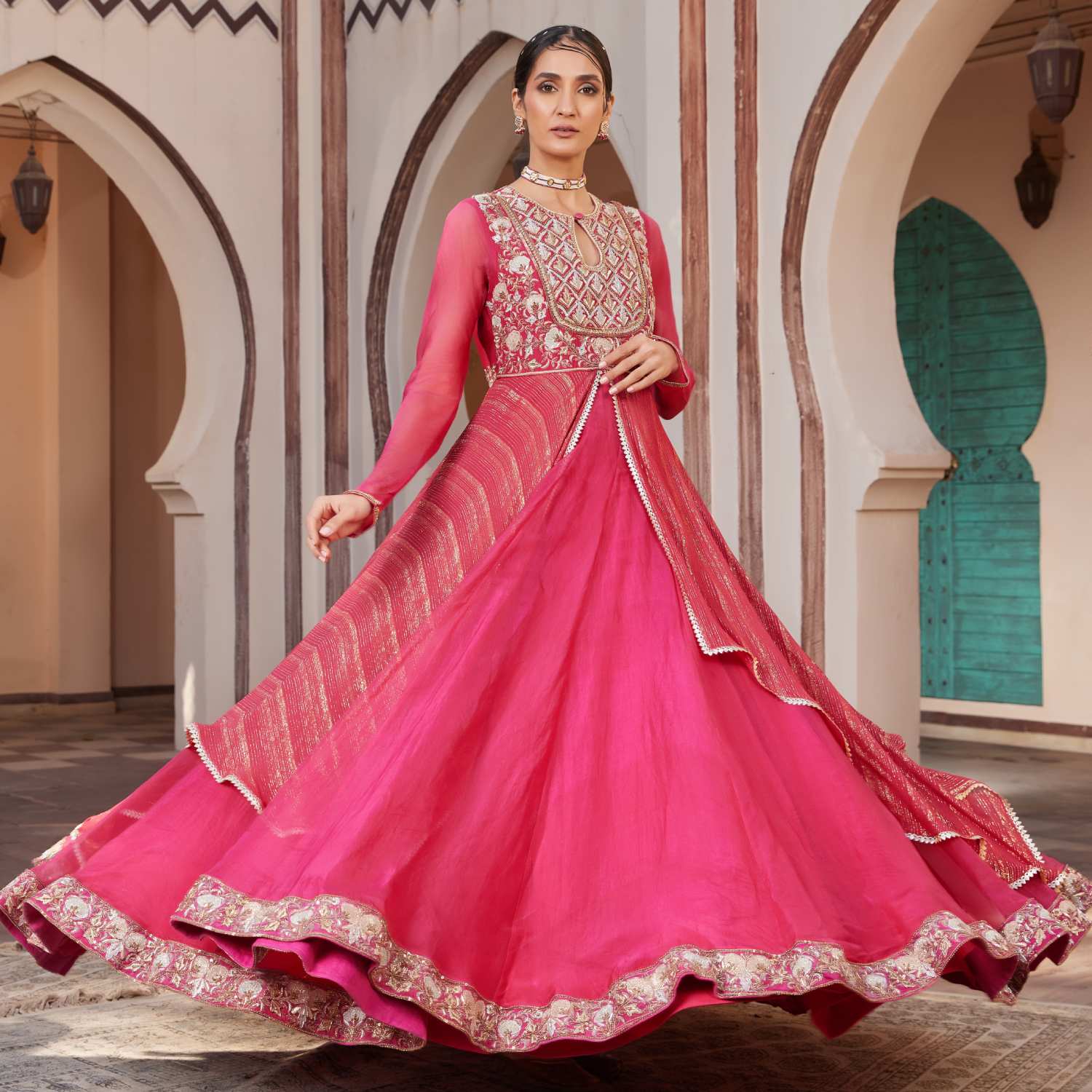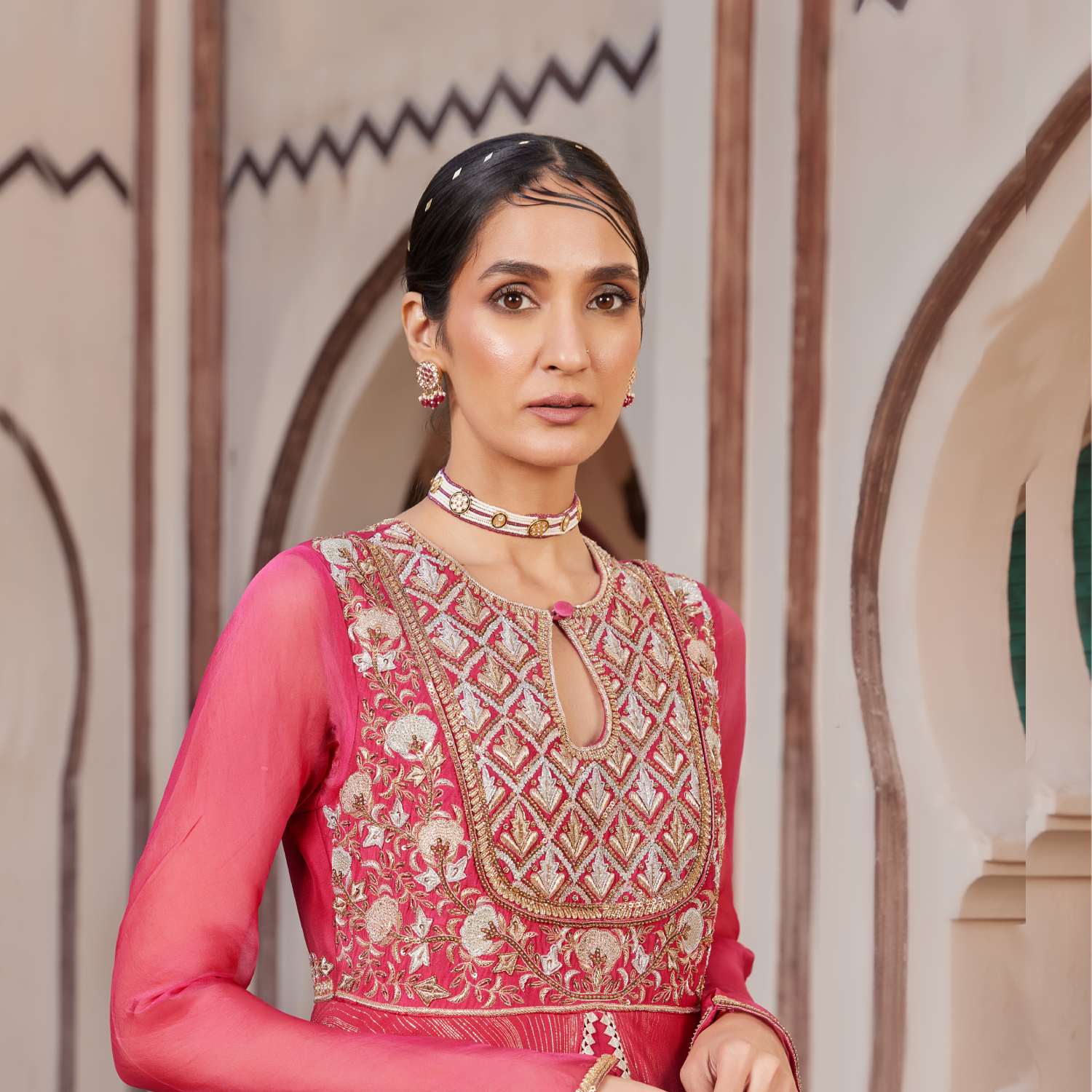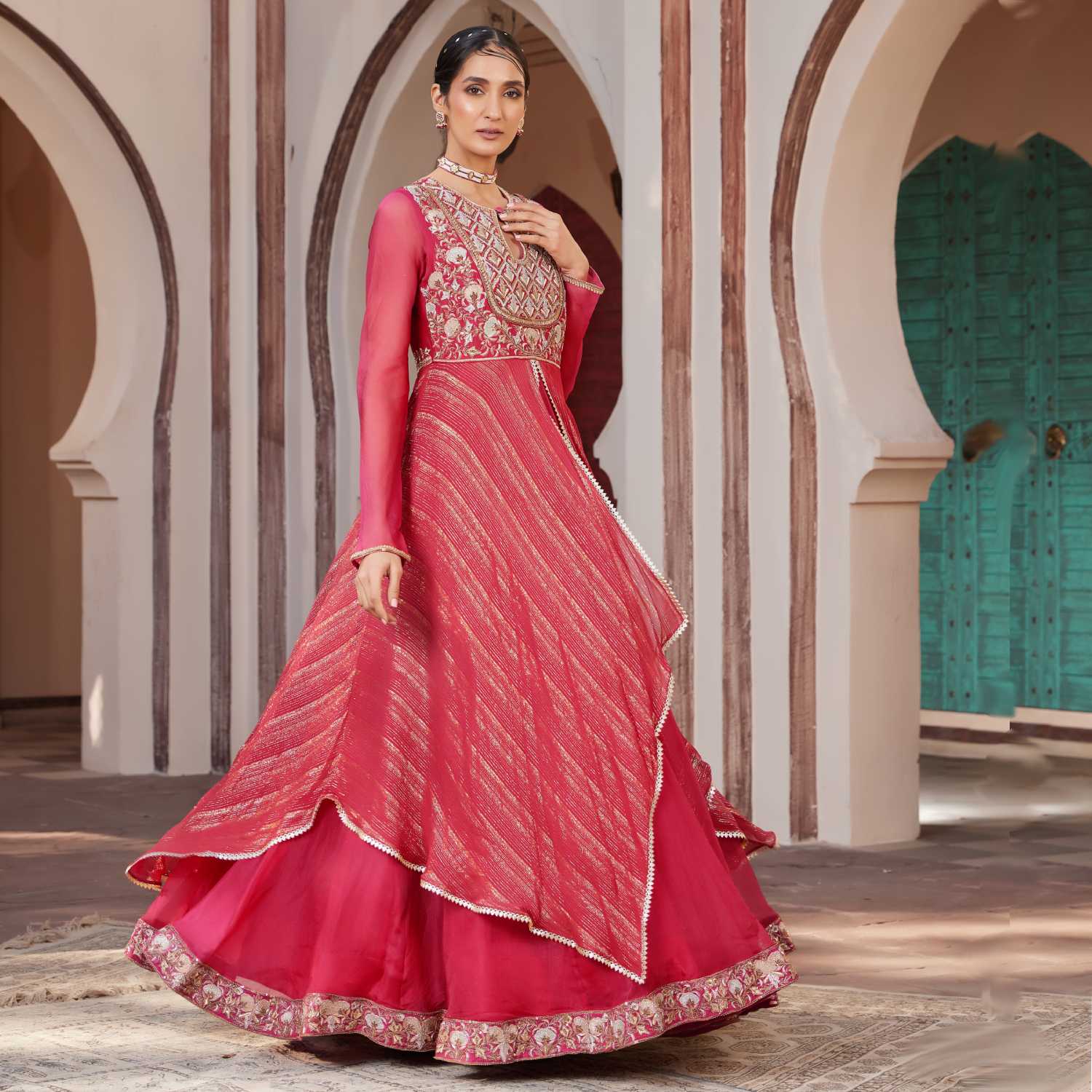 Crafted from a blend of raw silk and shimmer georgette, this gown comes in a soft pink shade. The layered gown features sheer full sleeves and a chic cutout neck detail. Pair it with statement earrings and a clutch for weddings and festivities.