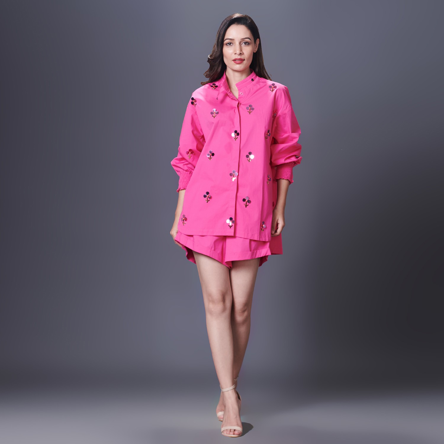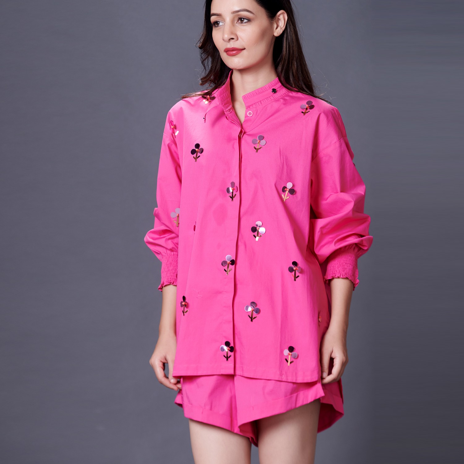 This stunning set is crafted from high-quality cotton fabric. It includes a shirt and shorts, both in a vibrant pink shade. The shirt has intricate hand embroidery and puffed sleeves, adding elegance to the look. The shorts come with pockets and have a relaxed fit that perfectly complements the outfit. Pair it with statement earrings and metallic heels for a dressy evening event.