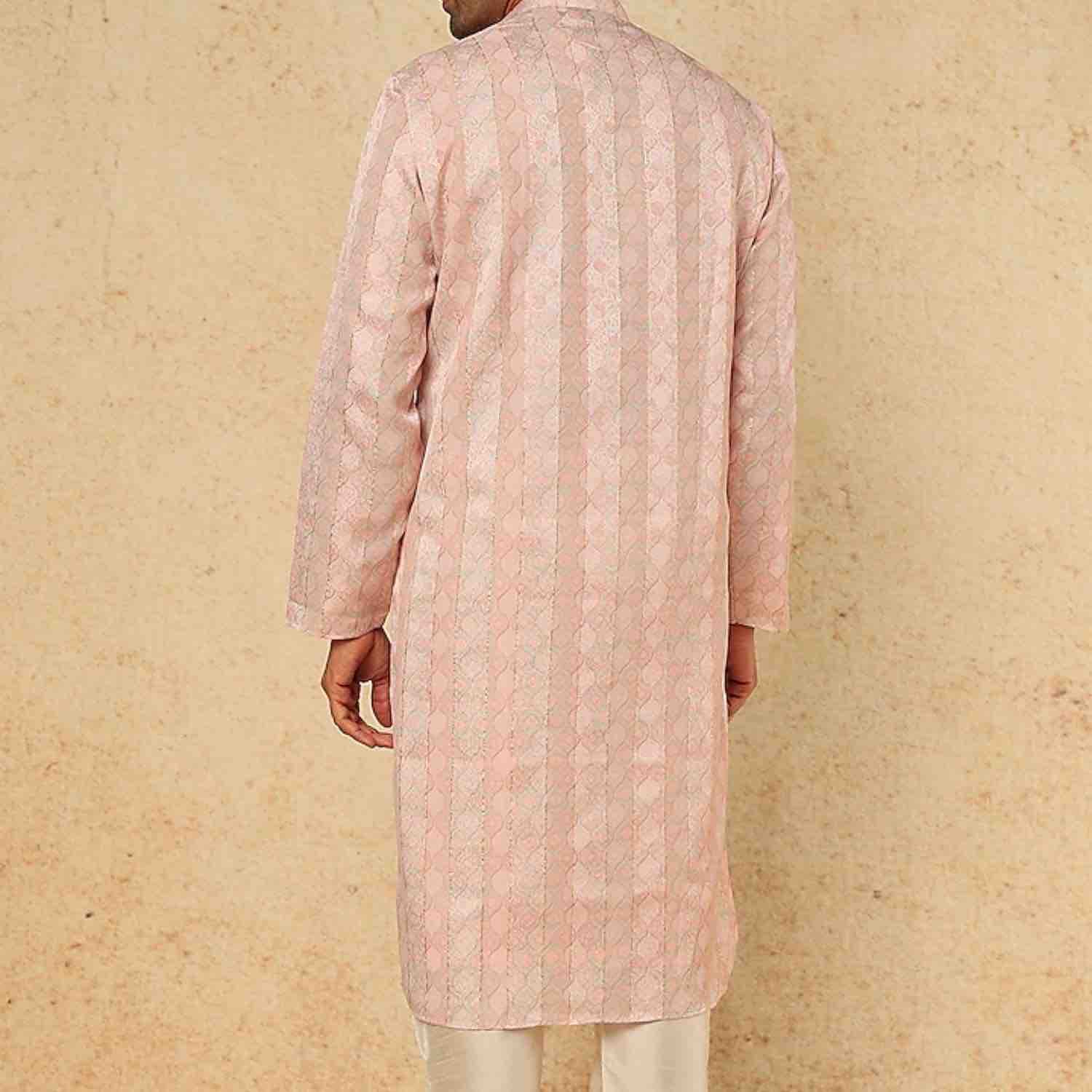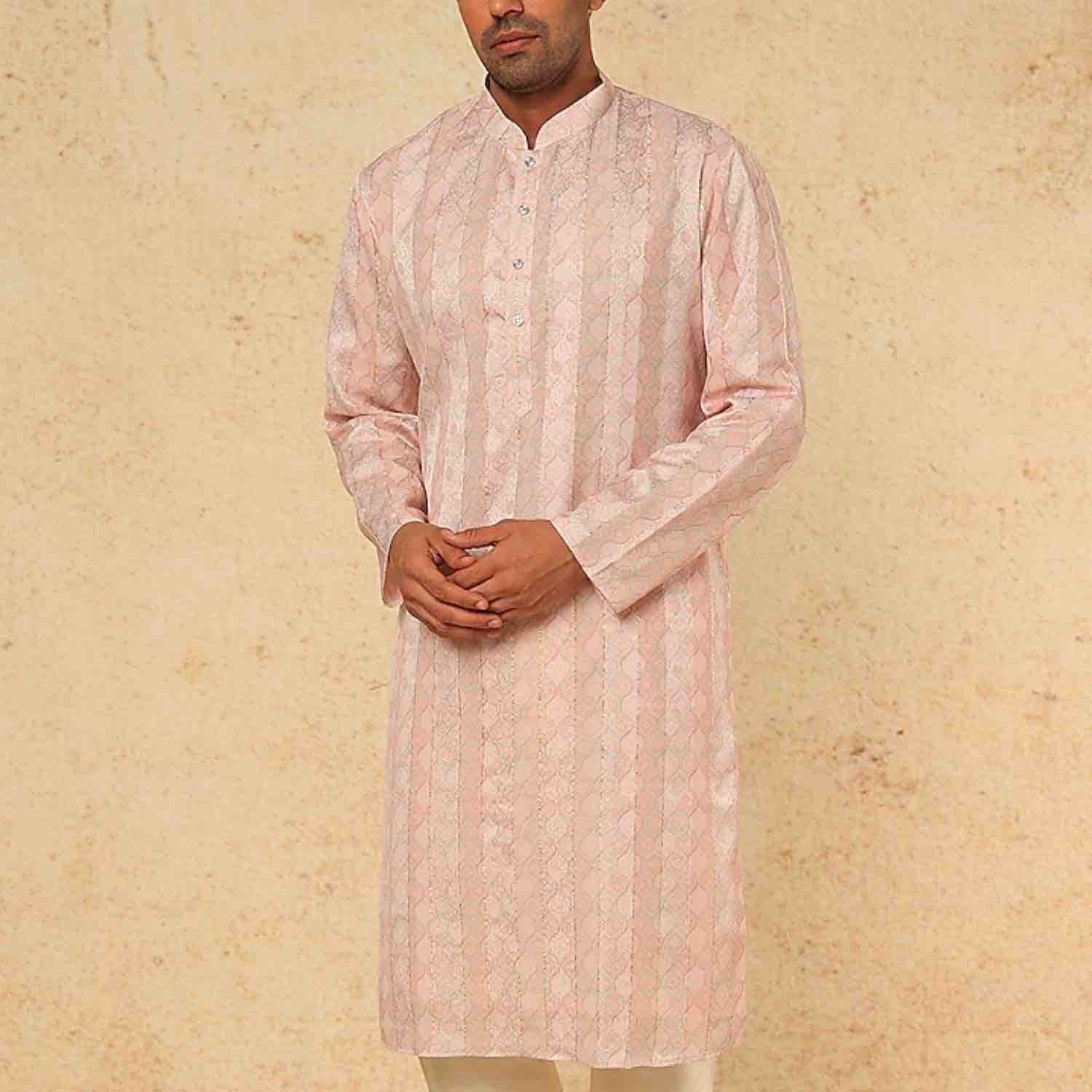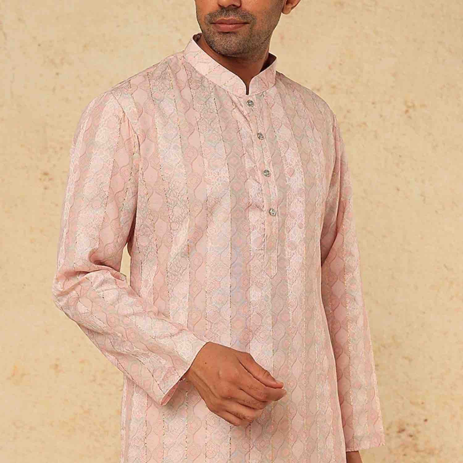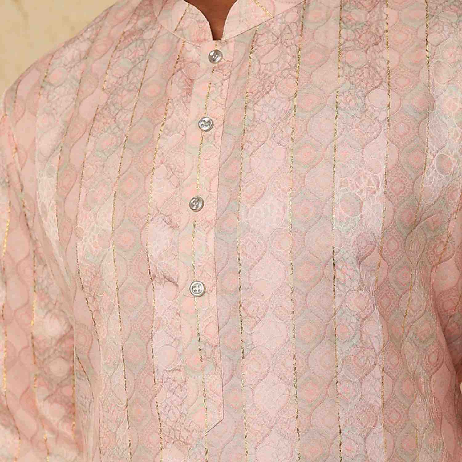 ₹ 10,000 (15% off)Featuring a powder pink cotton silk kurta with an enchanting all-over Jaipuri print, elevated with intricate gota embroidery. Paired with an off-white dupion silk churidar pant, this ensemble combines traditional charm and contemporary elegance. Make a stylish statement with this stunning outfit.