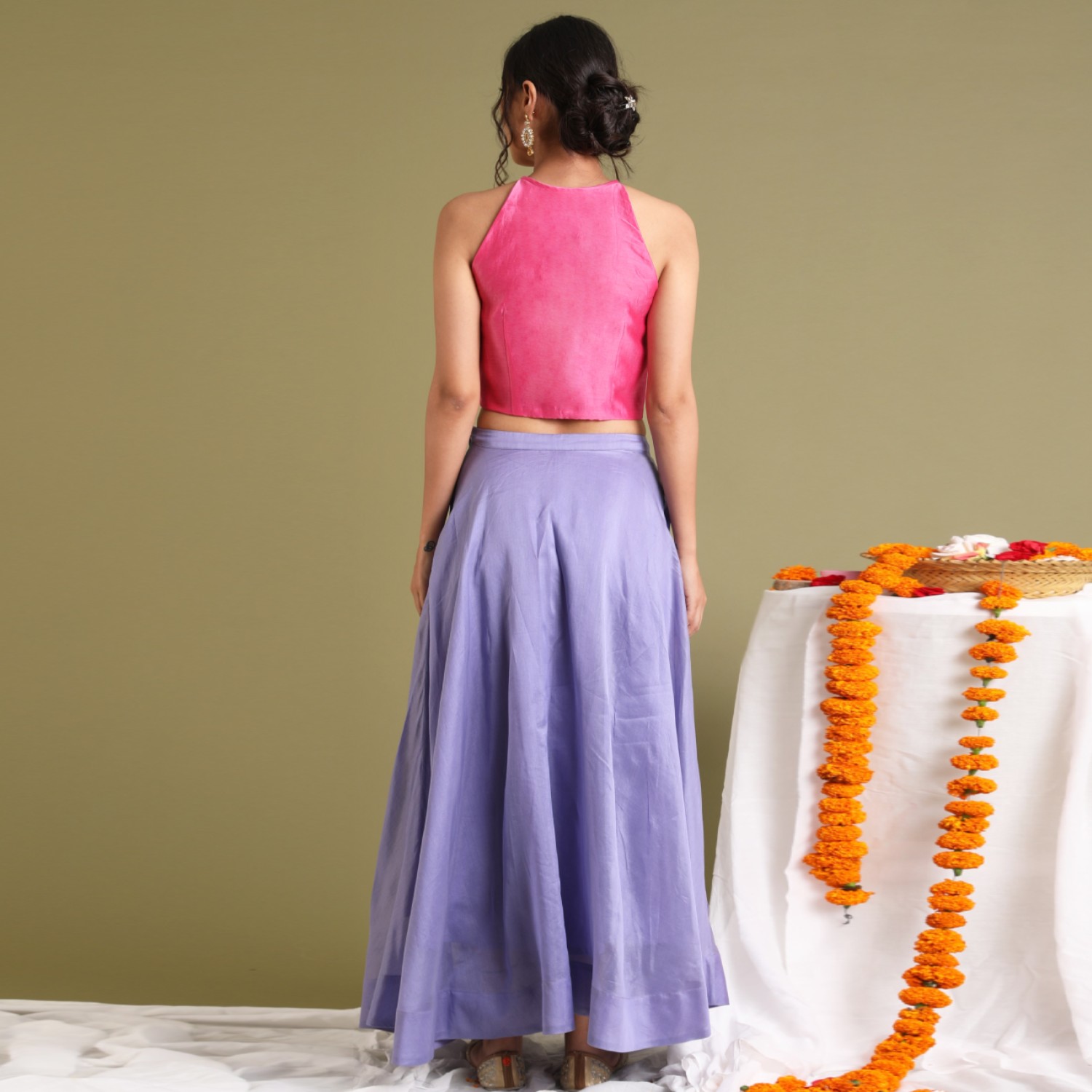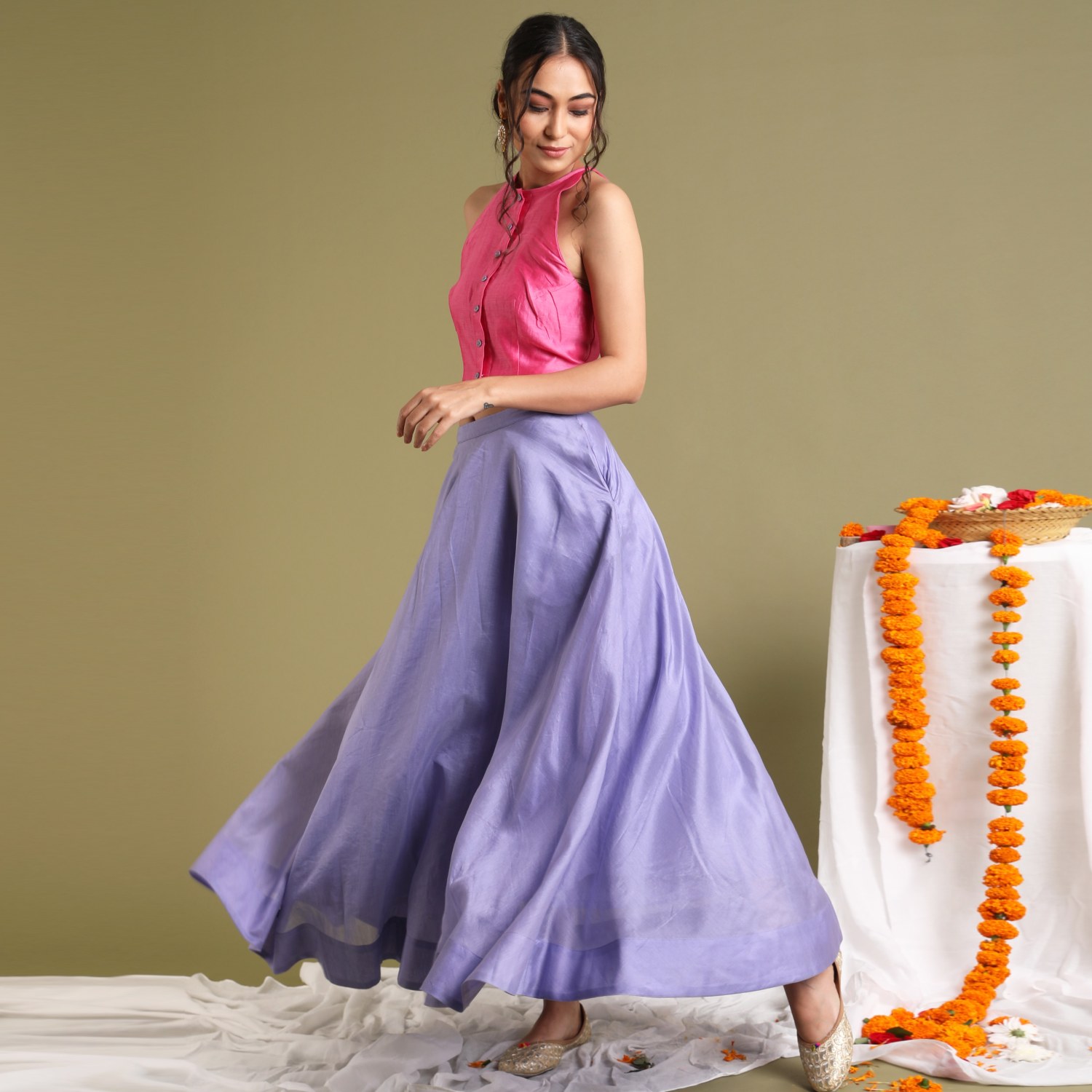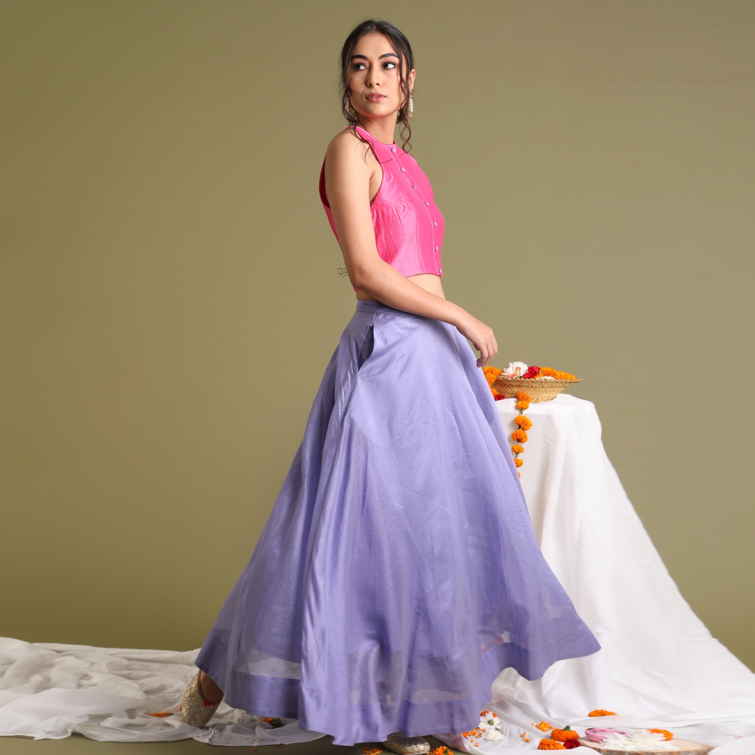 ₹ 8,999 (10% off)Explore chic versatility in our coordinated set, featuring a flared chanderi handloom skirt with side pockets paired effortlessly with a pink halter neck top in the same fabric. The front-open top is adorned with lavender fabric buttons both meticulously lined. Perfect for festive, formal occasions or styled separately, this ensemble offers timeless elegance.
