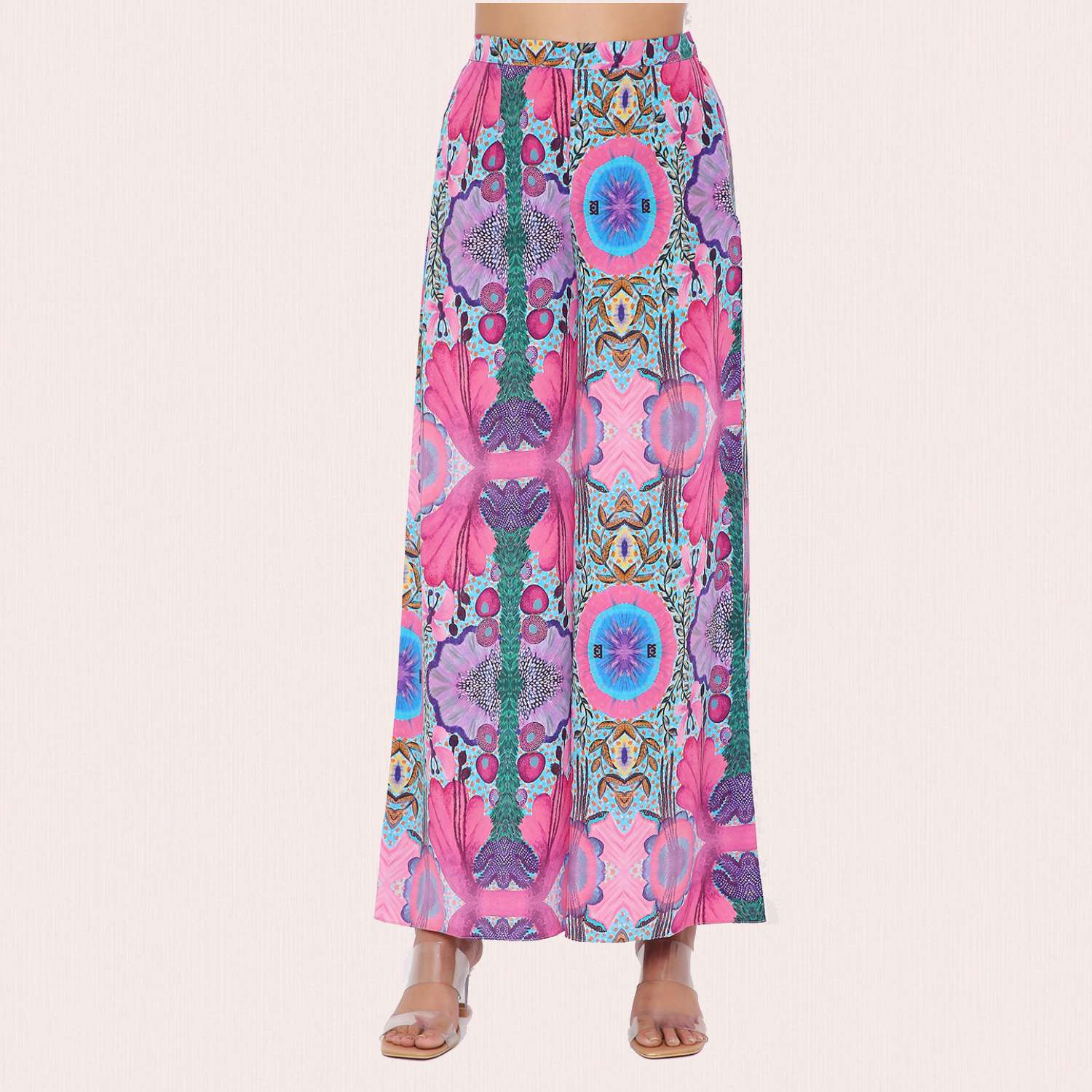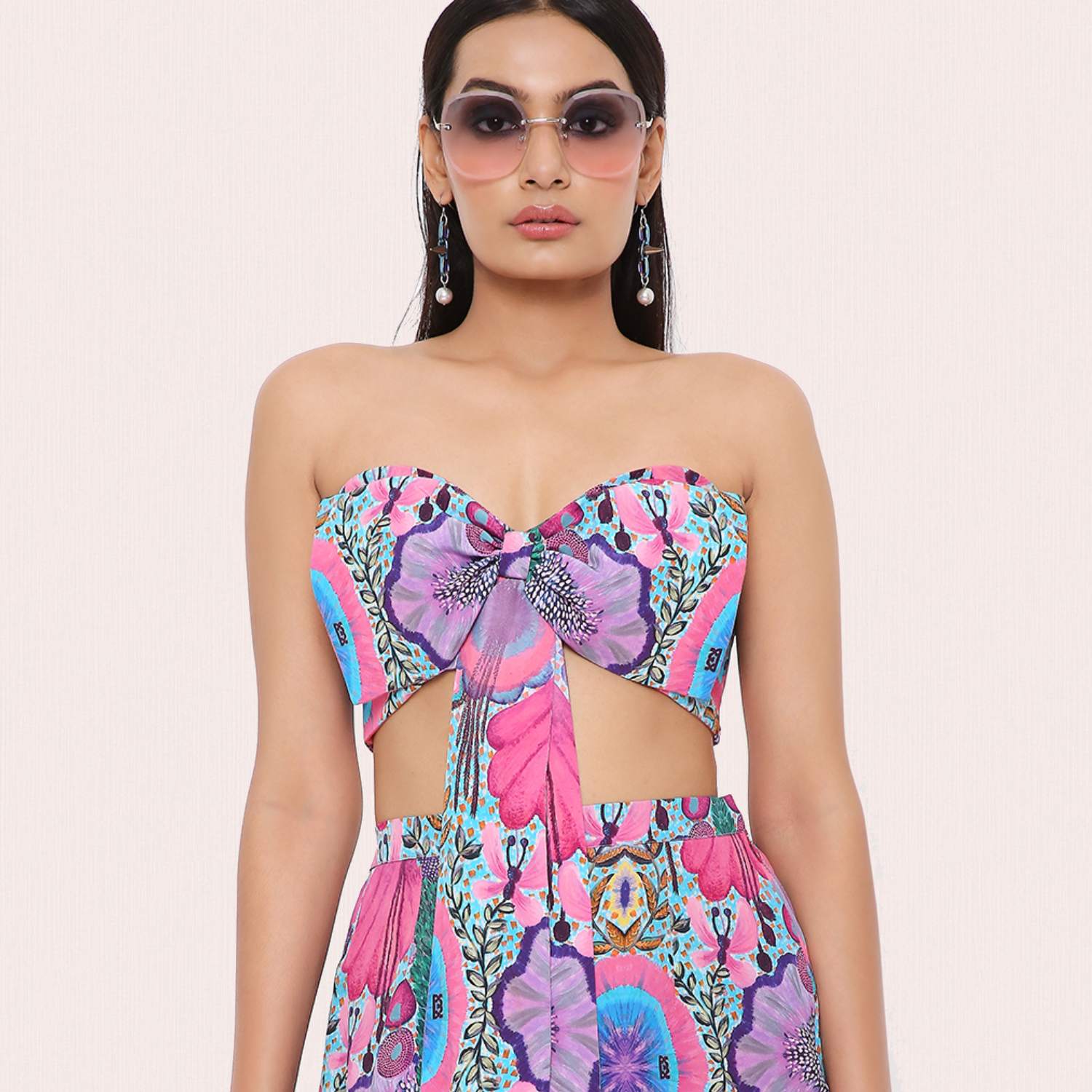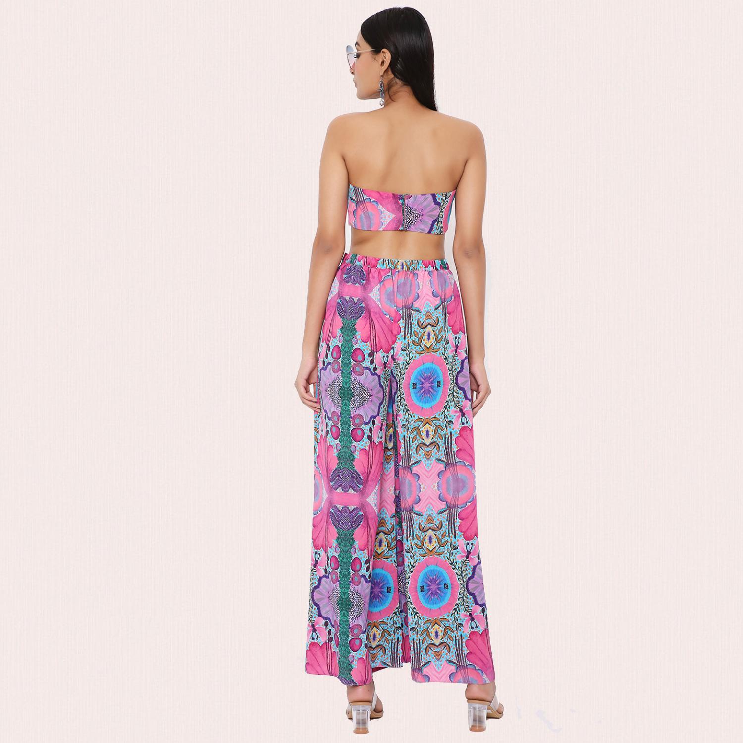 Crafted in high-quality crepe fabric, this pink set has an enchanted print. It features a bow-accented tube top, providing a chic and feminine touch. It comes with palazzo pants, offering a relaxed fit for easy movement and comfort. Style it with statement earrings and strappy heels for a dressy evening event.