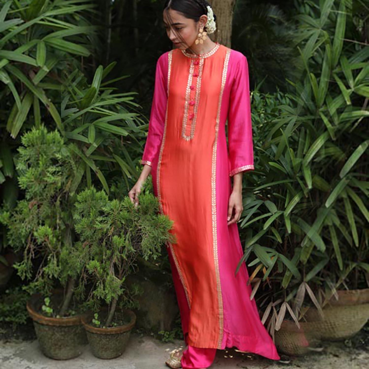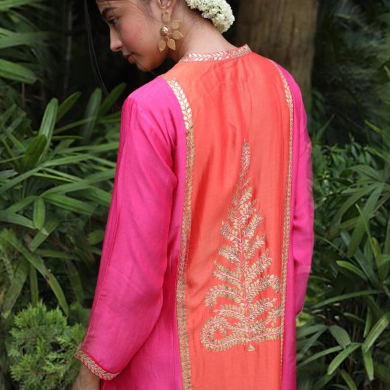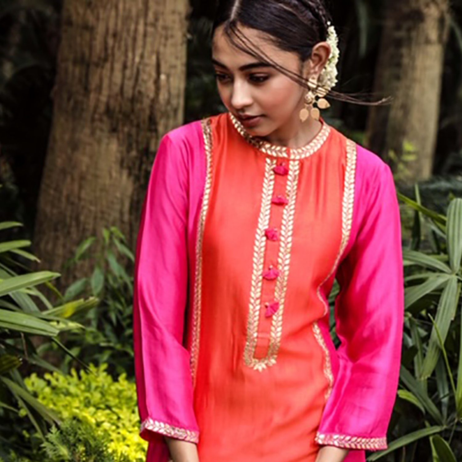 Crafted from luxurious modal silk fabric, the kurta has a vibrant shade of pink, featuring intricate gota embroidery, delicate tassels and exquisite orange panel detailing, adding a pop of contrasting color. A matching pair of Pink Pants is paired seamlessly with the kurta, creating a well-coordinated outfit. Style it with statement earrings and heels for special occasions.