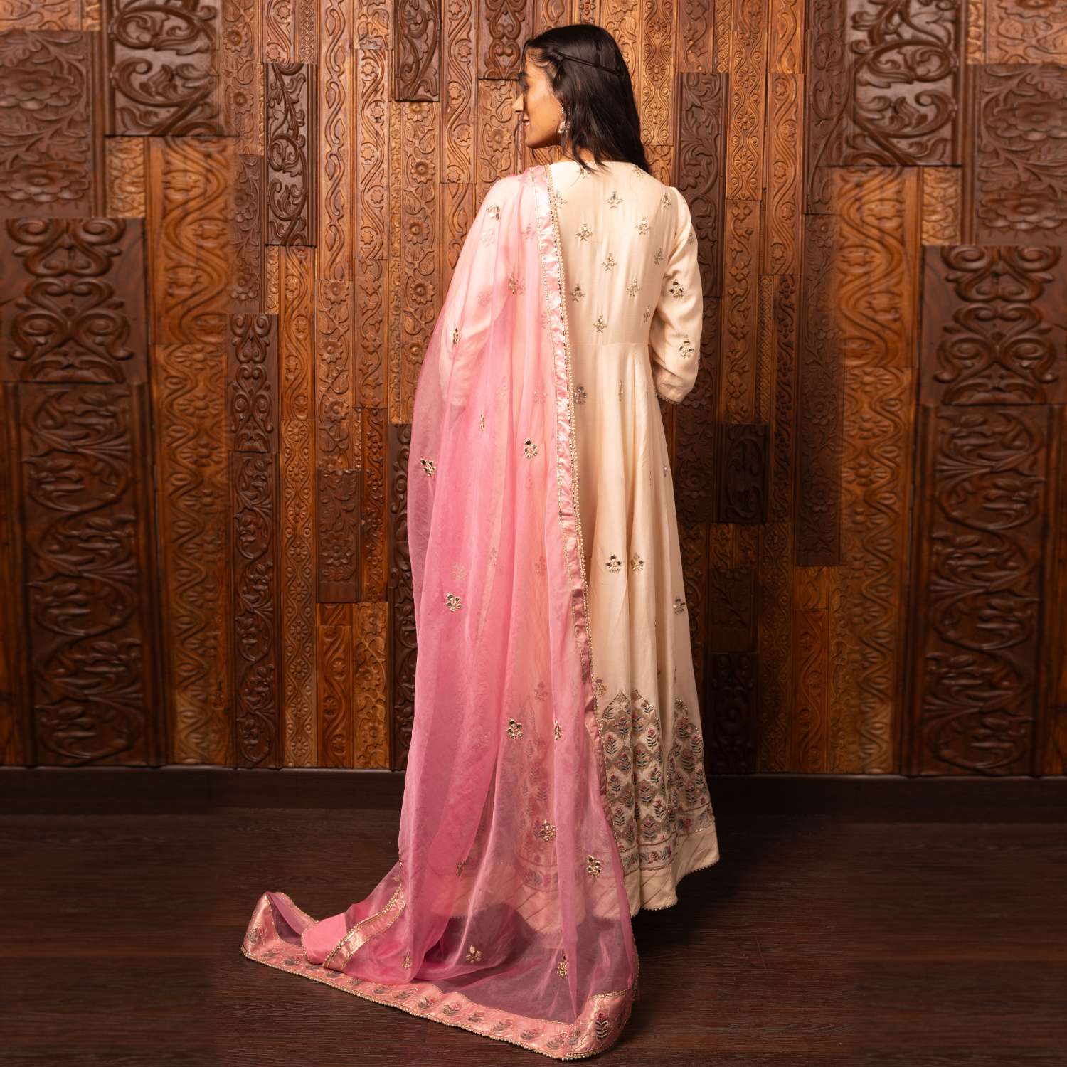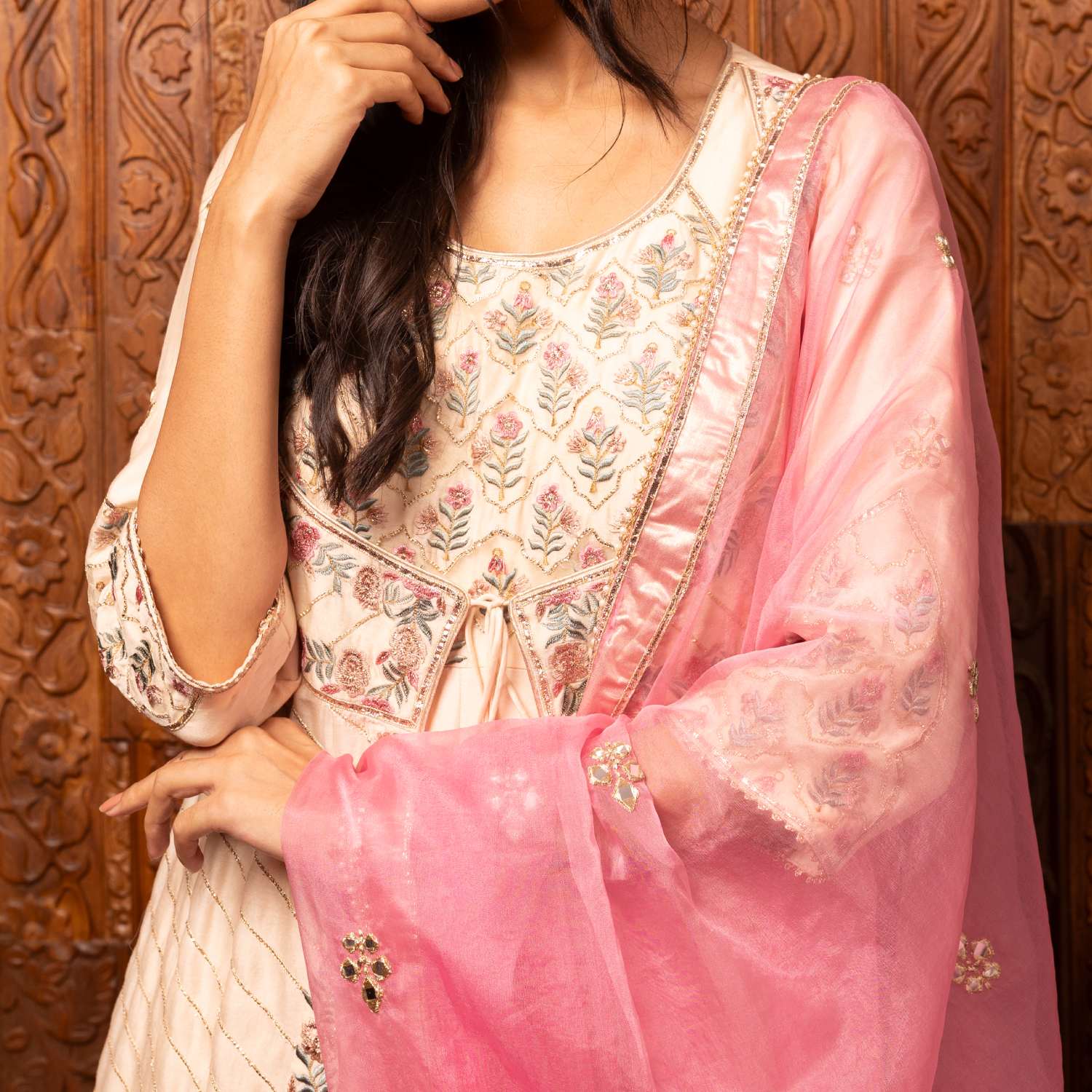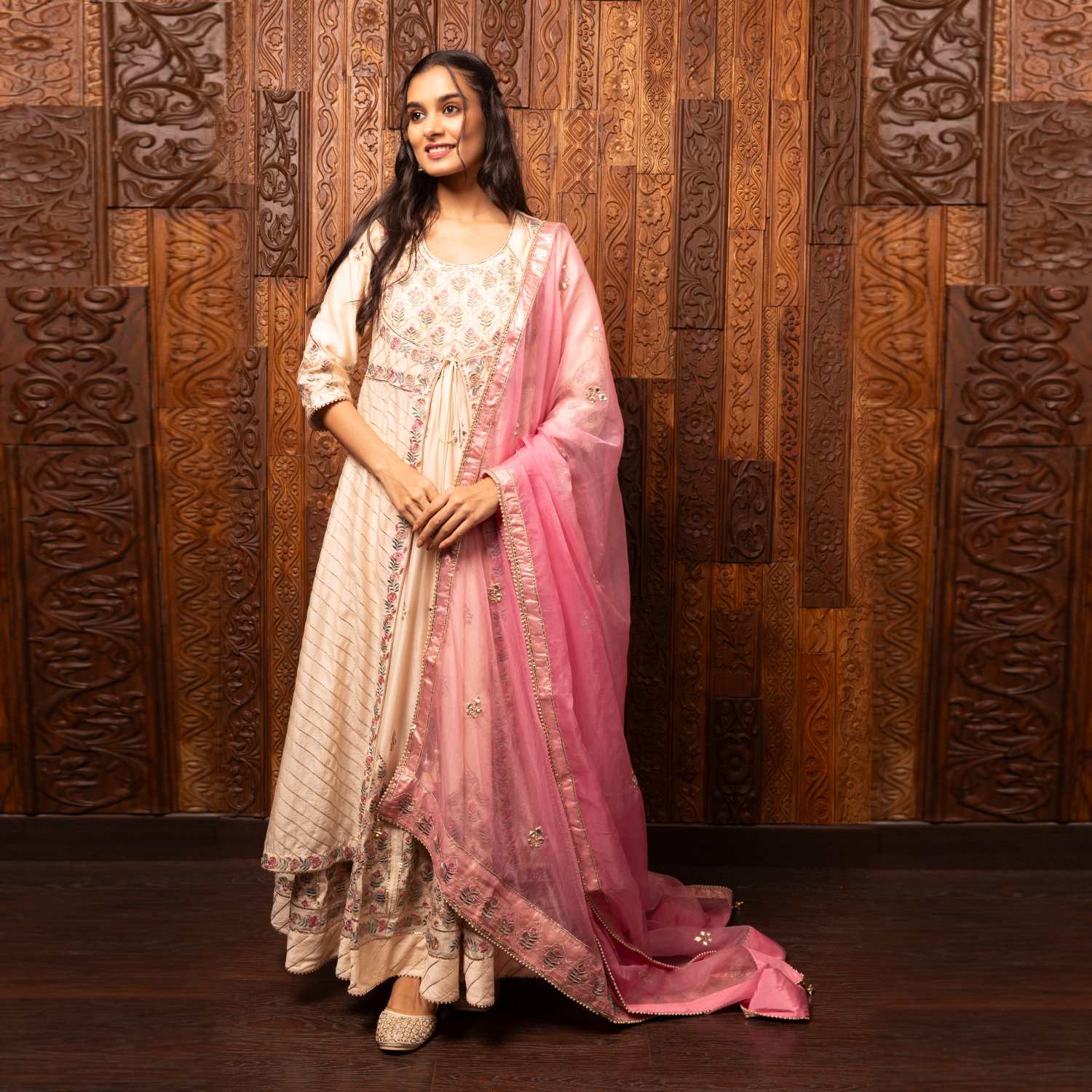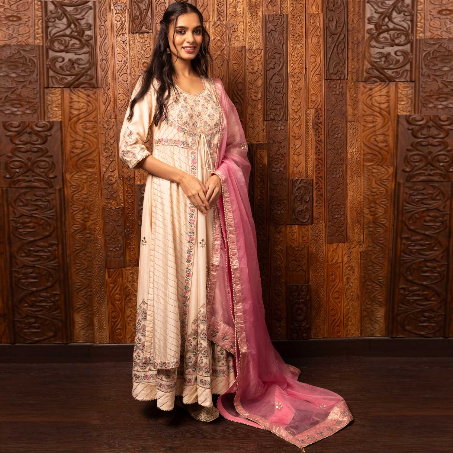 Crafted from high-quality silk chanderi fabric, this set comes in a stunning pink shade. The kalidar kurta is adorned with intricate embroidery and three-quarter sleeves. Complementing the kurta is a darker pink embroidered organza dupatta, adding contrast and grace to the look. Style it with statement earrings and an embellished clutch for weddings or festivities.