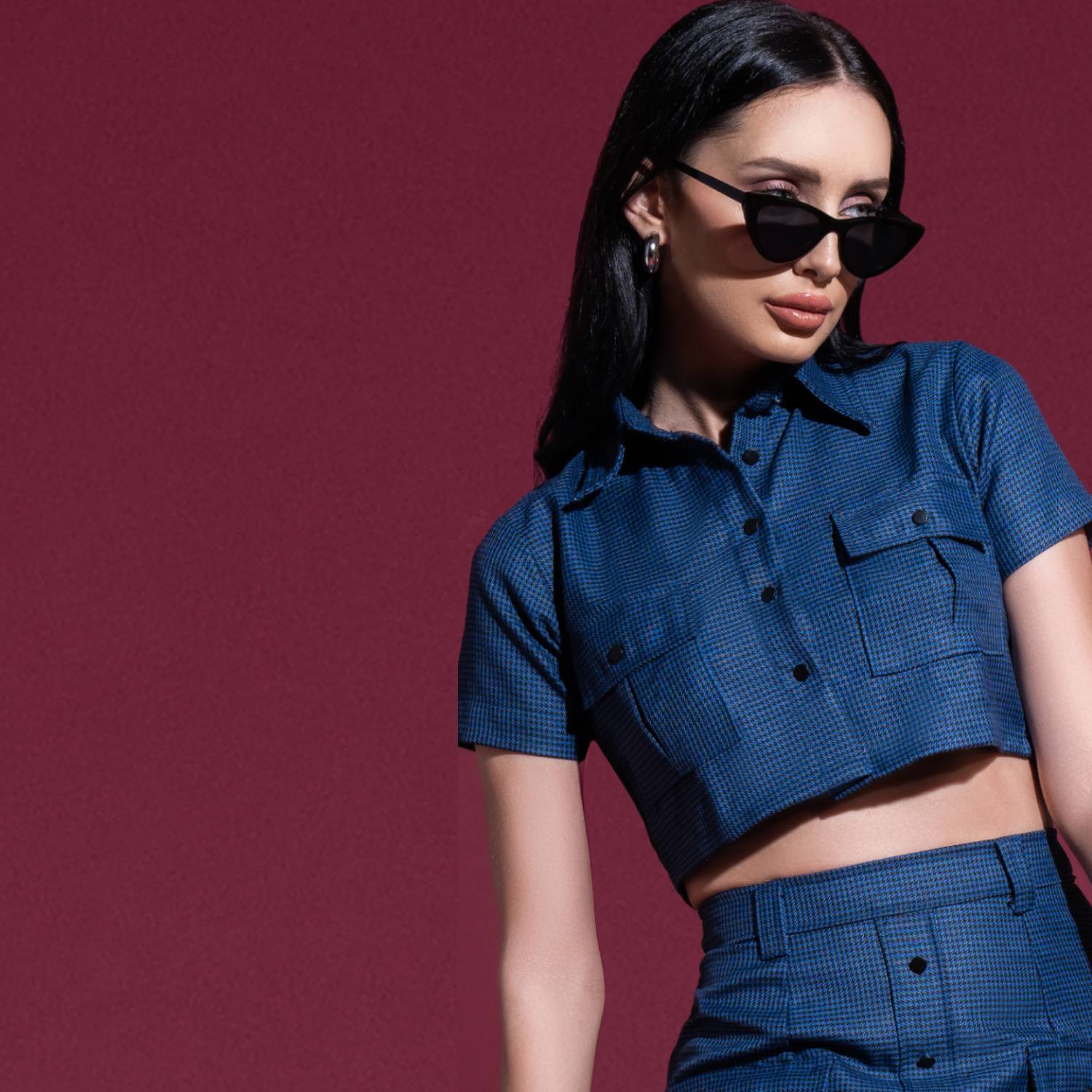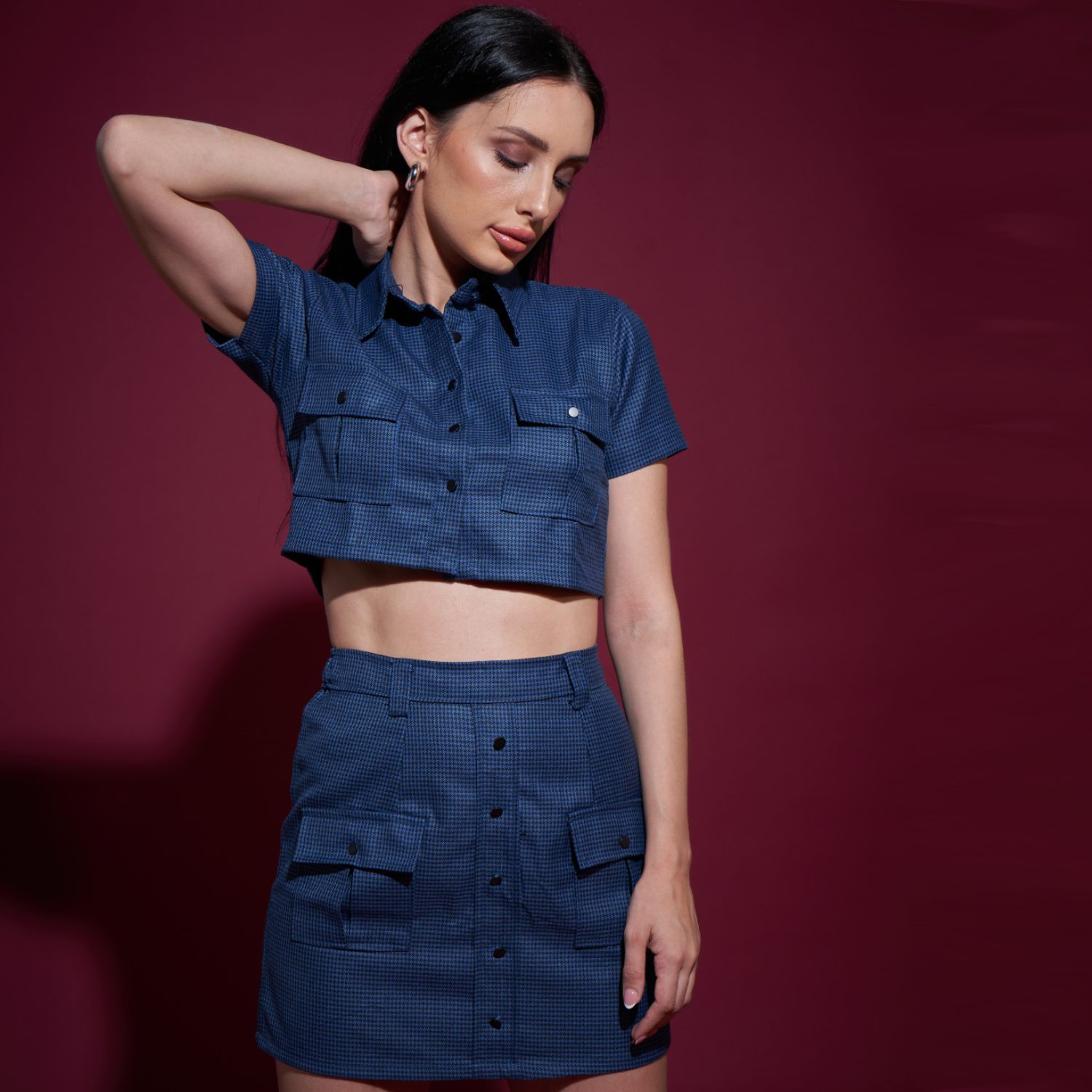 This gorgeous set includes a top and a matching skirt in a blue and black plaid print. Made from a high-quality cotton fabric, it features black buttons and pleated pockets. Style this set with a chunky necklace and heels for a dressy evening event.