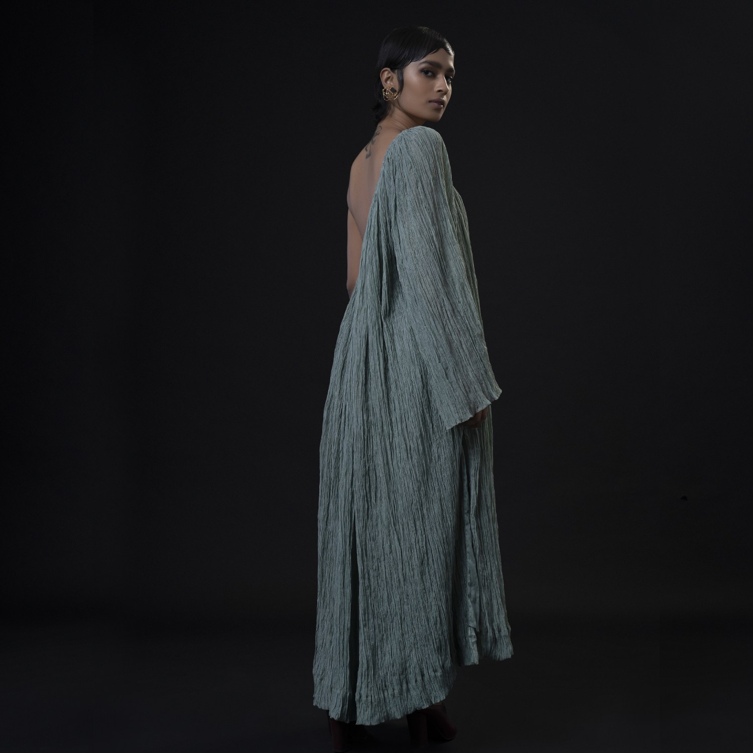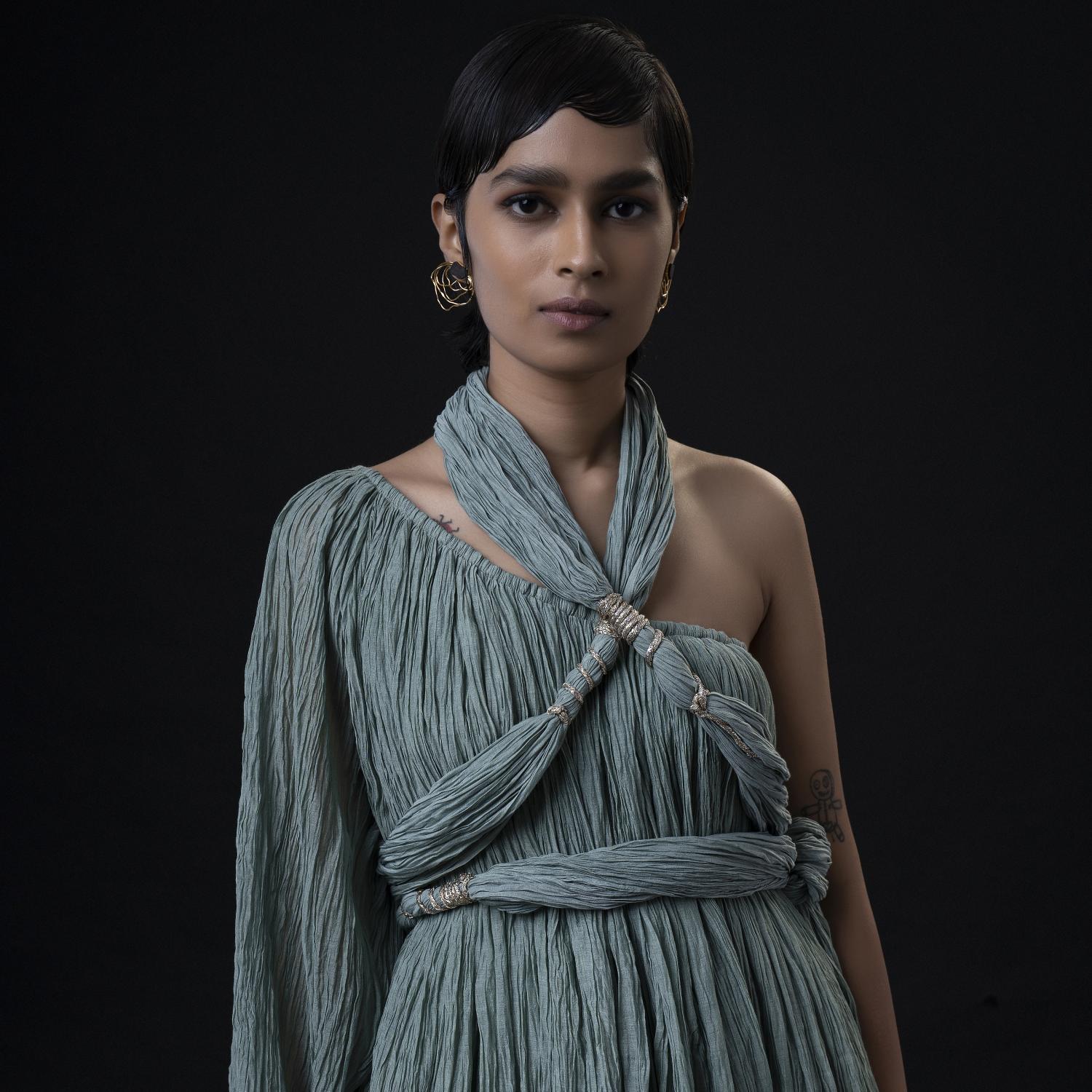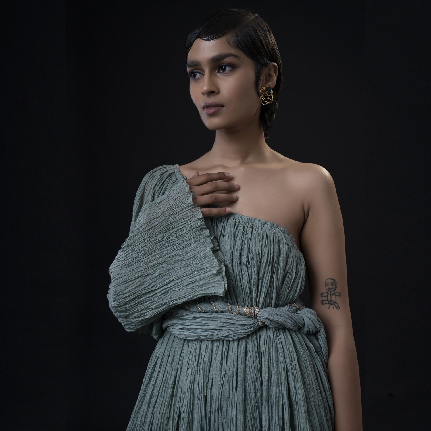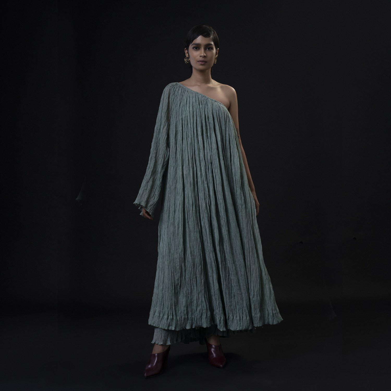 ₹ 18,525 (10% off)This sea green set features a one-shoulder dress gracefully drapes in an asymmetrical silhouette. Paired with the dress are comfort-fit pants that provide ease of movement and a dupatta adorned with real metal gota trim, adding opulence. Pair this understated outfit with strappy heels and an embellished clutch for a dressy event.
