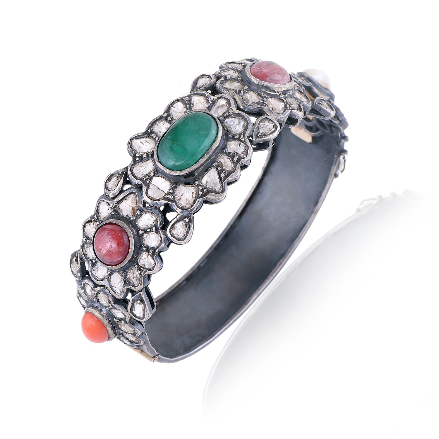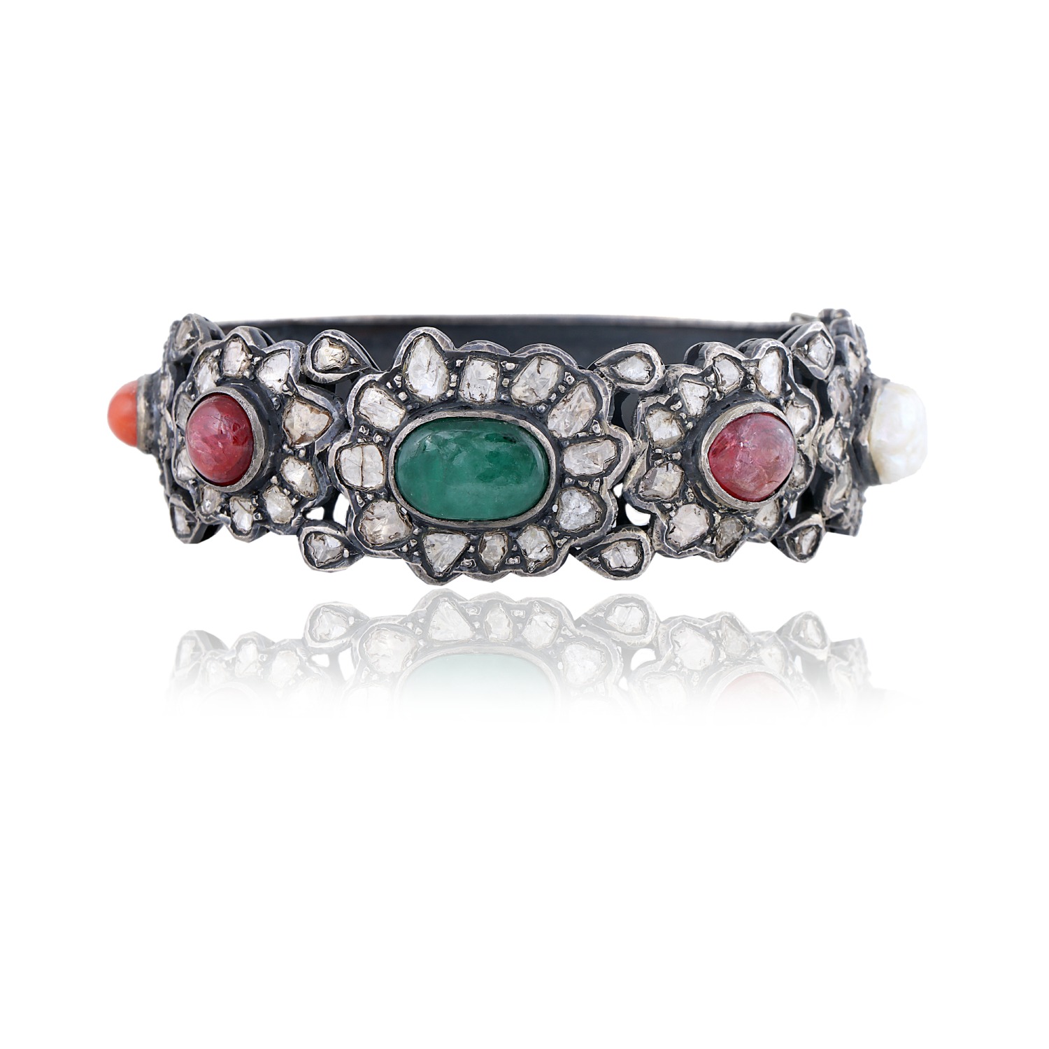 Our polki and navratna stones cuff set in silver is a stunning addition to any jewelry collection. Crafted from high-quality silver material, this set features intricate designs and beautiful polki and navratna stones that will take your breath away. The green stone finish adds a touch of elegance and sophistication to this already exquisite piece.