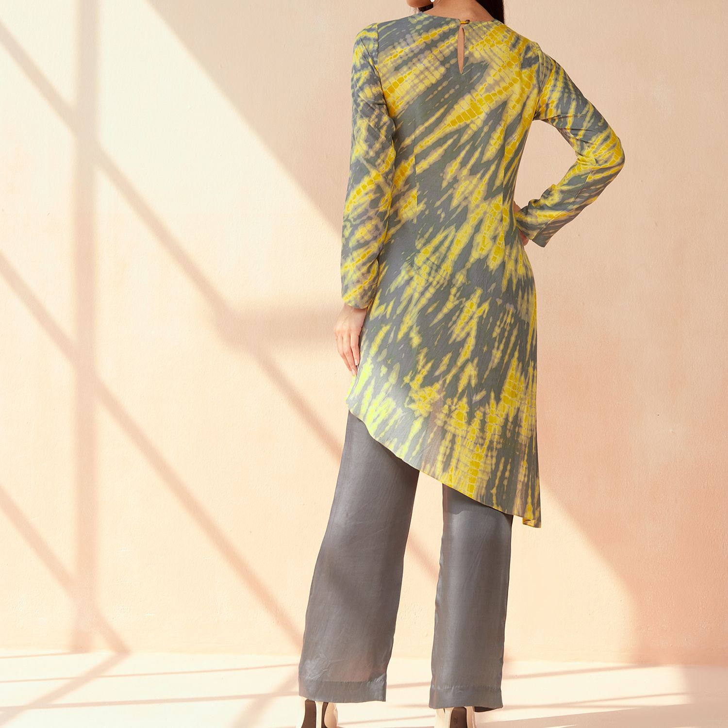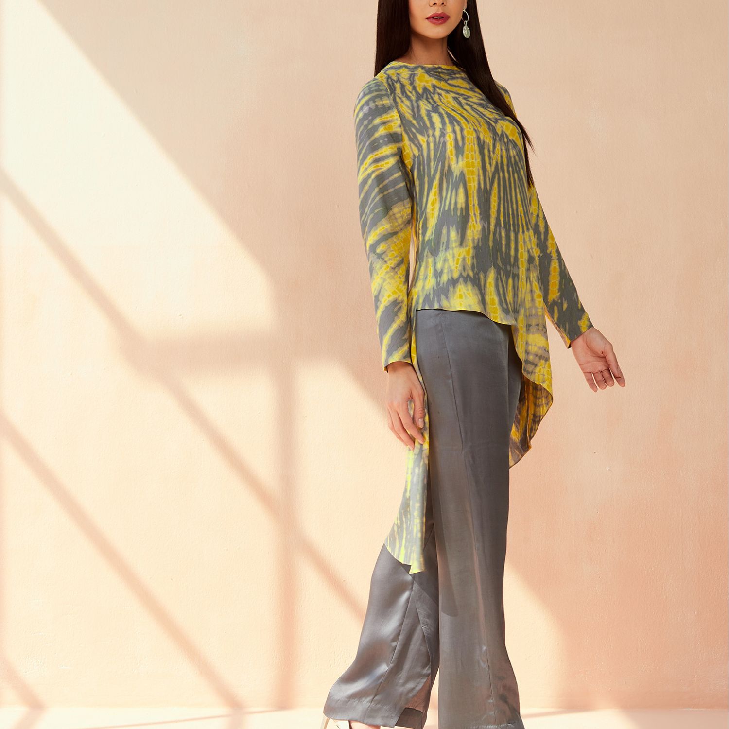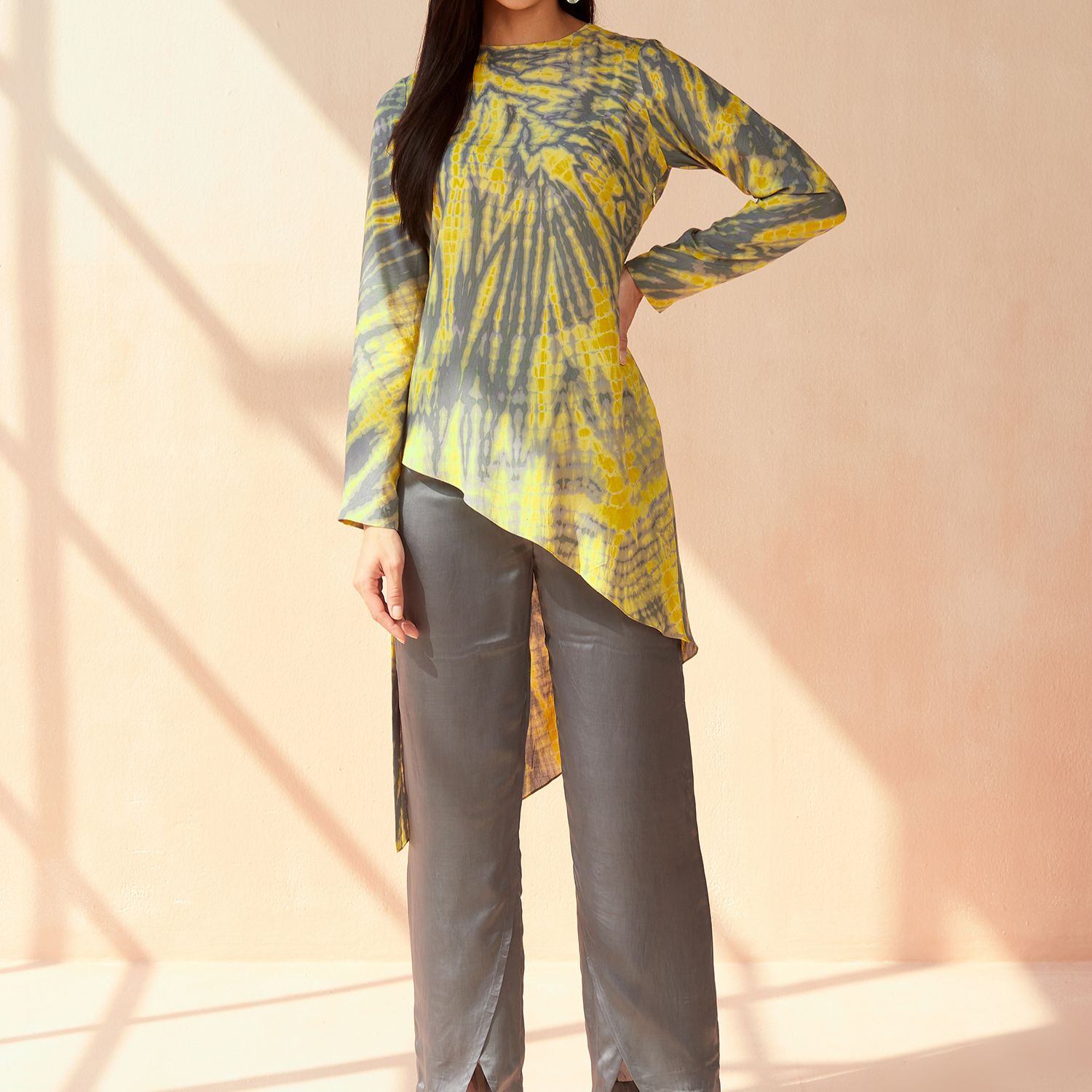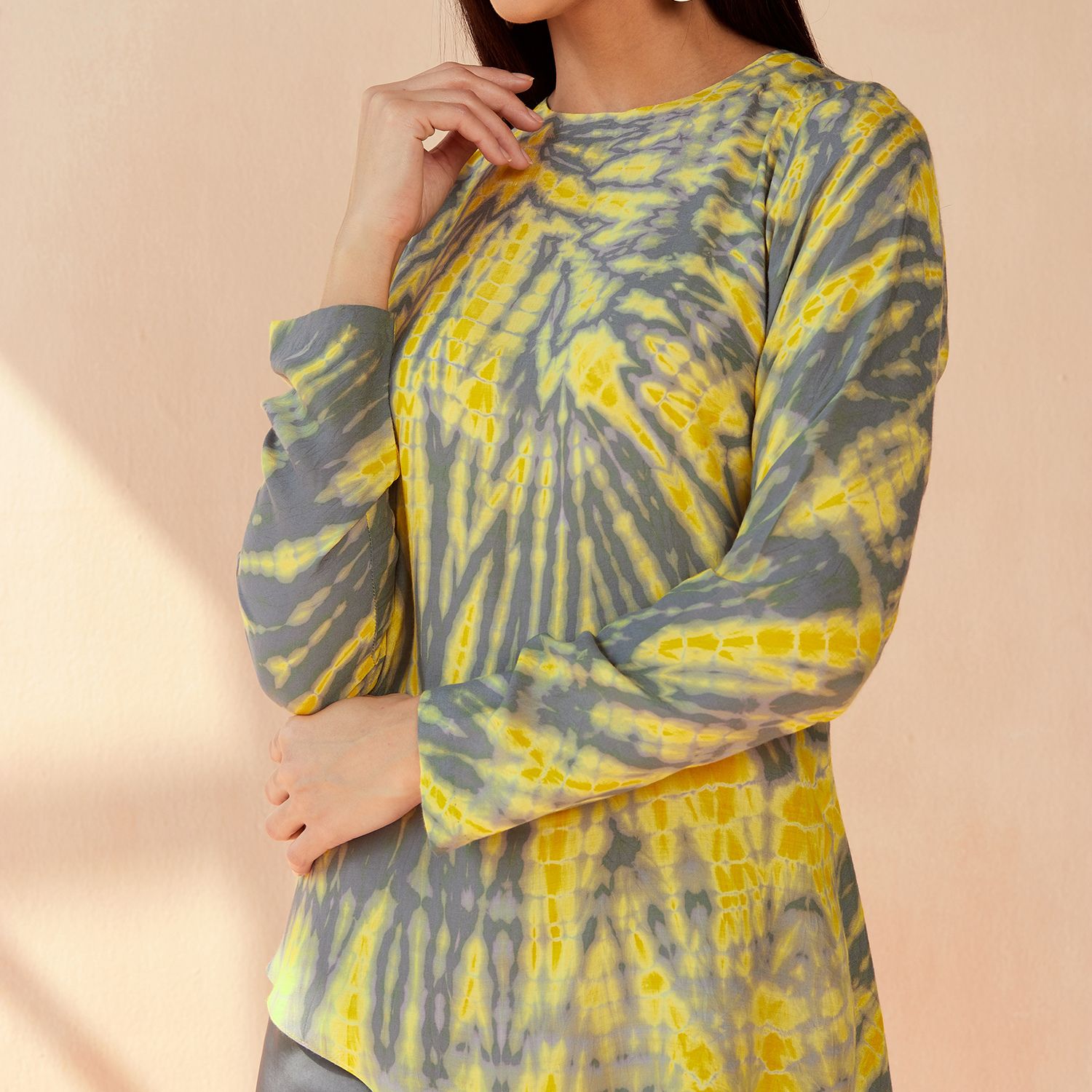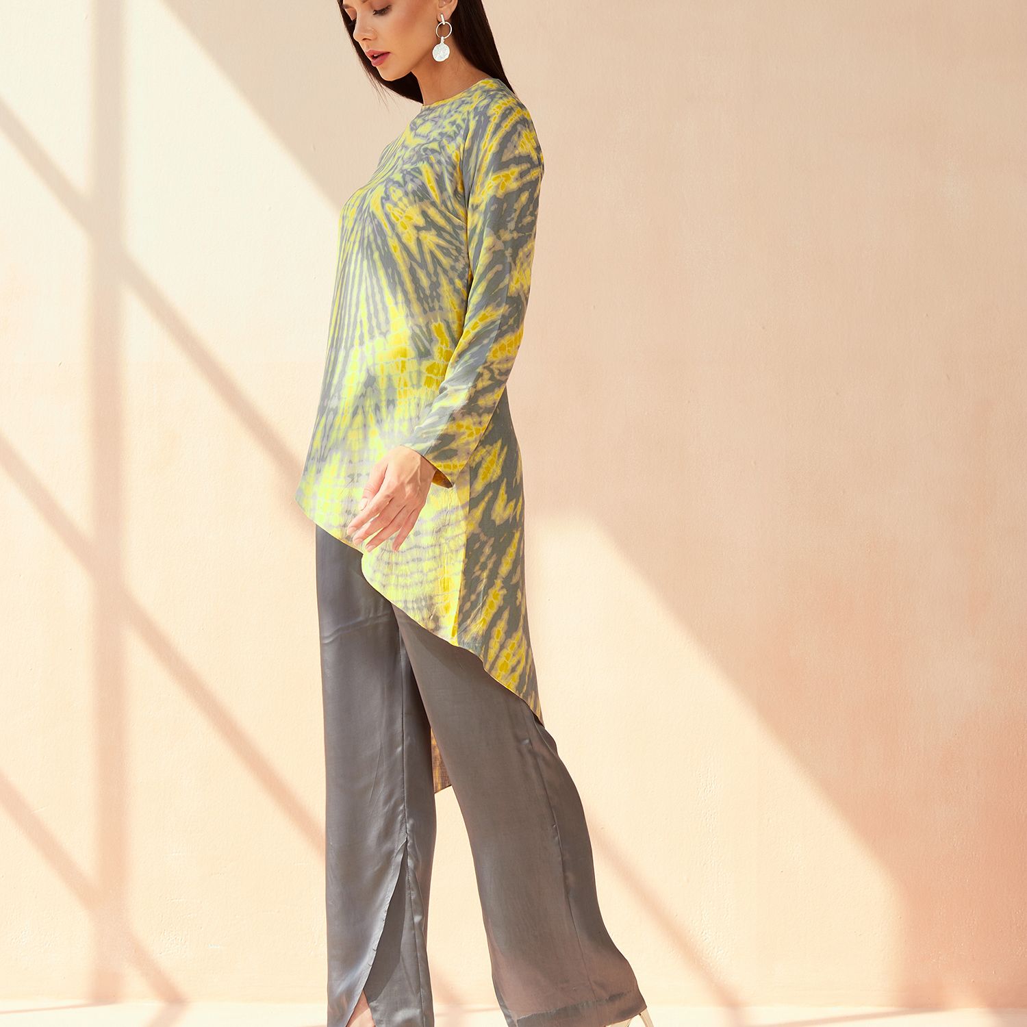 The Portia tie-dye set in grey-yellow color is crafted from luxurious modal sateen fabric. It exudes a chic and trendy vibe with its unique tie-dye pattern. The set includes a comfortable top and matching bottoms, perfect for lounging or making a stylish statement wherever you go.