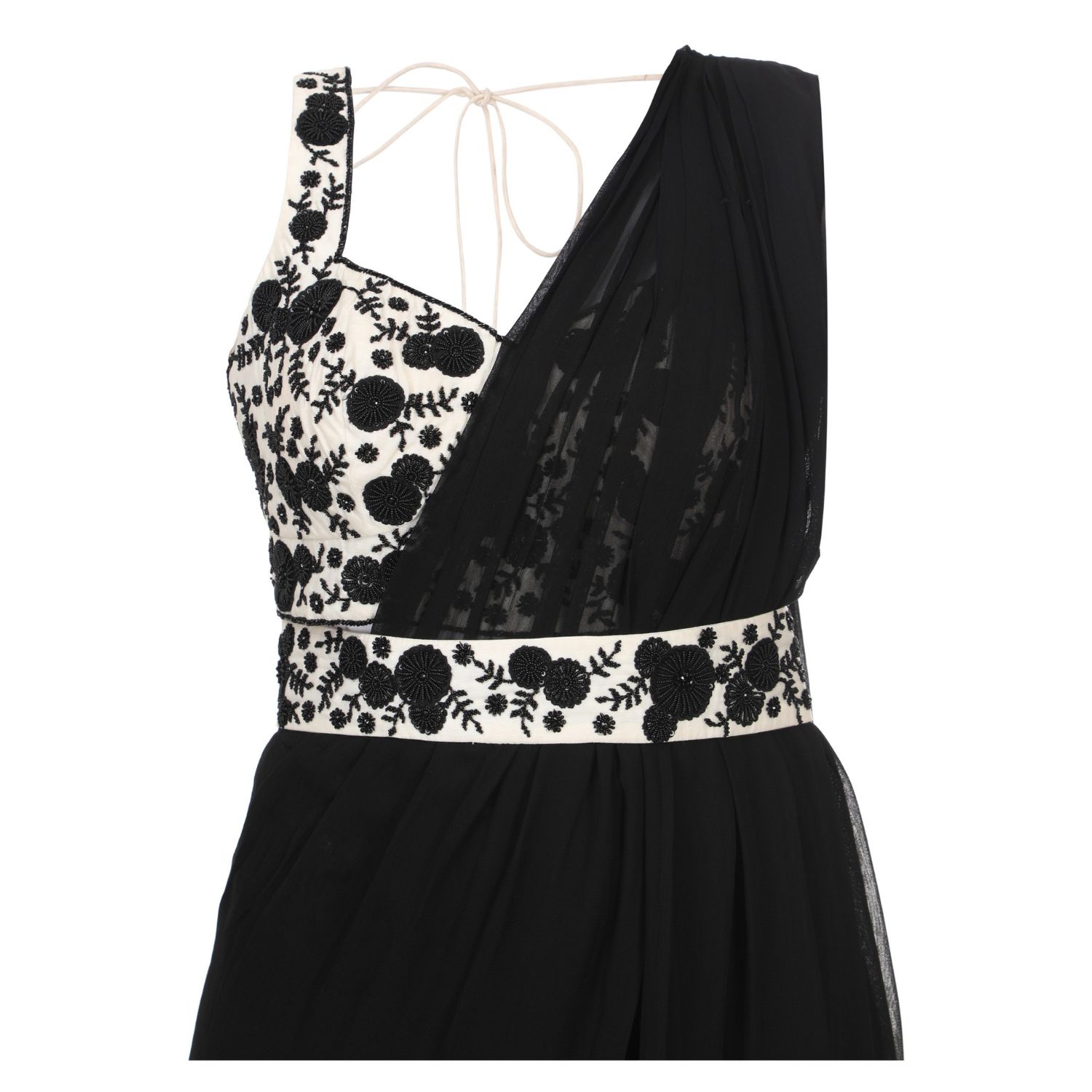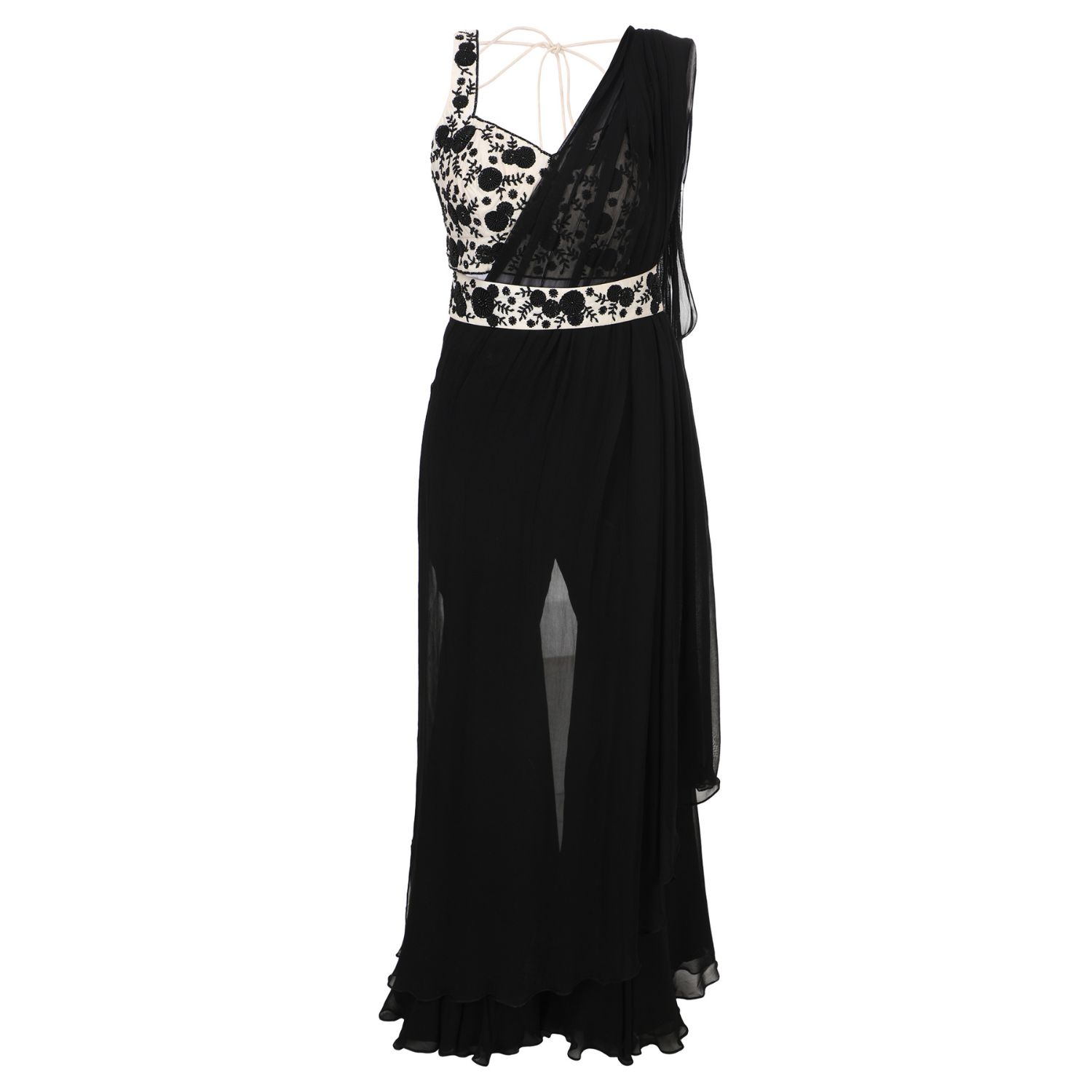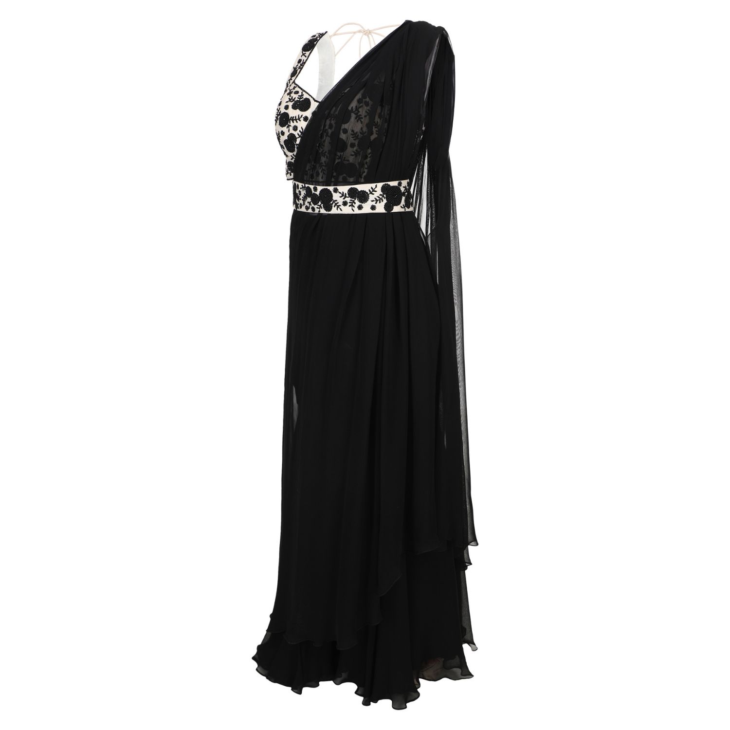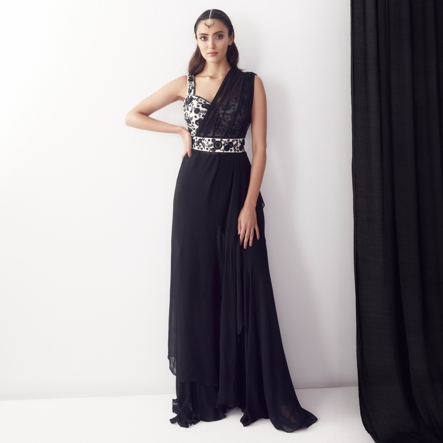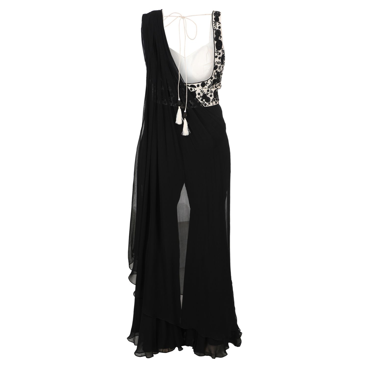 Get ready to steal the show with our stunning black and white applique work pre-draped saree concept with pants! Crafted with premium-quality georgette and chanderi fabric, this outfit promises both style and comfort. The intricate applique work adds a touch of elegance to the overall look and makes it perfect for any formal occasion. Pair it up with a statement piece of jewellery, and you are all set to make heads turn.