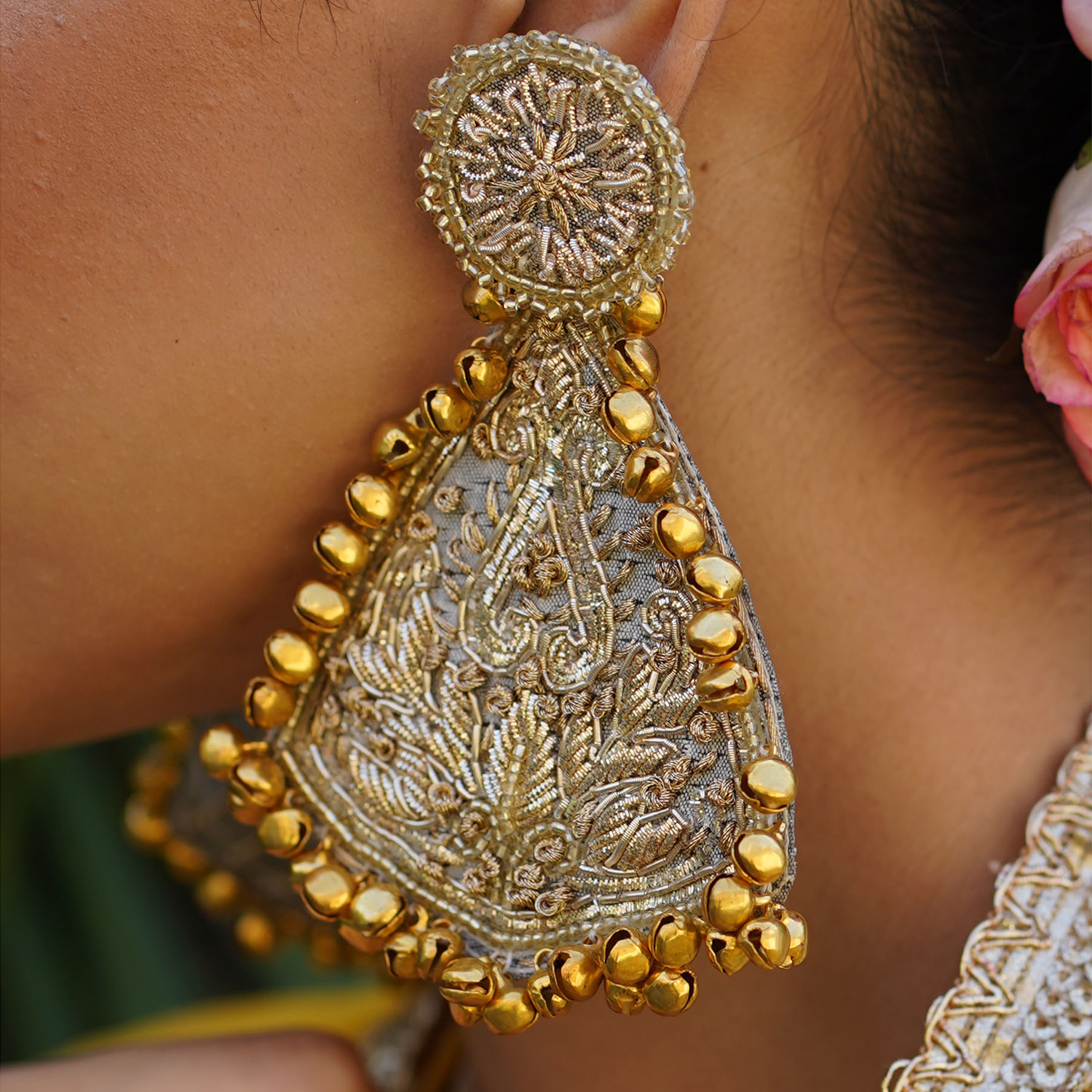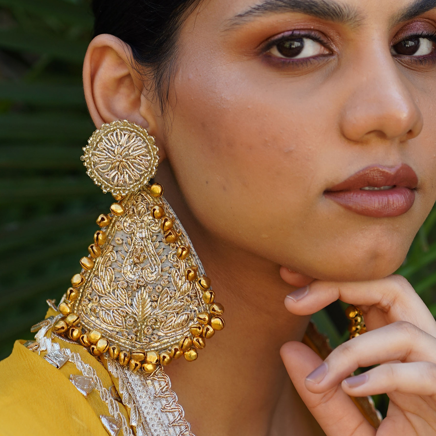 These long chandelier earrings are adorned with intricate gold naqshi work. These earrings are finished with dangling ghungroos and are secured with a clasp closure, ensuring a comfortable fit.
