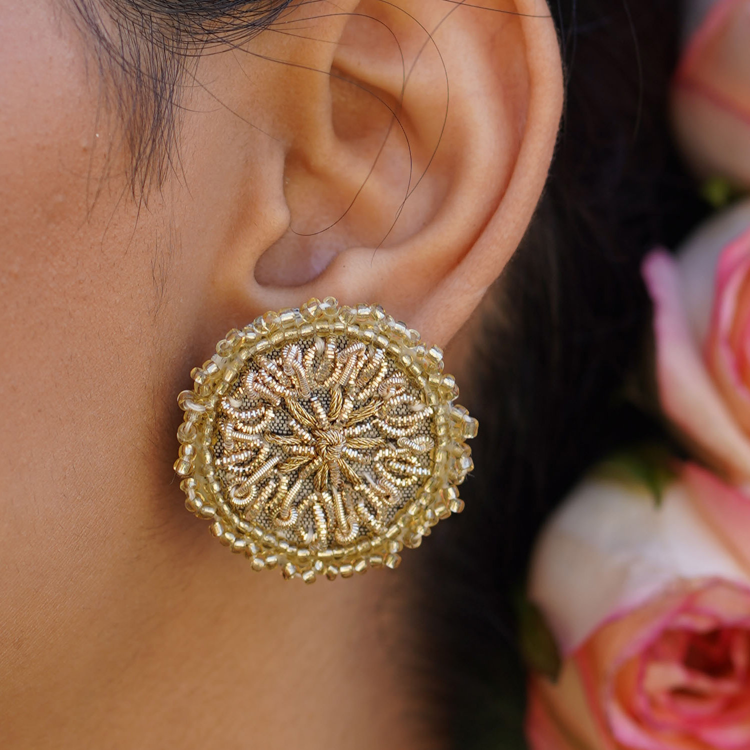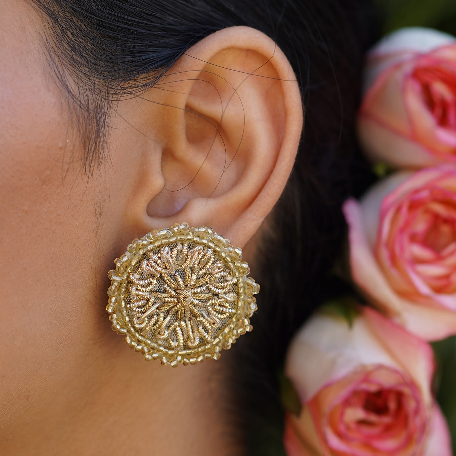 ₹ 2,575 (10% off)These round zardoz earrings are meticulously crafted with intricate zardozi work. These studs are designed with a clasp closure for secure and comfortable wear. Style them with a kurta and a sling bag for a dressy day event.