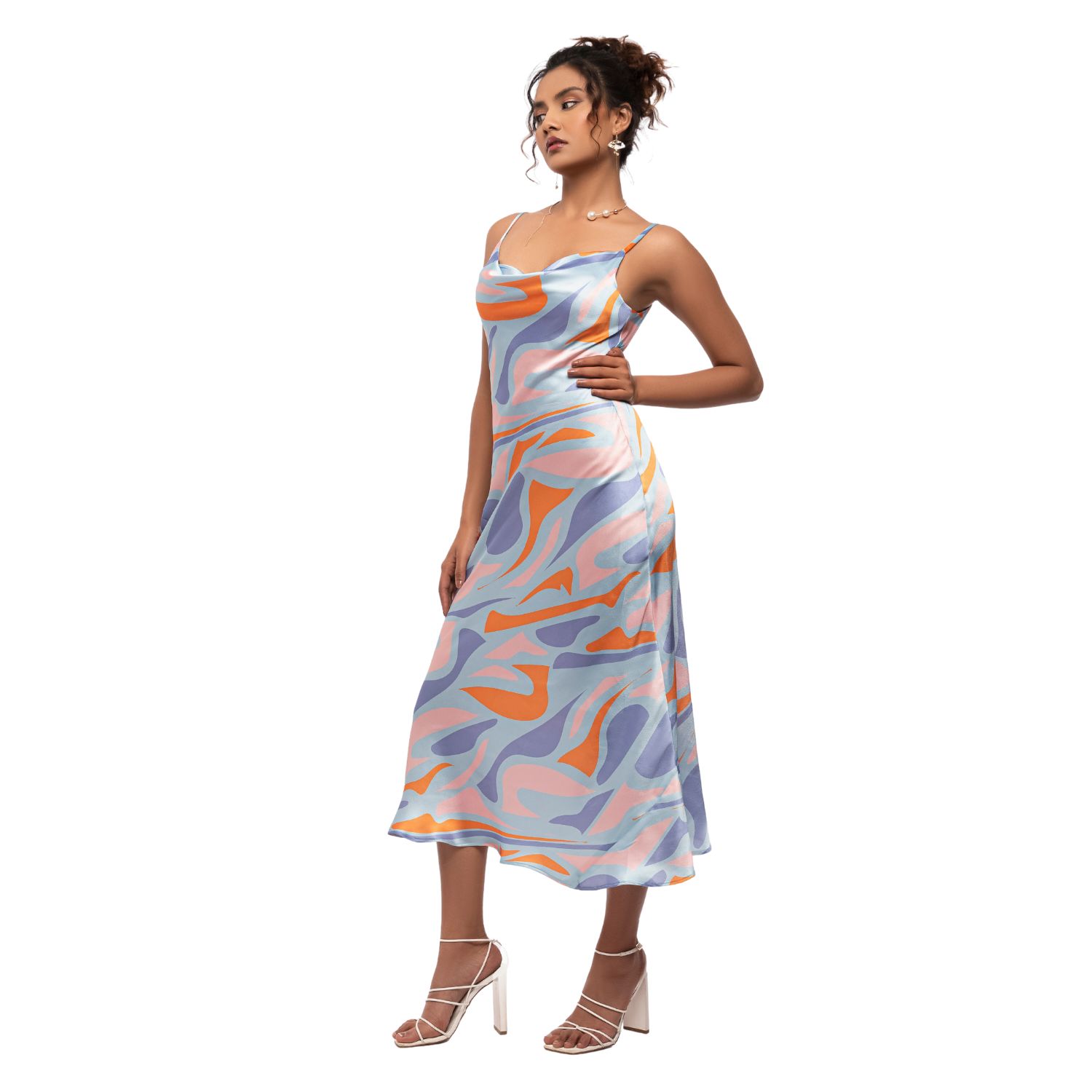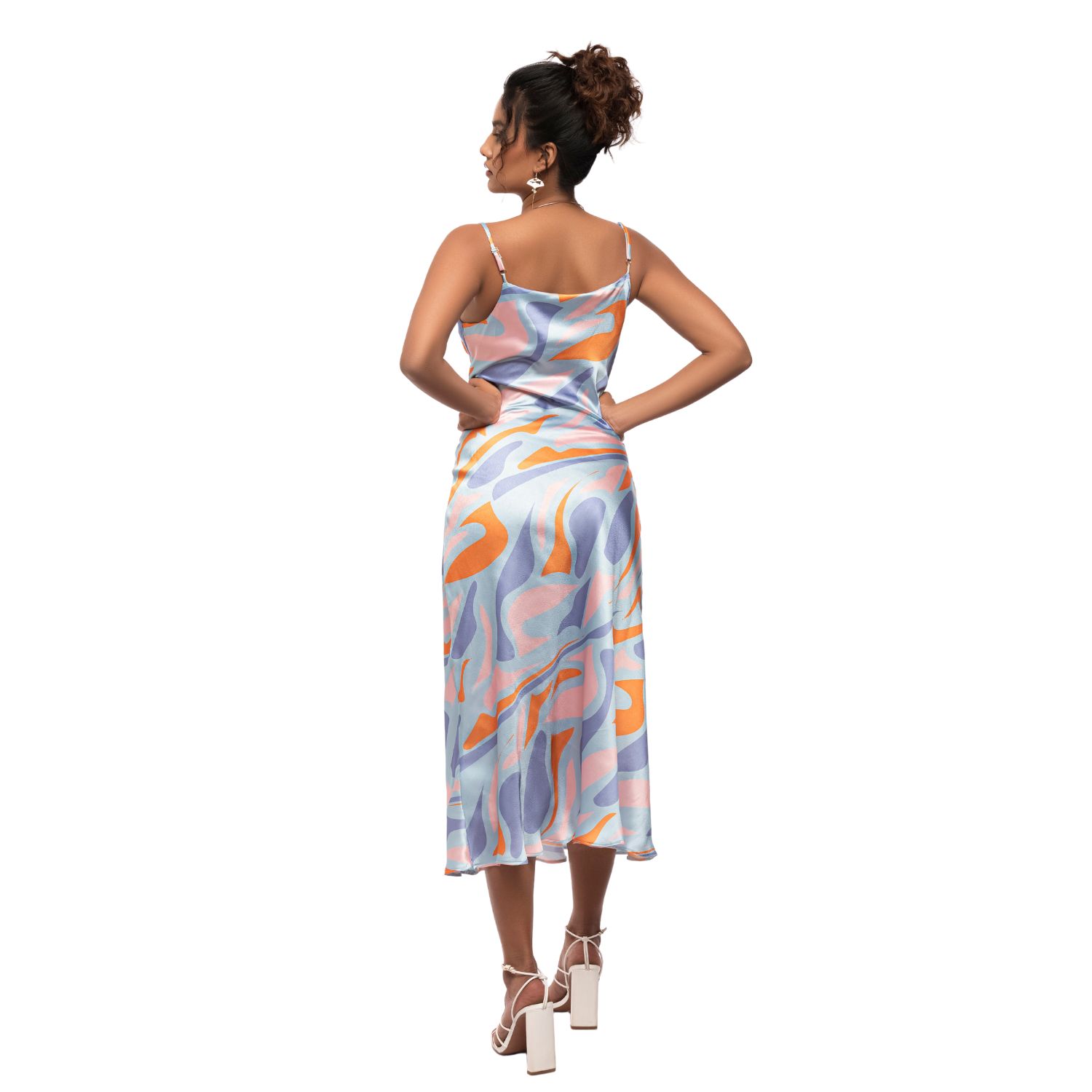 Step up your fashion game with our stunning bias-slip dress in a colourful abstract print. With an adjustable noodle strap, ballerina length, and a bias cut for a chic and flattering fit, this dress is perfect for a casual brunch or a night out.