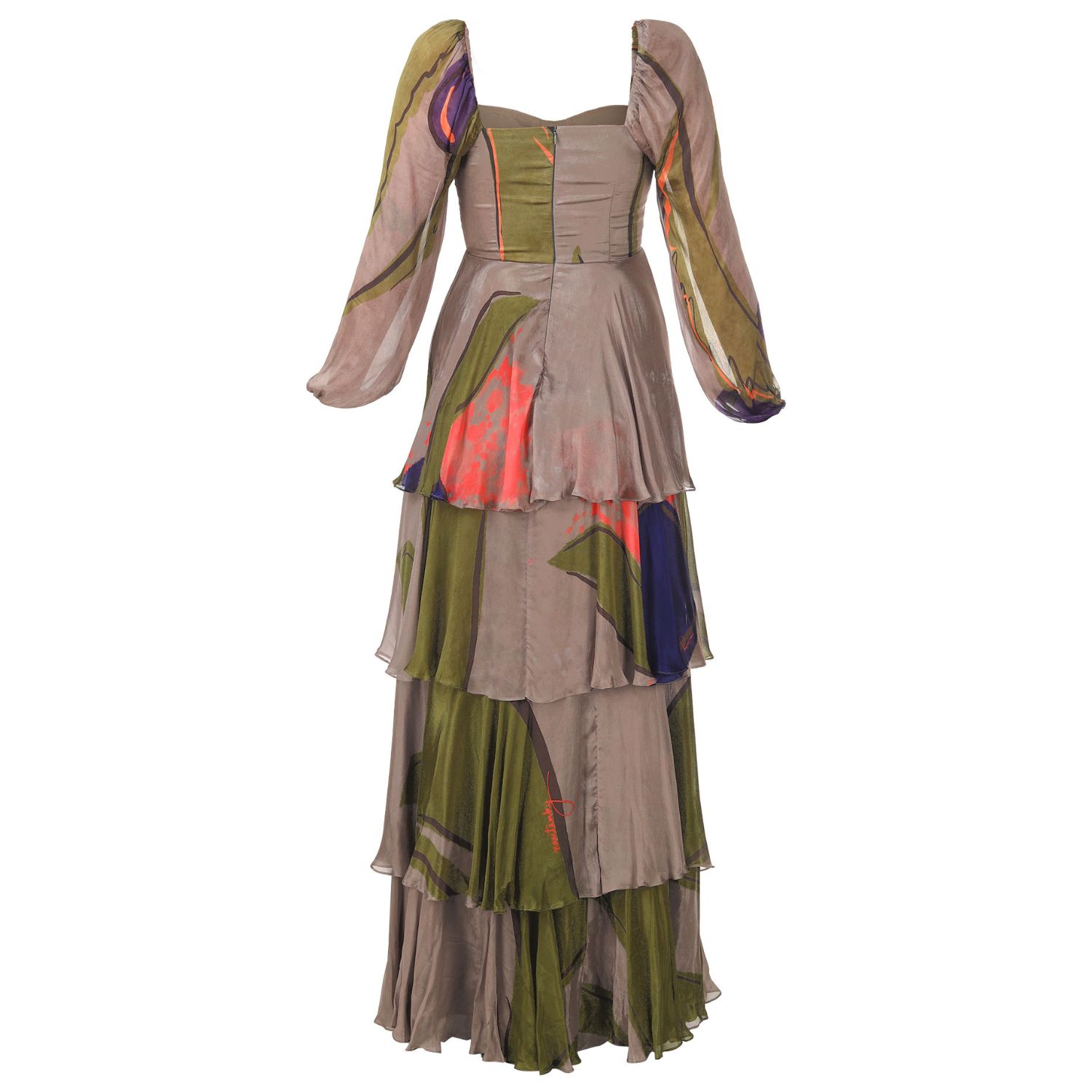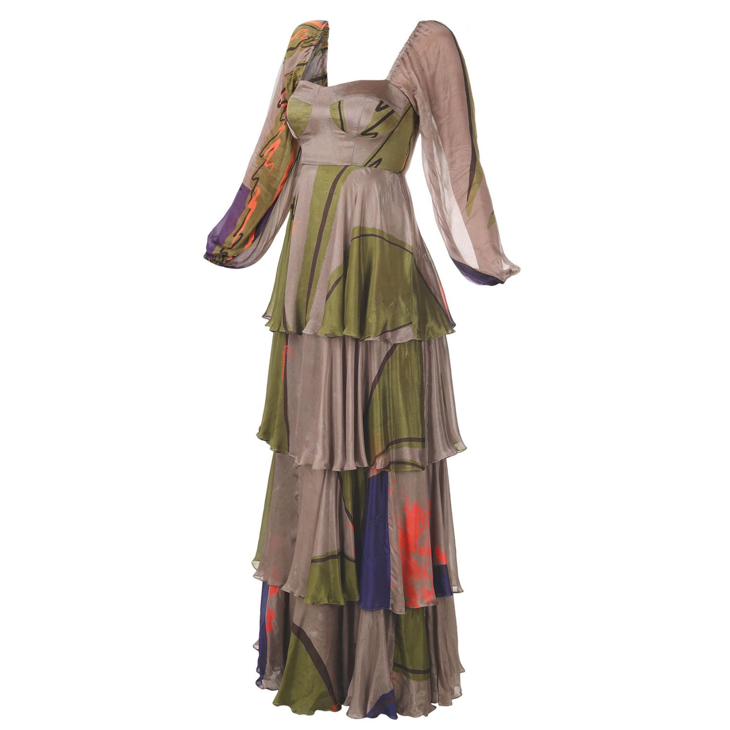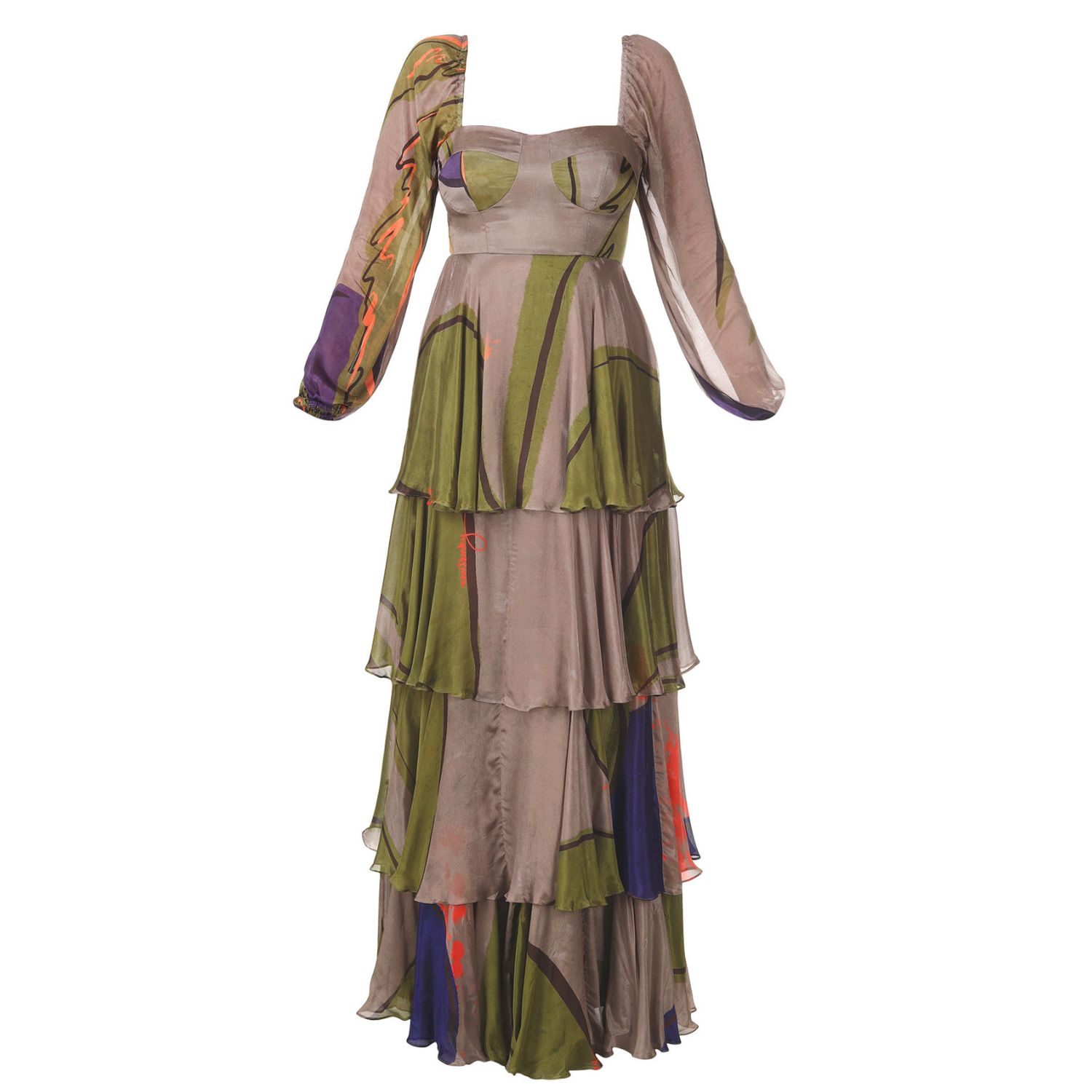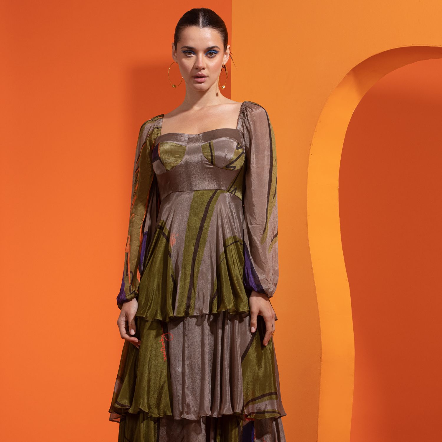 Experience the perfect blend of comfort and style with our four tiered artistic printed chiffon dress. The combination of olive, purple and dusty grey colors creates a captivating effect that complements your grace.