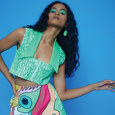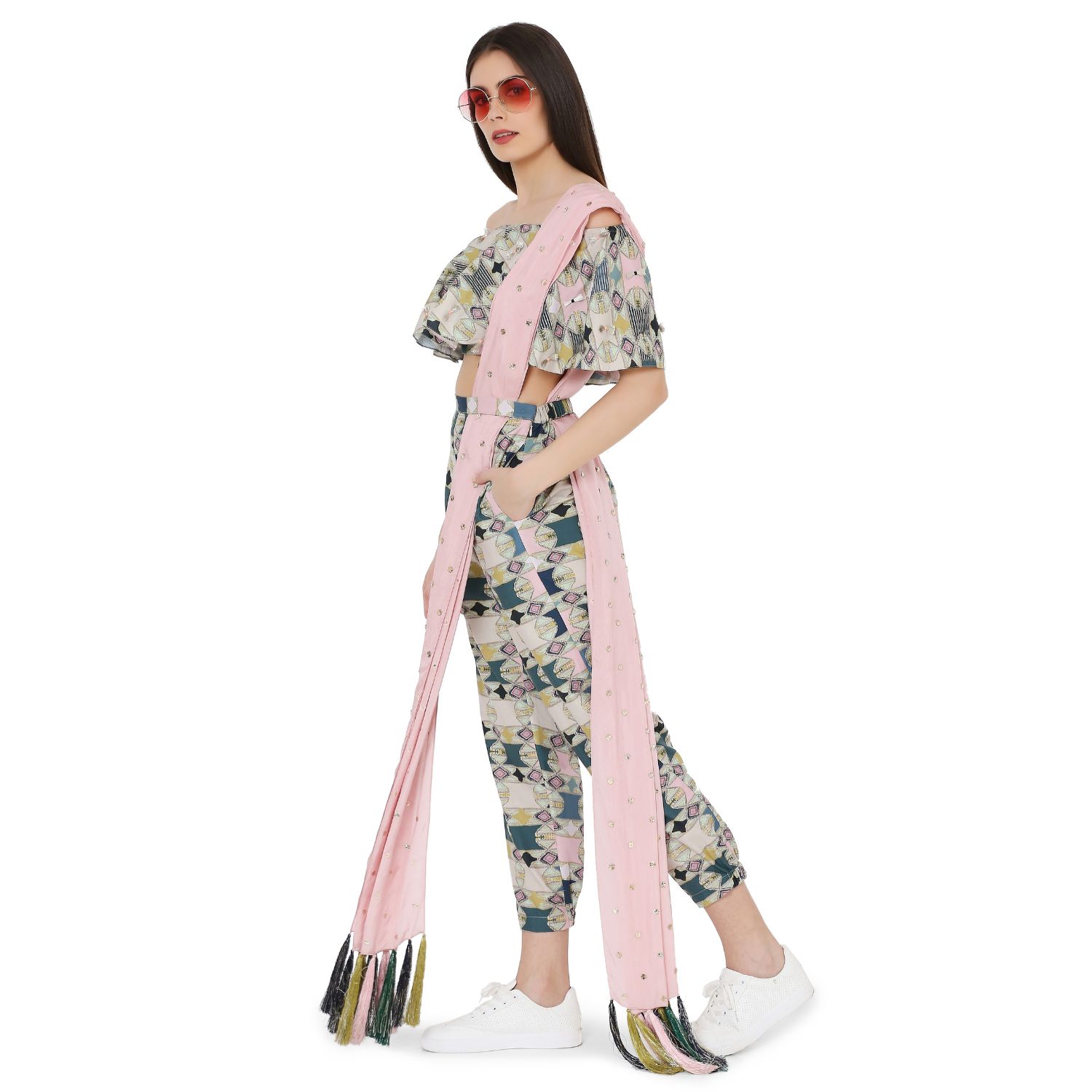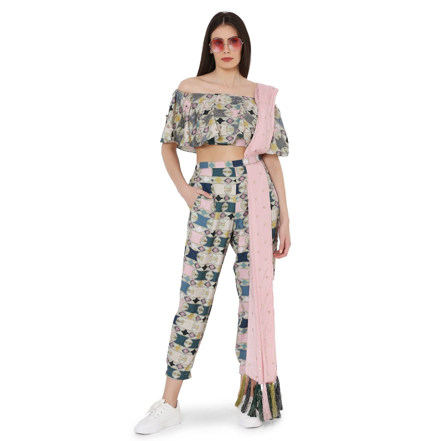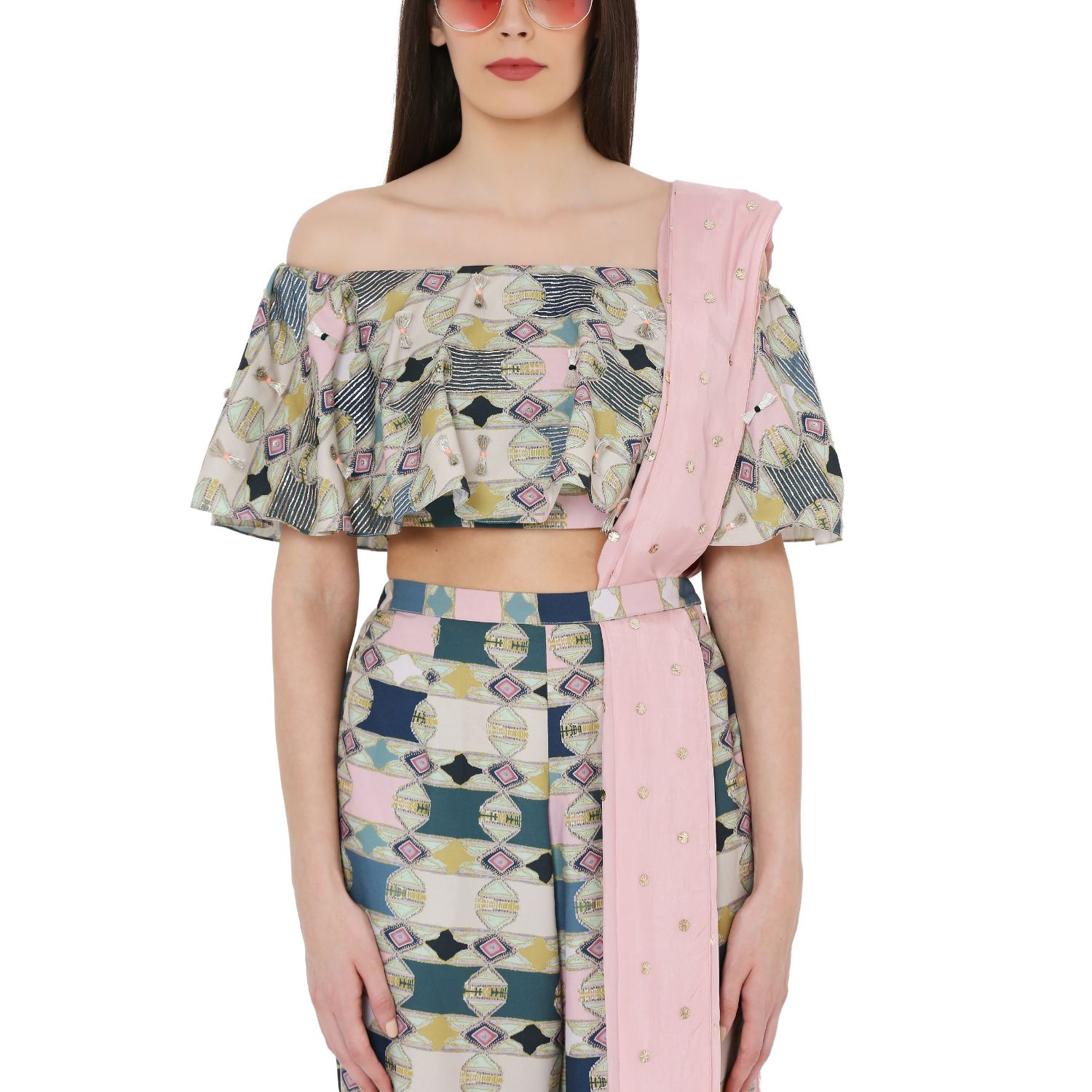 This stylish aztec print top is cut in an embroidered cotton rayon fabric. It features off-shoulder detailing and is paired with comfortable jogger pants and a stunning mukaish habutai silk dupatta with tassel details. Style this eclectic look with statement earrings for a dressy daytime event.
